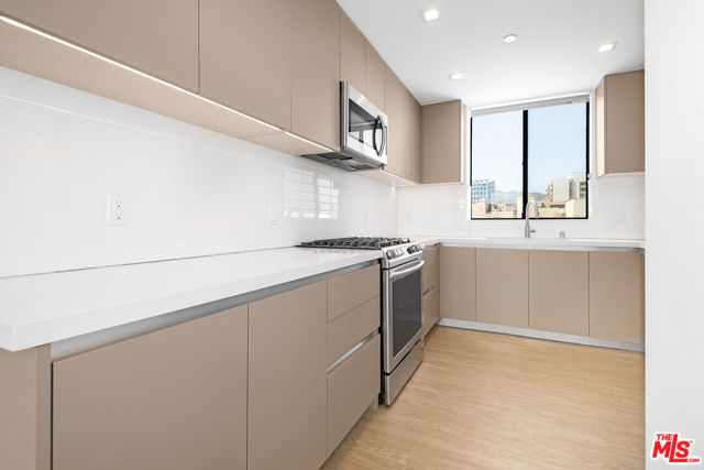 Modern penthouse residence in a fantastic location near Beverly Hills, Cedars Sinai, and Beverly Center. This breathtaking 1 bed with flex space (den, office, or convertible bedroom) 2 bath top floor unit with exceptional views throughout has a kitchen with stainless steel appliances, quartz countertops with subway tile backsplashes, and custom cabinetry. The living and dining area open to a view terrace, while the master suite features a walk-in closet, view terrace, Subway tiled glass-enclosed shower, dual vanity sink with quartz countertops, and backlit mirror. Other features include an in-unit washer/dryer, gated parking, and community rooftop terrace.