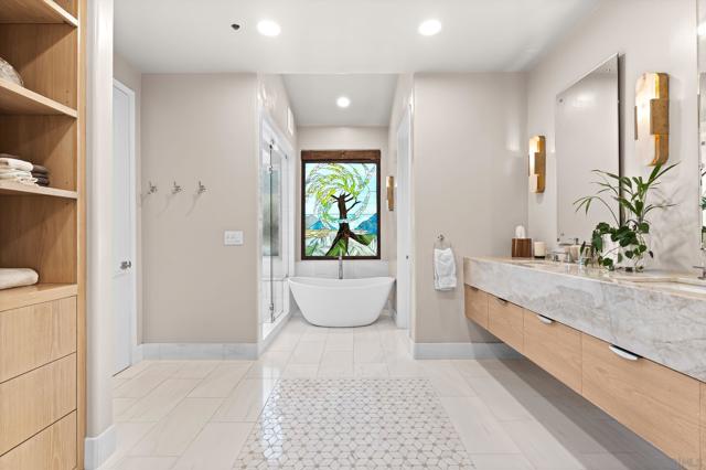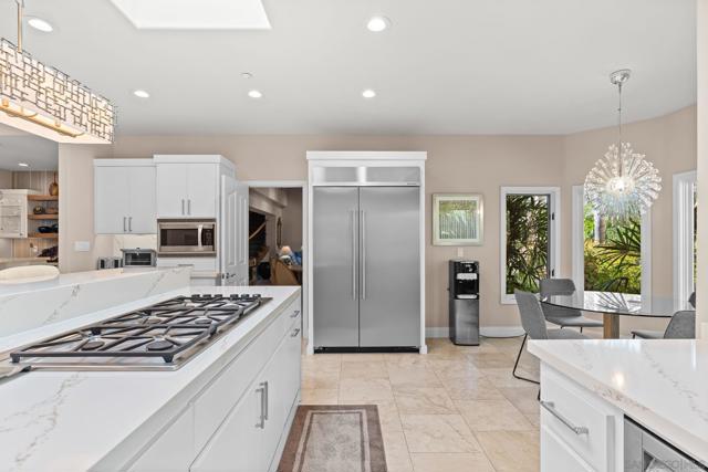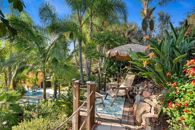Step into a private hillside retreat where design, nature, and serenity come together in a truly one-of-a-kind estate. Tucked away on a quiet cul-de-sac in Olivenhain Hills, this residence offers exceptional privacy while remaining just minutes from top-rated schools, shopping, and the best of Encinitas and Rancho Santa Fe. Behind custom redwood gates, the property unfolds into eight beautifully designed gardens with curated landscaping from around the world, creating a resort-like, tropical atmosphere. Sweeping coastline views and a tranquil setting blend the relaxed elegance of Hawaii with refined Southern California living. The fully usable grounds feature bamboo groves, lush plantings, a park-like setting, and a fruit orchard all designed for beauty and low maintenance. The home lives primarily as a single level, offering five en-suite bedrooms, including a spacious primary suite on the main floor. An optional junior primary suite upstairs, along with a private movie theater, provides flexibility for guests or multigenerational living. A fully remodeled kitchen anchors expansive living spaces, complemented by a library, office, full bar, and walk-in wine cellar. Indoor-outdoor living shines with multiple fireplaces, a cascading waterfall, and a redesigned saltwater pool, spa, and pool house. Fully paid-off solar, generous parking, and dual access complete this exceptional offering bordering Rancho Santa Fe for ultimate privacy and convenience.