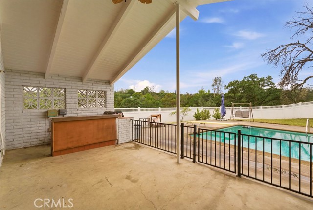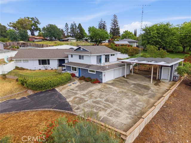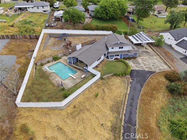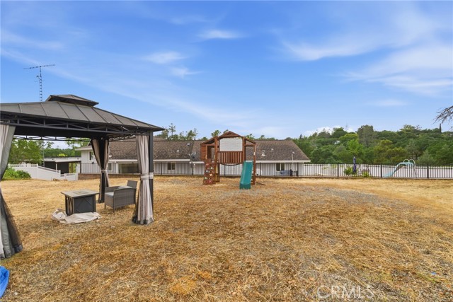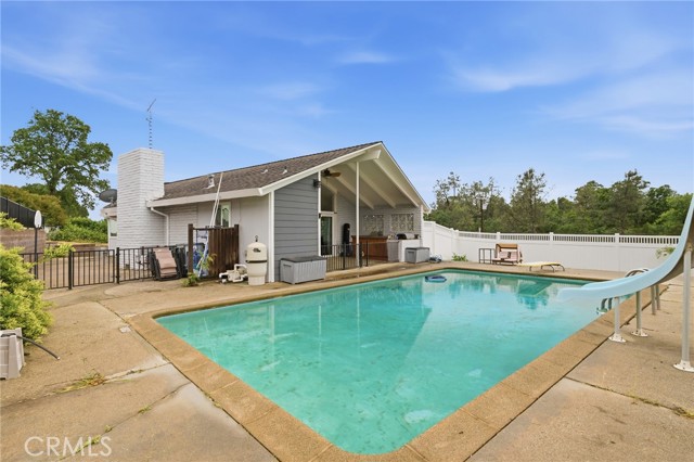 Experience the perfect blend of space, versatility, and resort-style living in this beautifully designed tri-level home, complete with owned solar and an entertainer’s dream backyard. Tucked into a peaceful, private setting yet just minutes from shopping, dining, and the scenic Oroville Lake & Dam, this property offers the ideal balance of seclusion and convenience. Step inside to a light-filled living room featuring soaring cathedral ceilings, a cozy fireplace, and dual sliding glass doors that seamlessly connect indoor and outdoor living. The backyard is truly a showstopper—highlighted by a large in-ground gunite pool with a diving board, slide, and play structure, plus a charming gazebo perched above. A built-in BBQ area and a dedicated poolside bathroom with a tile shower add both comfort and convenience for effortless entertaining. The kitchen is both functional and inviting, offering tile countertops, a breakfast nook, a walk-in pantry, and included stainless steel appliances. Just off the kitchen, a private lower level provides a flexible retreat, featuring the primary suite along with an additional room, perfect for a home office, gym, or nursery. With its own separate entrance, this space is well-suited for multigenerational living or added privacy. This level also includes a spacious laundry/utility room and direct garage access. Upstairs, you’ll find three generously sized bedrooms with ample storage, including one with direct access to a bathroom, ideal for guests or extended family. Additional highlights include a 3-car garage, covered carport with RV access and hookups, and an attached storage unit with a loft for even more functionality. The fully fenced property is enhanced with new vinyl privacy fencing, offering both security and peace of mind. Whether you're hosting gatherings, enjoying sunny pool days, or unwinding under the stars, this property is designed for easy, everyday living with room to enjoy it all.