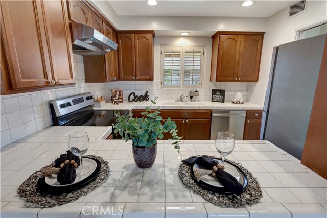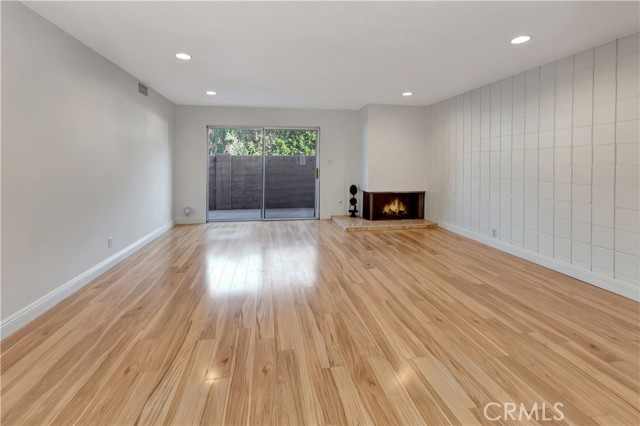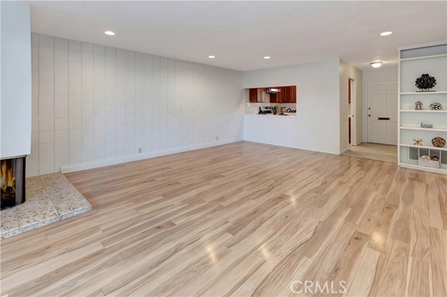 Step into this inviting single-story home featuring gleaming wood floors and a warm, welcoming living room centered around a cozy fireplace, perfect for cooler days. The owner will install a brand-new sliding doors, enhancing the abundant natural light and providing easy access to the private patio. The kitchen features white countertops with stainless steel appliances, including an electric range, dishwasher, and refrigerator. It also offers an open area ideal for casual dining with space for bar stools. Both bedrooms are spacious and bright. The primary suite features a private en-suite bathroom and mirrored wardrobe doors, and the second bedroom will also have a newly installed mirrored closet doors that make up an entire wall. The home includes a private, full-size indoor laundry area for your personal use only, equipped with a full-sized washing machine and dryer, along with built-in shelving for added storage. Just beside the private laundry nook is a guest closet, for still more storage and organization needs. The hallway leads to the secondary full bathroom, which features a bathtub/shower and a double-sink vanity. There is also a massive linen closet along the length of the entire hallway with additional enclosed storage for added convenience. A Ring brand doorbell with video is already installed and ready to connect to your devices. Another special feature of this home is that there is no one above or below you, offering the privacy and comfort of a single-story unit. Fresh paint on all walls and even the ceilings throughout the unit gives the home a clean updated feel. Step outside through the sliding doors to enjoy your private patio, ideal for relaxing or entertaining. The home also features a newer central air conditioning and heating system, including a larger unit than is typically found in the community, providing enhanced comfort and more effective cooling on demand. There are two parking spaces available, one assigned and exclusive carport space and one open space, and the community offers a beautifully maintained pool for residents to enjoy. Walking distance to shopping, grocery stores, restaurants, banks, and a variety of stores.