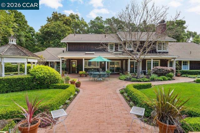Cross the creek to this timeless brown shingle and brick home, built in 1995 and nestled beneath towering trees along a picturesque setting. Set on nearly two private acres, 2255 Alameda Diablo offers a rare blend of tranquility, space, and versatility. The home features a desirable floor plan with an easy flow for both everyday living and entertaining. The elegant living room is complemented by a billiards room with a walk-behind bar, while a wall of windows showcases views of the lush grounds. The chef’s kitchen offers abundant storage, a center island, and a sunny dining nook, and opens to a cozy family room with fireplace overlooking the yard. A dedicated office or optional fifth bedroom with built-ins and a nearby powder bath completes the main level. The primary suite opens to the backyard and includes a spacious bath and dual closets. Upstairs, generously sized secondary bedrooms include one en-suite and two additional bedrooms sharing a bath. Surrounded by nature yet close to all that Diablo offers, this private retreat is ideal for modern living and entertaining. Start living the Diablo lifestyle.