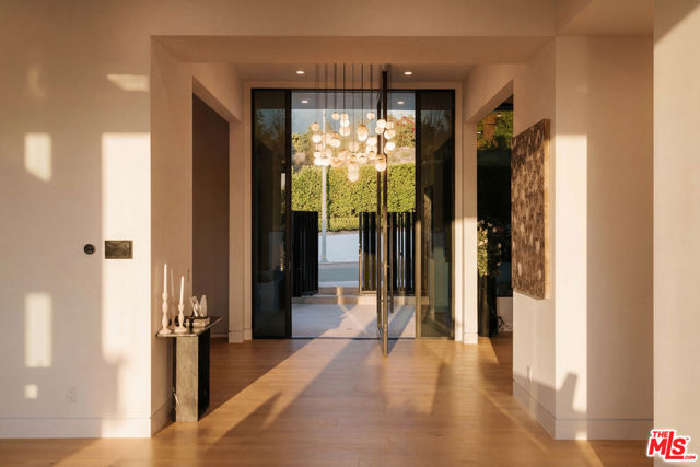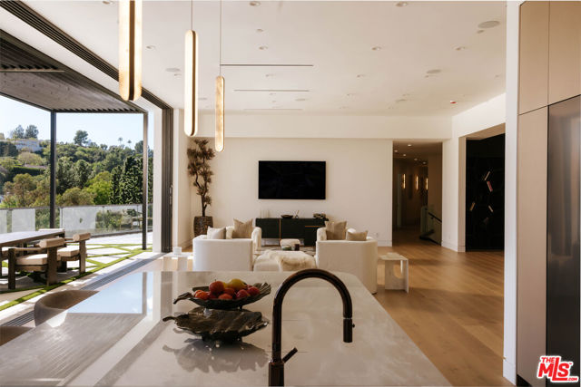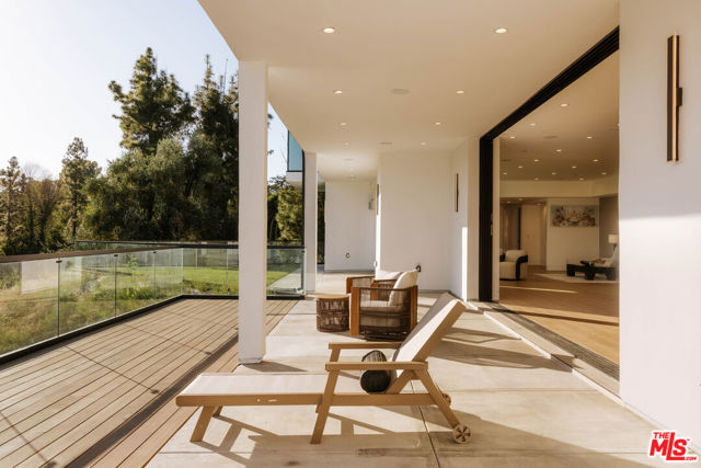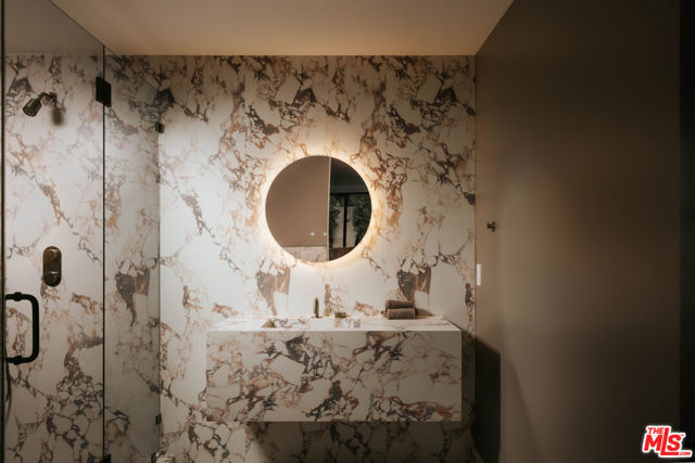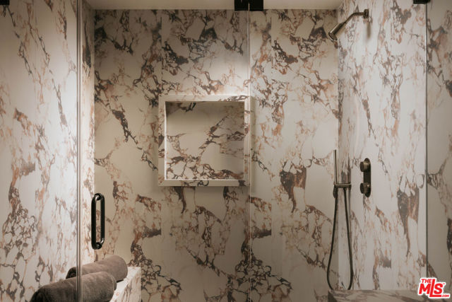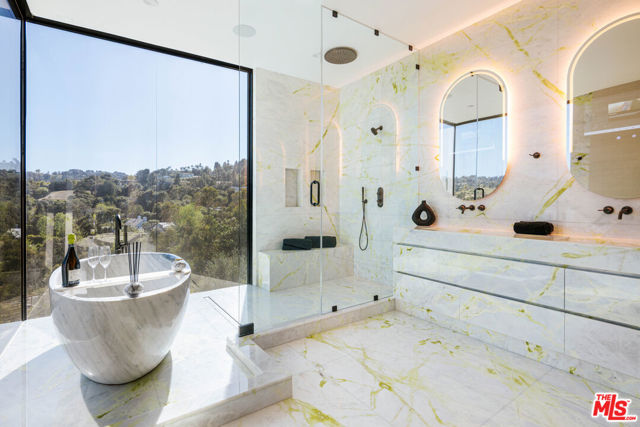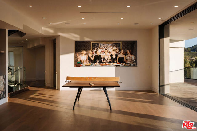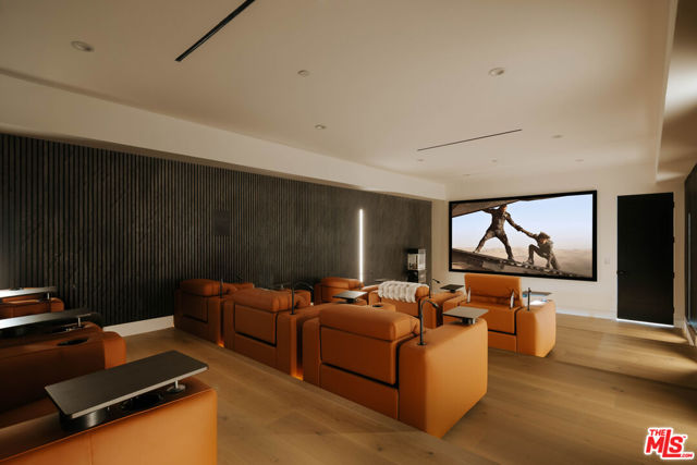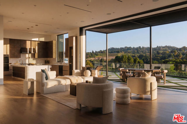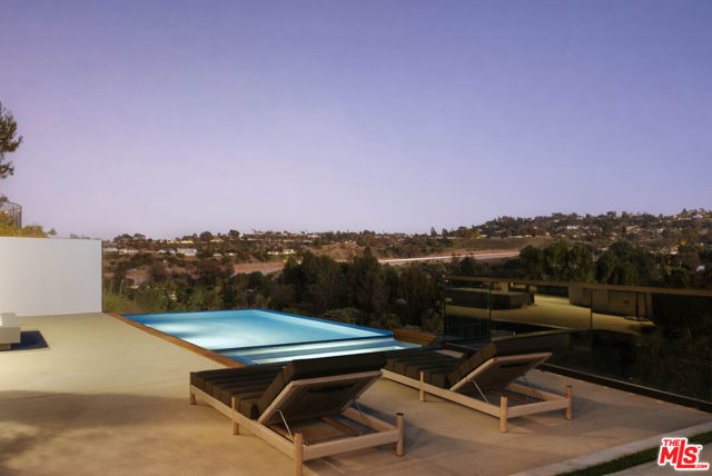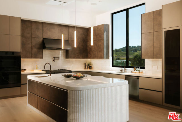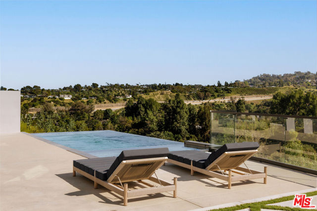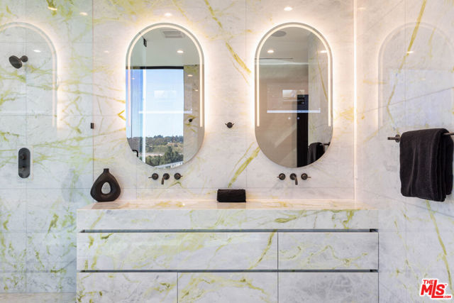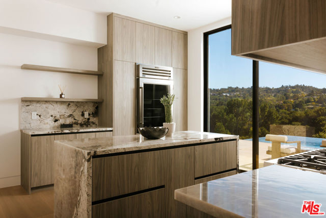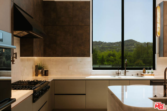 Welcome to a truly exceptional estate in the prestigious Royal Oaks enclave of Encino, where elevated design, breathtaking views, and modern luxury come together seamlessly. Meticulously curated materials and finishes are showcased throughout this five bedroom plus an office, nine bathroom residence. Upon entry, soaring ceilings, expansive walls of glass, and a light-filled open layout create a seamless connection to the surrounding landscape. A striking titanium gold staircase with an integrated water feature serves as a sculptural centerpiece, setting the tone for the level of design and detail carried throughout. The formal dining room is complemented by a temperature-controlled wine cellar, while a nearby powder room is finished in Brazilian green marble, adding a refined touch. The culinary experience is elevated through a dual-kitchen concept. The main kitchen showcases a fluted natural stone island and white onyx countertops paired with custom German cabinetry, finished with aluminum and leather accents. A secondary kitchen provides additional functionality, ideal for both everyday living and entertaining. The primary suite serves as a private sanctuary, capturing stunning views and offering a spa-inspired bathroom with bookmatched stone. Designed for both wellness and entertainment, the home features an indoor sports court ideal for racquetball or basketball, a game room, and a fully equipped fitness area with a red light sauna and cold plunge. A private theater and expansive entertainment level with a custom bar finished in agate blue stone create the perfect setting for hosting, seamlessly opening to outdoor living spaces. The outdoor setting features an infinity edge pool, and a rooftop deck, all designed to enhance the overall sense of luxury and relaxation. This new construction estate offers a rare combination of scale, design, and lifestyle in one of Encino's most sought-after neighborhoods.Additional features include a five car garage with high ceilings, elevator, and Control4 smart home automation system.This is a rare opportunity to own a statement property where design, views, and lifestyle converge at the highest level.