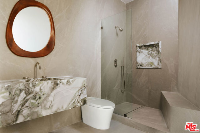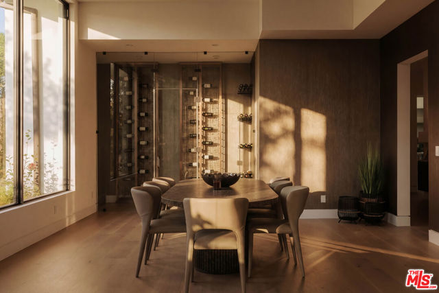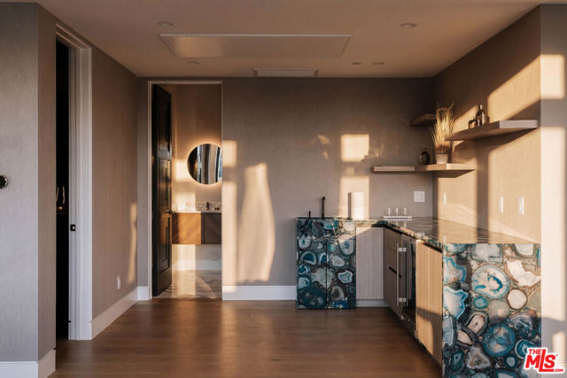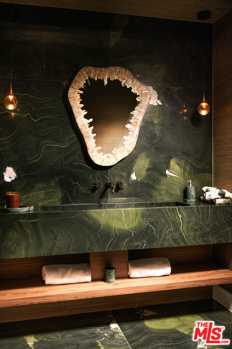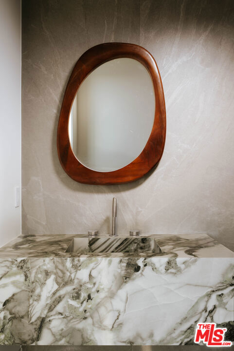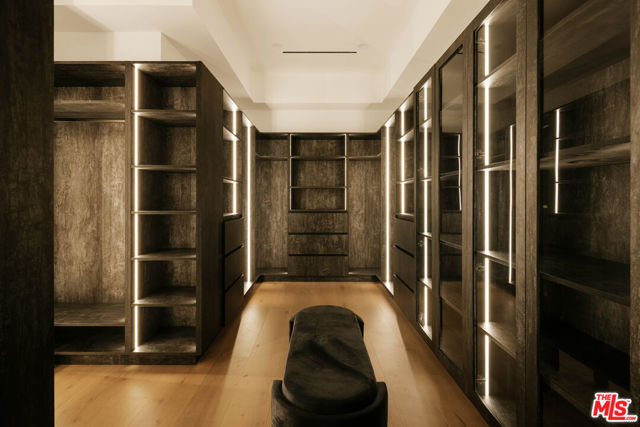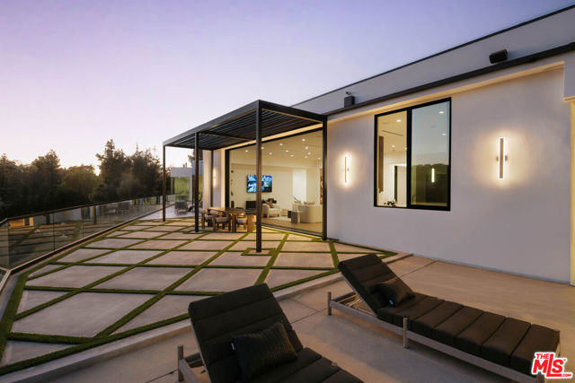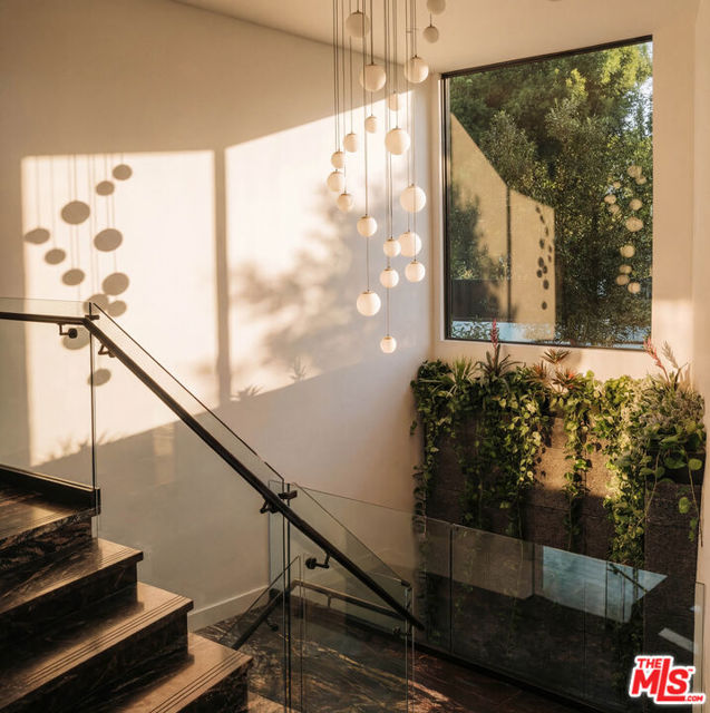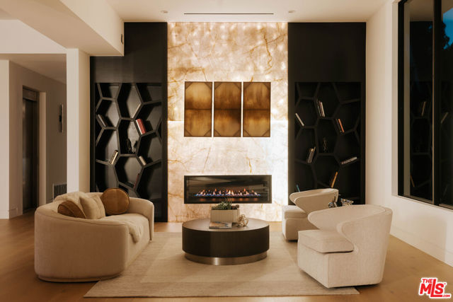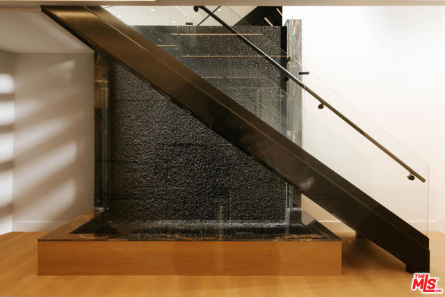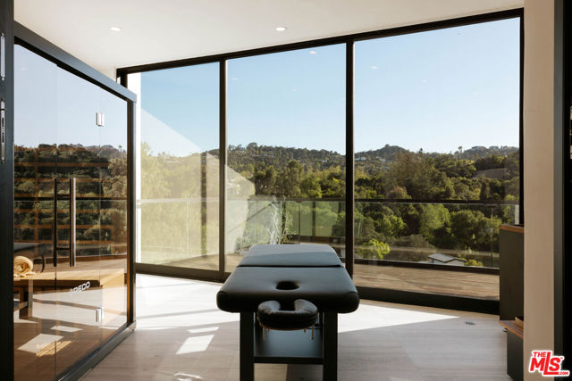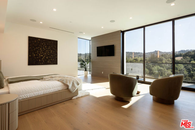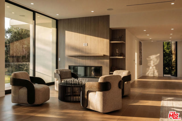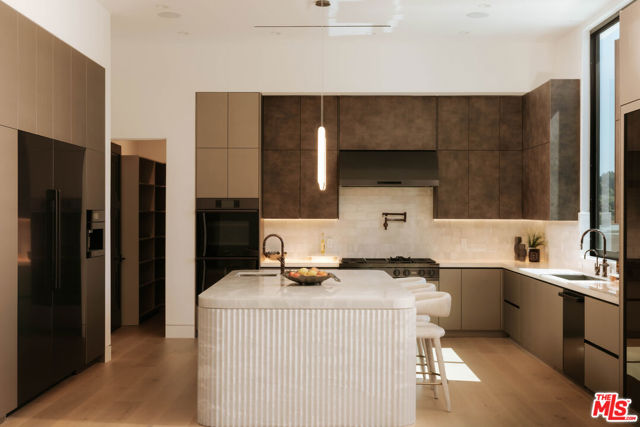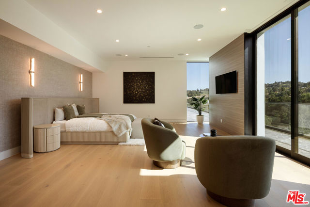 Welcome to a truly exceptional estate in the prestigious Royal Oaks enclave of Encino, where elevated design, breathtaking views, and modern luxury come together seamlessly. Meticulously curated materials and finishes are showcased throughout this five bedroom plus an office, nine bathroom residence. Upon entry, soaring ceilings, expansive walls of glass, and a light-filled open layout create a seamless connection to the surrounding landscape. A striking titanium gold staircase with an integrated water feature serves as a sculptural centerpiece, setting the tone for the level of design and detail carried throughout. The formal dining room is complemented by a temperature-controlled wine cellar, while a nearby powder room is finished in Brazilian green marble, adding a refined touch. The culinary experience is elevated through a dual-kitchen concept. The main kitchen showcases a fluted natural stone island and white onyx countertops paired with custom German cabinetry, finished with aluminum and leather accents. A secondary kitchen provides additional functionality, ideal for both everyday living and entertaining. The primary suite serves as a private sanctuary, capturing stunning views and offering a spa-inspired bathroom with bookmatched stone. Designed for both wellness and entertainment, the home features an indoor sports court ideal for racquetball or basketball, a game room, and a fully equipped fitness area with a red light sauna and cold plunge. A private theater and expansive entertainment level with a custom bar finished in agate blue stone create the perfect setting for hosting, seamlessly opening to outdoor living spaces. The outdoor setting features an infinity edge pool, and a rooftop deck, all designed to enhance the overall sense of luxury and relaxation. This new construction estate offers a rare combination of scale, design, and lifestyle in one of Encino's most sought-after neighborhoods.Additional features include a five car garage with high ceilings, elevator, and Control4 smart home automation system.This is a rare opportunity to own a statement property where design, views, and lifestyle converge at the highest level.