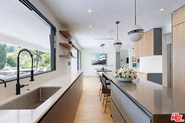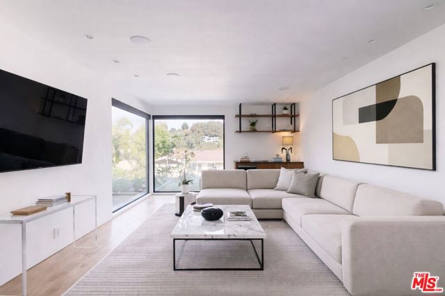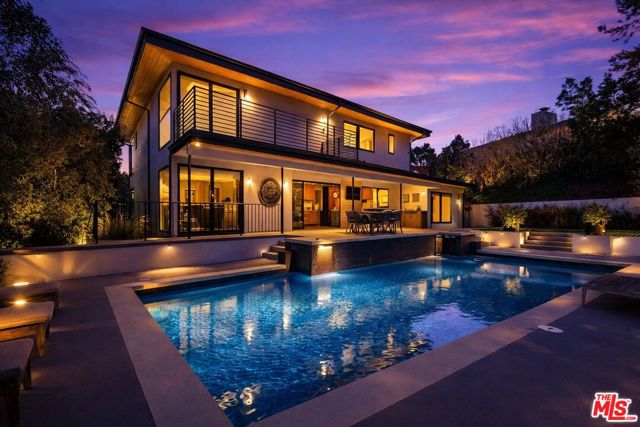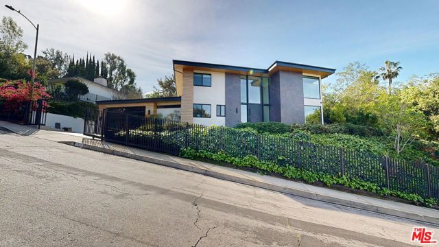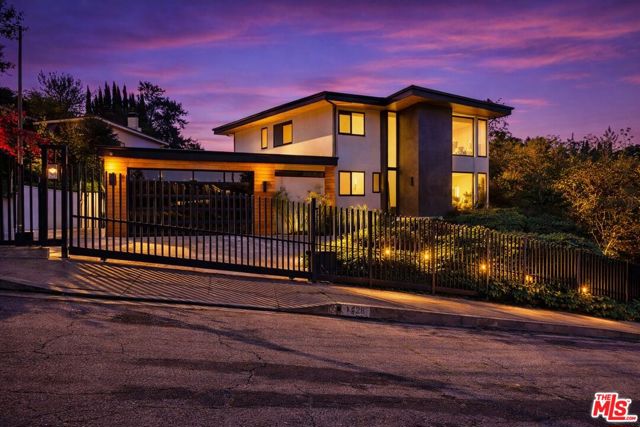 Perched atop a knoll on one of the most sought-after streets in the Donas, one of Studio City's most prestigious neighborhoods, this newly renovated contemporary residence captures sweeping panoramic views across the Mulholland Corridor from nearly every room, seamlessly blending timeless Mid-Century design with elevated modern finishes across approximately 3,900 square feet of gated, private living space. A striking entry opens to soaring ceilings and walls of glass that flood the interiors with natural light, flowing effortlessly into expansive living areas including a refined formal living room, a warm and inviting family room with bar and fireplace, and an elegant dining room set just off the sleek, designer kitchen outfitted with high-end appliances. A dramatic glass-filled atrium with approximately 30-foot ceilings serves as a stunning architectural centerpiece, enhancing the home's sense of scale and openness. The main level also offers a versatile en-suite bedroom, ideal for guests, a home office, or staff quarters. Upstairs, the spacious primary suite is a true retreat, featuring dual walk-in closets, a spa-inspired bath with refined finishes, a private balcony, and a sitting area with breathtaking views, while additional bedrooms are generously sized and appointed with en-suite baths and custom-fitted closets. Designed for seamless indoor-outdoor living, retractable windows and Fleetwood sliding doors open to an expansive entertainer's yard with a large terrace for al fresco dining, a sparkling pool, cabana, and built-in barbecue. Ideally located just moments from the Westside, Ventura Boulevard's shops and restaurants, and the scenic hiking trails of Fryman Canyon, and situated within the highly regarded Carpenter Charter School district, this exceptional offering presents a rare opportunity to own a beautifully reimagined home that effortlessly balances architectural character with modern luxury.