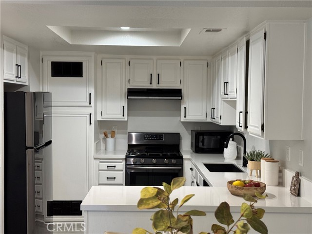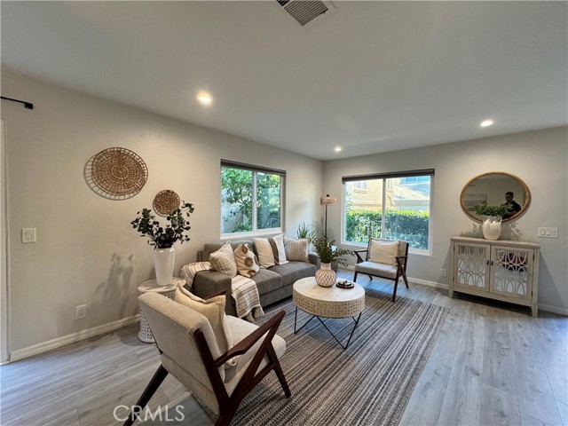 This move-in-ready condo in Vista Del Flores community in Lake Forest blends generous interior proportions with high-end functional improvements. From the new sliding doors that flood the home with natural light to the convenience of direct-access parking. The home has been refreshed to provide a clean, contemporary feel. New flooring runs throughout, complemented by fresh interior paint and new vinyl windows that enhance energy efficiency. The kitchen and bathrooms feature sleek quartz countertops and modernized vanities, while recessed lights and ceiling fans ensure a bright, comfortable atmosphere in every room. Main floor is designed for open living and is anchored by a cozy fireplace. The kitchen features abundant cabinet storage and walk in pantry. A convenient powder room is also located on this level. All three bedrooms and 2 bathrooms are situated on the second floor. For added convenience, washer/dryer are located on the second level. The oversized two car garage offers convenient access, while the patio area provides an ideal space for outdoor relaxation and morning coffee.
