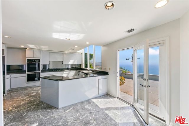 A rare find on Coastline Drive, this expansive single-story home offers front-row ocean views near the Palisades-Malibu border. The airy living room features a built-in bar, cozy fireplace, and glass doors that seamlessly connect to the outdoor spaces, perfect for entertaining. The sunlit kitchen boasts panoramic ocean vistas, while the primary suite offers sunrise views, dual walk-in closets, and a luxurious en-suite bath. A versatile media room can easily double as a fourth bedroom. Built in 1990, the home's modern design stands out in a neighborhood of mostly 1960s builds. The spacious backyard patio is ideal for lounging and dining, complete with a built-in BBQ and multiple seating areas. With an oversized two-car garage and close proximity to Palisades, Malibu, and the Getty Villa, this home epitomizes coastal living at its finest.