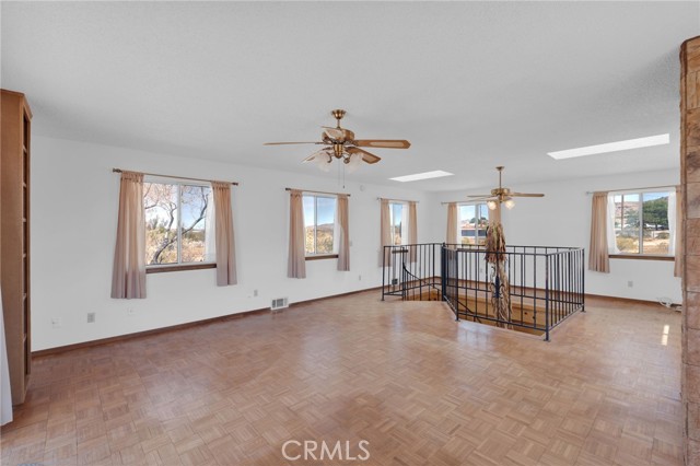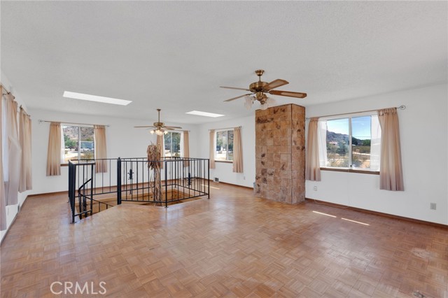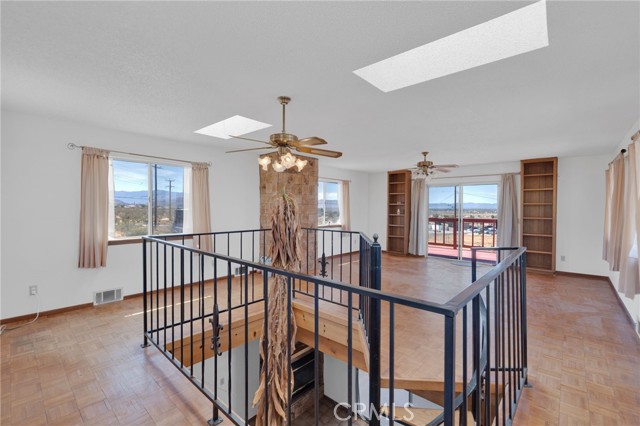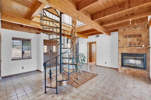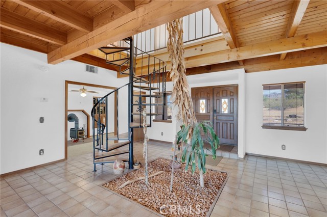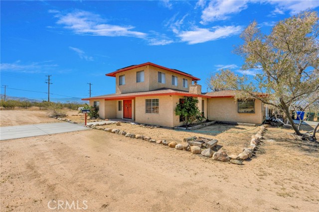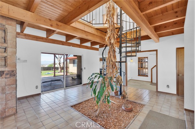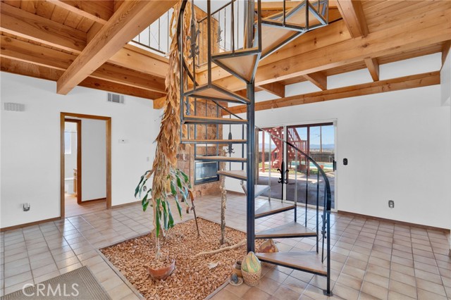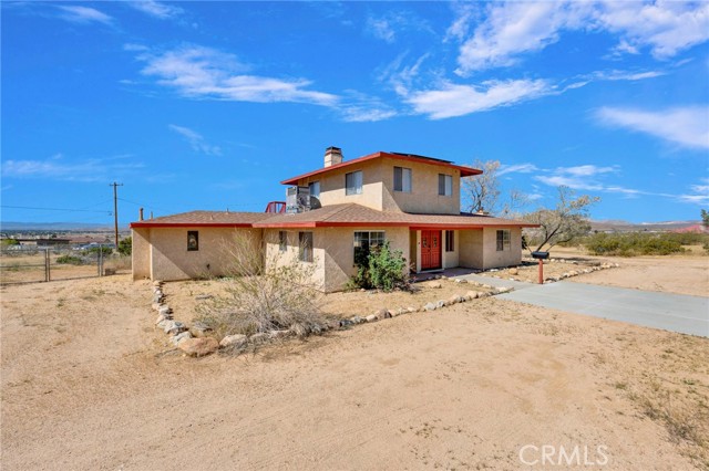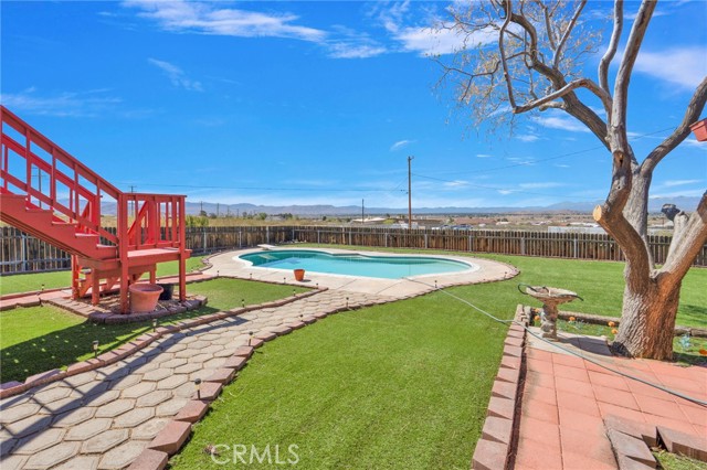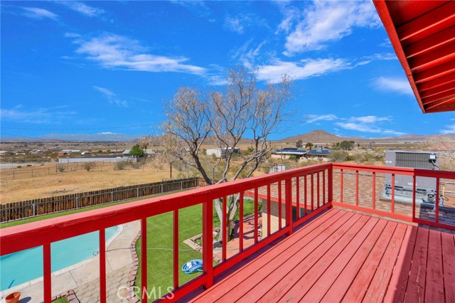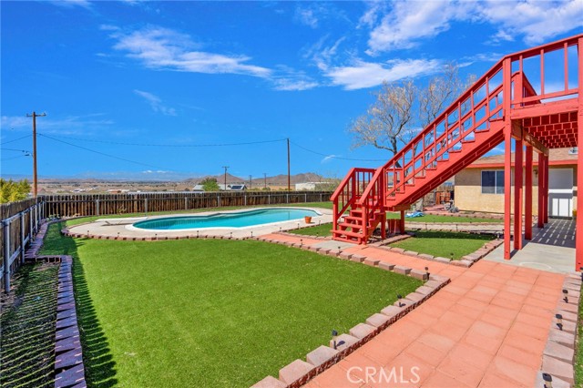Set on 2 acres in Apple Valley mid-century modern-inspired home blends style, function, and desert living. The 2,010 sq ft residence includes 2 bedrooms, 2.5 bathrooms, and a flexible third room that can serve as an additional bedroom, home office, media space, gym, guest room, or creative studio. Inside, a spiral staircase adds a striking architectural touch, and windows filling the home with natural light while offering peaceful desert and mountain views. Step outside to a private balcony or a backyard oasis with an in-ground pool, perfect for relaxing, entertaining, or enjoying the High Desert sun. Additional highlights include a 2-car garage with a large driveway and fully paid solar, combining convenience and energy efficiency. Located in a quiet neighborhood, this home offers architectural charm, versatile living spaces, and private desert tranquility.