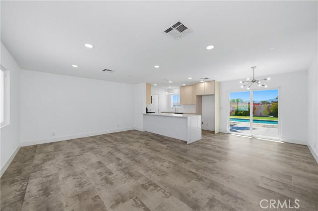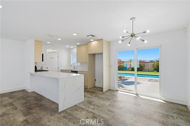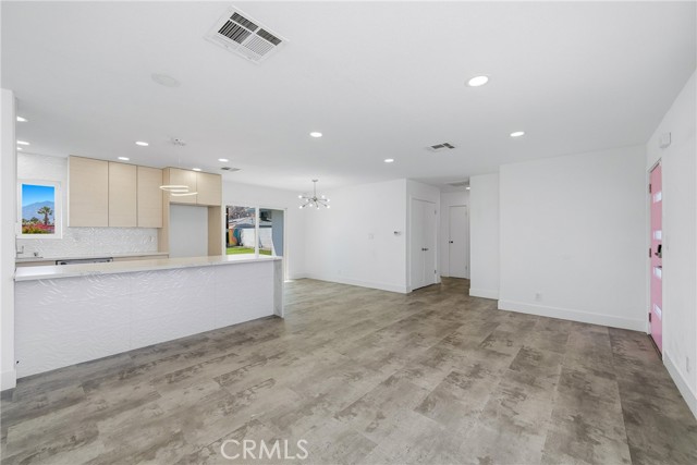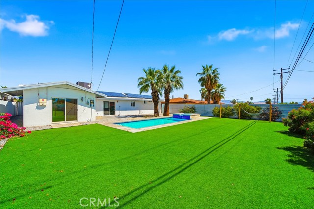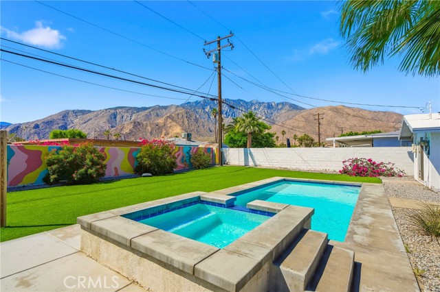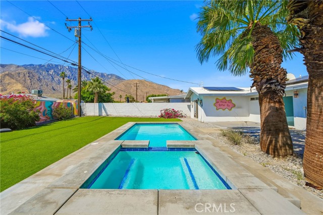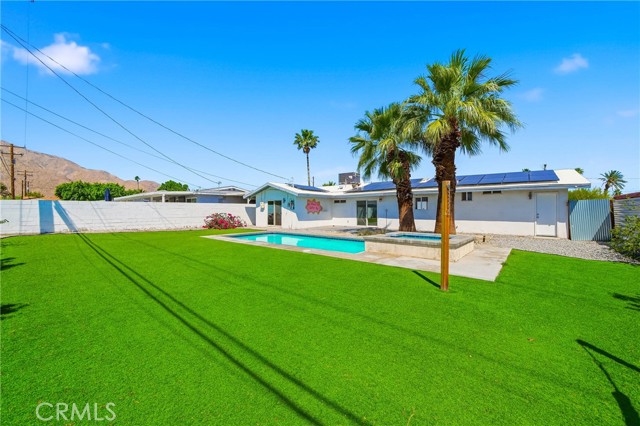 Charming 3 bed, 2 bath North Palm Springs retreat with sweeping mountain and desert views. Single-level layout opens to a private entertainer’s oasis featuring a sparkling rectangular pool with attached raised spa, palm-lined patio, and expansive yard finished with lush artificial turf — perfect for games, gatherings, or relaxing poolside. Sliding glass doors connect indoor living to the outdoor space, and a white block wall provides privacy while framing the mountain backdrop. Practical highlights include leased solar panels on the roof for reduced energy costs, a gravel side yard for easy upkeep, and ample outdoor hardscape for seating and dining. Located minutes from hiking, golf and downtown Palm Springs. Schedule a showing to experience the outdoor lifestyle and panoramic views in person.