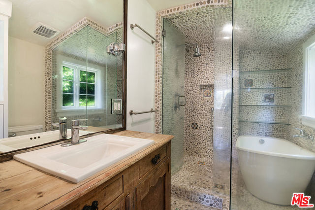 Prime Santa Monica, North of Montana and just East of 7th Street. Classic 1925 Spanish Revival style in a private, secure, and serene setting. Beautiful architectural details abound including a hand-carved wood entry door, exposed wood beams, soaring ceilings, and graceful arched passageways all bathed in natural light. The indoor/outdoor flow of the home takes advantage of the beautiful Santa Monica year-round weather and provides a great ambiance for living and entertaining. One of the downstairs bedrooms has a separate entrance offering flexibility for guests or a home office. Home is set way back from San Vicente behind lush, mature hedges and offers exceptional privacy in a prime location. The detached garage has its own full bath making conversion to an ADU that much easier. Easy stroll to the beach and Montana Avenue and a short drive to the Third Street Promenade, Santa Monica Pier, Brentwood Country Mart, and the best of Southern California lifestyle.