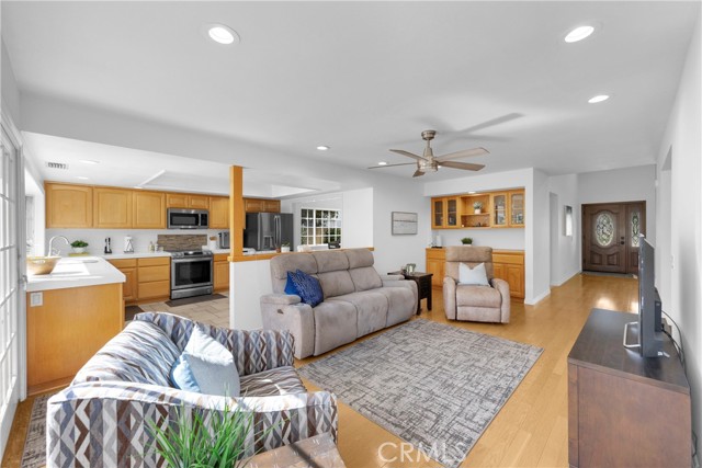 Welcome to 9326 Cambridge Street, a “Turnkey” Highly Upgraded Executive Home in the heart of Cypress with a rare Community Pool and Park. This beautifully appointed home offers standout curb appeal with its 3 story high, dimensional roof, attractive hardscape and artificial turf. This spacious and popular floorplan opens with soaring vaulted ceilings, an impressive balcony, and a spacious living room with a distinctive floor to ceiling fireplace and wall to wall raised hearth. The light “real” hardwood flooring flows through the family room to the backyard and expansive kitchen where large windows and sliding doors create the open, connected feel buyers love. The kitchen features light “real” hardwood cabinets and pantry, quartz countertops, stainless steel appliances, and a large breakfast bar perfect for everyday living and entertaining. The remodeled formal dining room is now open to the kitchen and has a backyard view. A highly sought after first floor primary suite with remodeled and expanded primary bath adds flexibility, comfort, and convenience. Two additional first floor bedrooms and the fourth bedroom upstairs with a large bonus room that can easily convert to two additional bedrooms if needed. Upstairs, the oversized bonus room is set up as an impressive home theater with surround sound, creating the ultimate space for movies, sports, gaming, or a private media retreat. The private backyard is beautifully finished with a large paver patio, green lawn, and raised planters with auto drip watering, making it ideal for relaxing or entertaining. Huge indoor and outdoor storage areas. Additional standout features include solar on valuable NEM 2, a Tesla Powerwall 3, and an EV charger in the garage (The savings could pay for as much as $80,000 of your new loan). This is a rare move in ready opportunity to own one of Cypress’s most sought after floor plans close to parks, shopping, dining, and everyday conveniences. Walking distance to highly rated Landell elementary, Arnold elementary, Lexington Junior High, and Oxford Academy (junior and senior high school). Easy access to numerous freeways. Virtual tour link: https://my.matterport.com/show/?m=2ub1eKxgAU7 Aerial Video Link: https://youtu.be/WrvtqaRnezM