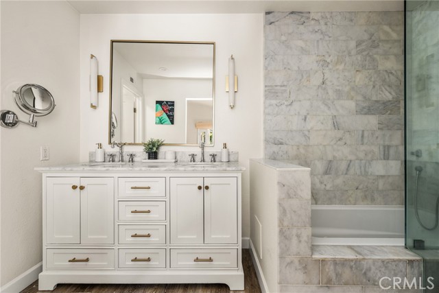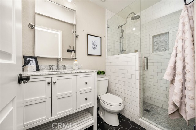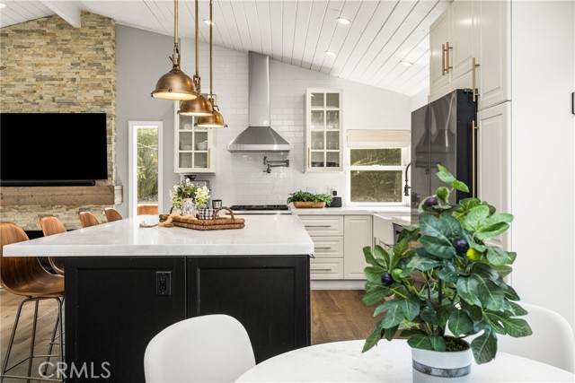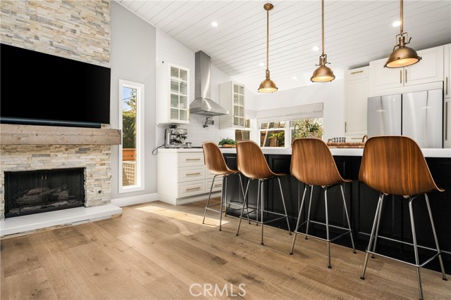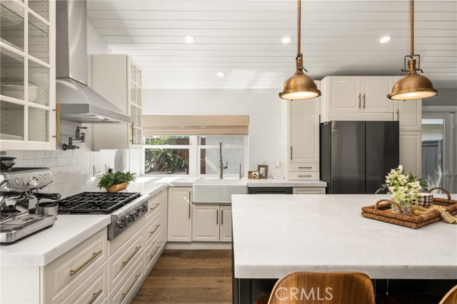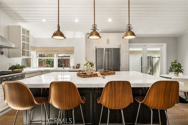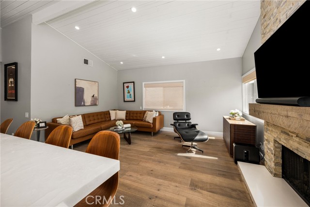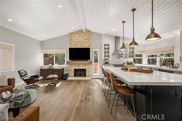 Welcome to 10 Petersburg, a highly upgraded SINGLE-STORY home in Irvine’s Northwood neighborhood offering 3 bedrooms, 2 bathrooms, and approximately 1,370 square feet of well-designed living space. A charming Dutch entry door creates a warm first impression, and the direct-access 2-car garage with driveway adds everyday convenience. Ideally located near Northwood Park and the community pool, this home combines comfort, function, and location. Inside, the home feels open and easy, with vaulted ceilings, engineered hardwood flooring, recessed lighting, and a layout that flows naturally from room to room. The remodeled kitchen is a true focal point, featuring a large quartz island with seating, white cabinetry, brass hardware, stainless steel appliances, a farmhouse sink, and pendant lighting. There’s plenty of counter space, along with a statement vent hood and glass-front upper cabinets that give the space a clean, updated look without feeling overdone. The kitchen opens directly to the dining and living areas, making it ideal for both everyday living and entertaining and the living room is anchored by a stone fireplace with a wood mantel and mounted TV. Large windows and French doors bring in natural light and connect the interior to the backyard. Outside, the backyard offers a great mix of lawn, patio areas, and mature landscaping. String lighting adds a nice touch in the evenings, and there’s space to relax, entertain, or just enjoy some privacy. The side yard areas add flexibility and make the lot feel more usable overall. The primary suite is set toward the back of the home and feels bright and private, with vaulted ceilings, a stunning organized walk-in closet and direct access to the yard. The ensuite bath includes dual sinks, marble-look counters, a walk-in shower, and a soaking tub. Secondary bedrooms are well-sized and flexible, whether for guests, family, or a home office. The hall bath with a walk-in shower has also been updated with clean finishes and a modern vanity. Highly upgraded throughout, with a functional single-level layout and a location in one of Irvine’s most established neighborhoods, this is a home that’s easy to move into and enjoy right away.