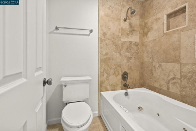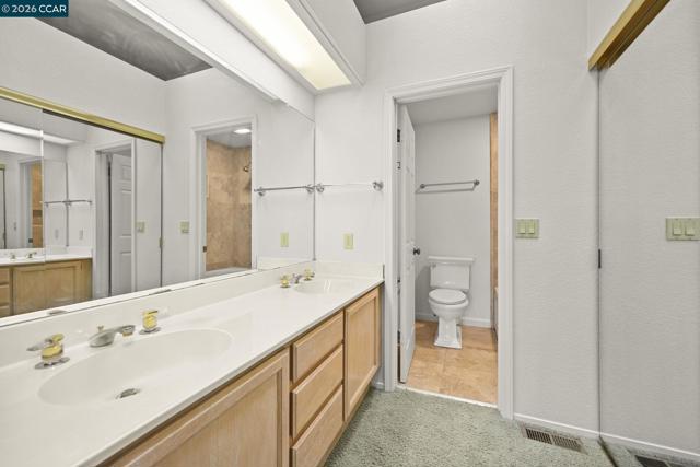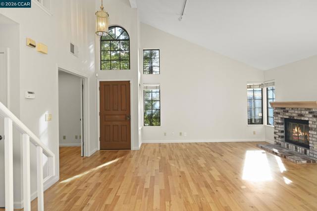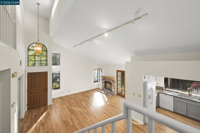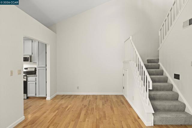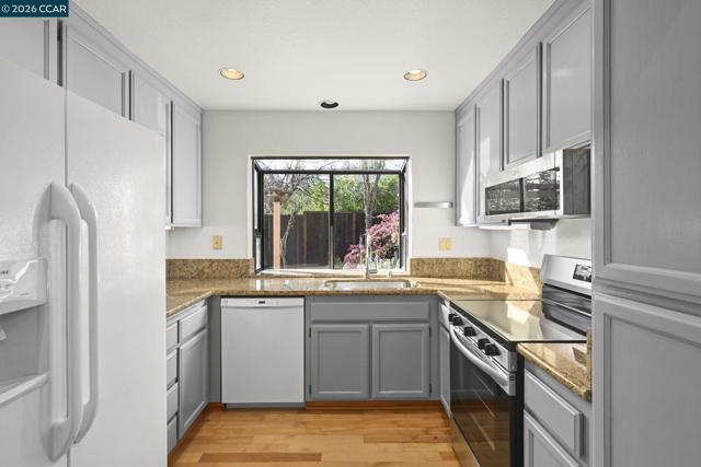 Quiet end of court location for this 3 bedroom, 3 bathroom, Valley High Duet. Wonderful floor plan w/ vaulted ceilings in the main living space with ONE Bedroom & full Bathroom on the MAIN LEVEL & 2 bedrooms each w/ attached bathrooms on the second floor. Goodsized Primary Suite with lots of closets & marble bathroom with soaking tub. This two story home is light filled with lots of windows throughout. Granite kitchen features newer Stainless Steel including Range & built-in microwave. Large Living & dining space w/ hardwood floors. Low maintenance yard off living room through slider lets in lots of natural light. Inside Laundry closet with washer and dryer included. Hardwood floors on the main level. Two car garage with storage cabinets and interior entrance.