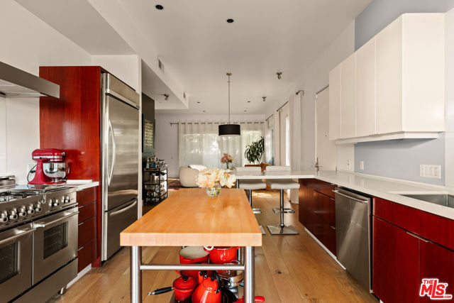 Located in a secure building in the heart of West Hollywood, this beautiful new-construction townhouse-style condo offers the ultimate retreat in one of Los Angeles' most sought-after locations. Step through the entry into an open concept living area - perfect for entertaining on all scales. The large living room features a custom built in, with oversized windows and sliding doors to the terrace that provide beautiful natural light throughout. The chef's kitchen hosts professional grade appliances, ample cabinetry and beautiful stone counters - with the added convenience of a breakfast bar for casual dining or a workspace. Ascend the staircase to the upper level, featuring the primary bedroom and two guest rooms. The primary boasts walls of windows and spacious built-in closets, with a spa-like en suite bathroom with a soaking tub, shower and dual vanity. Two generous guest bedrooms share a large bathroom, with the added convenience of full-sized laundry in the hallway. Additional highlights include two parking spaces with EV charging, additional external storage space and secure building access, all just moments away from some of the best dining, nightlife and entertainment West Hollywood has to offer.