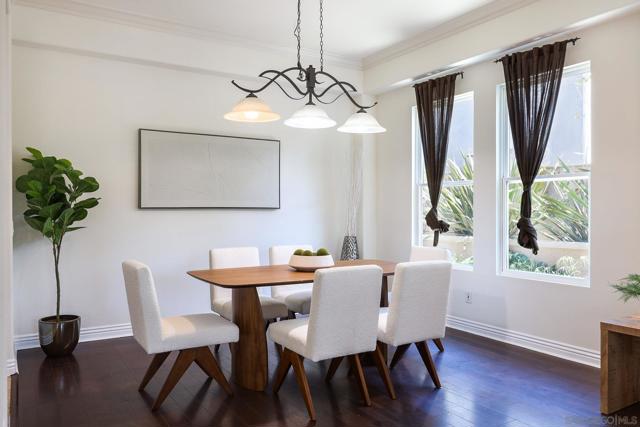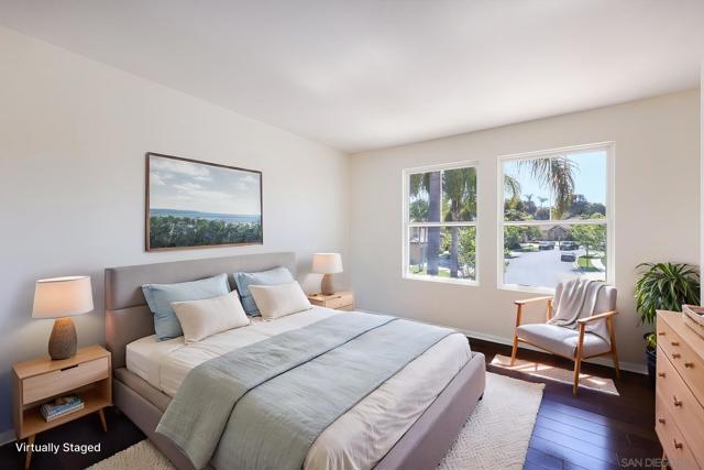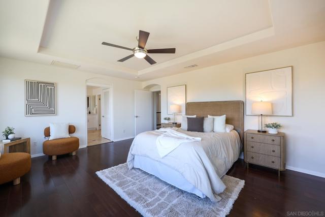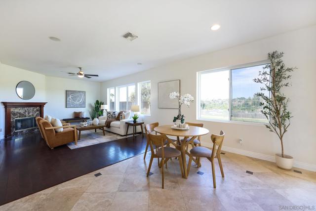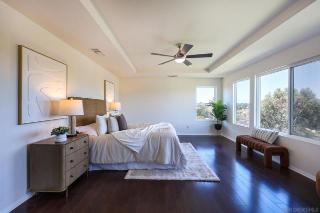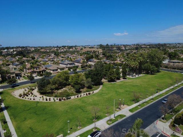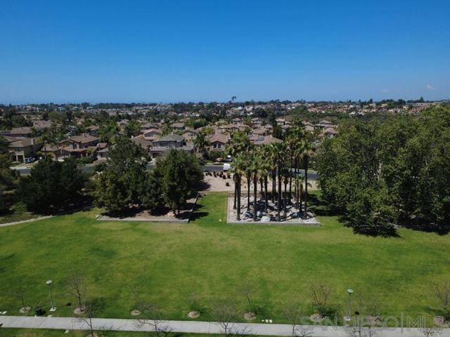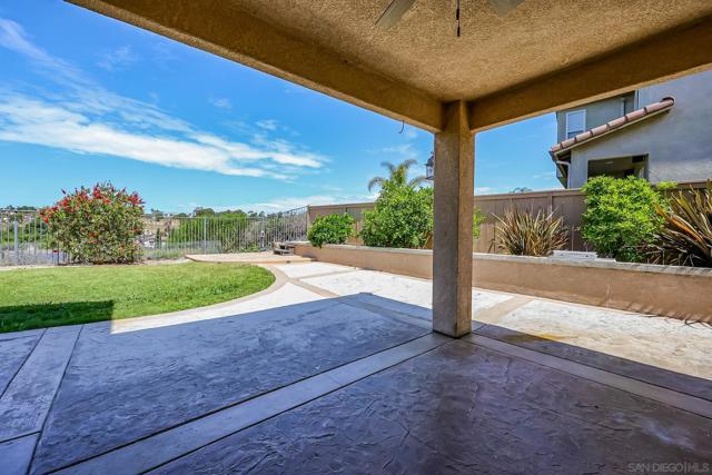 The backyard alone will stop most buyers in their tracks. Elevated above the valley with wrought iron view fencing that keeps the sightline completely open, this Otay Ranch home delivers the kind of panoramic vista, rolling hills by day, a soft spread of city lights by night, that usually comes at a significantly higher price point. The bones of the home match the setting. Walnut hardwood floors run through the main and upper levels, with travertine accents adding a natural contrast throughout. A fresh coat of paint throughout the interior and refinished cabinets give the home a clean, updated feel from the moment you walk in. The kitchen opens to a family room anchored by a custom fireplace, and the overall flow is easy and intuitive for everyday living. A full bedroom and bath on the main level handles guests or extended family without disruption to the rest of the house. Upstairs, the primary suite is finished with marble countertops, upgraded fixtures, and a custom built-in wardrobe system in the walk-in closet. Solid core bamboo doors run throughout, the kind of detail that tells you the upgrades here were thoughtful, not cosmetic. Three-car garage, community pool access, and a location close to top Otay Ranch schools, parks, and shopping round out a home that's genuinely move-in ready from day one.