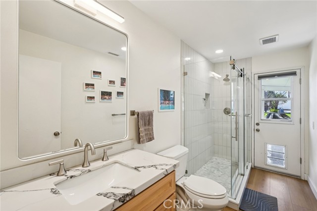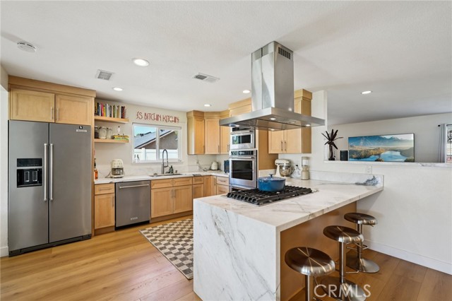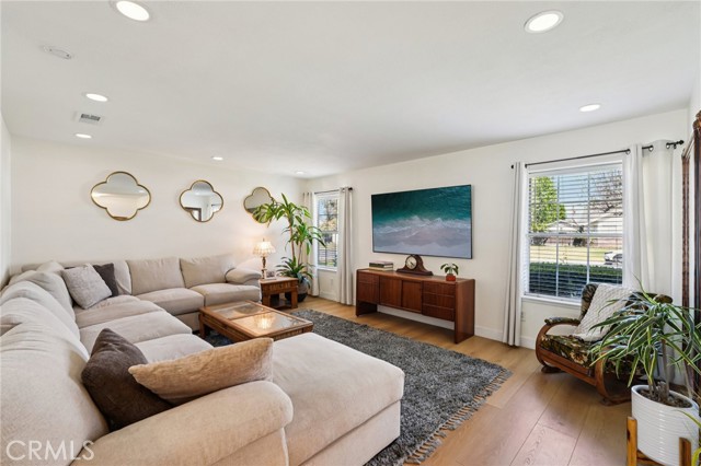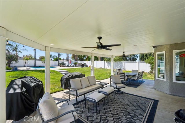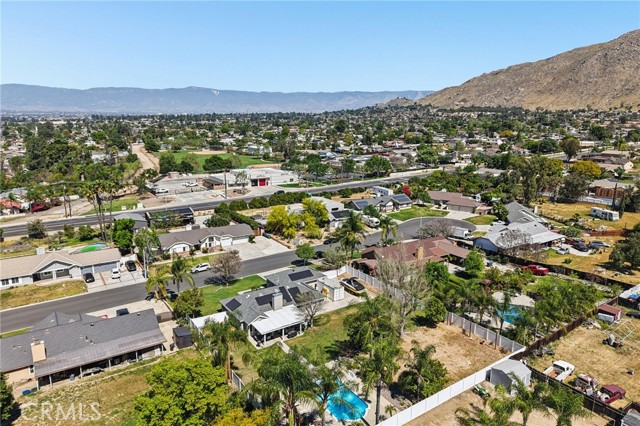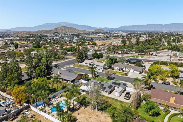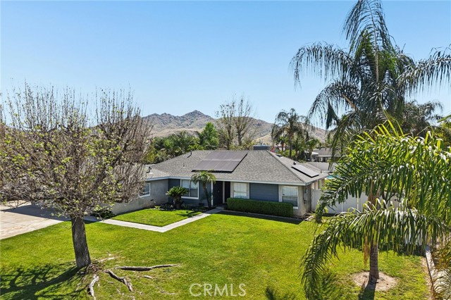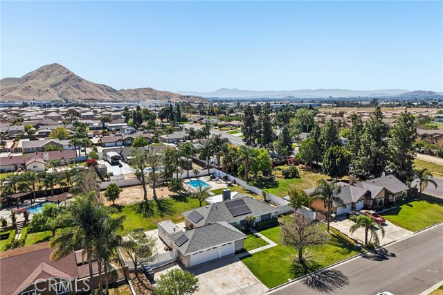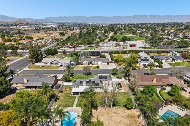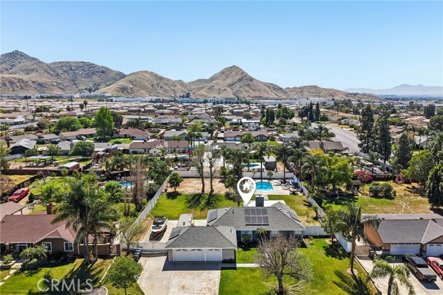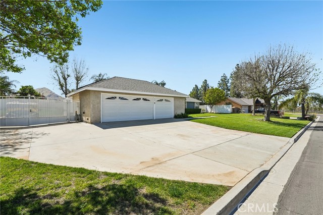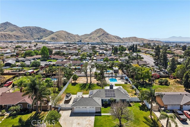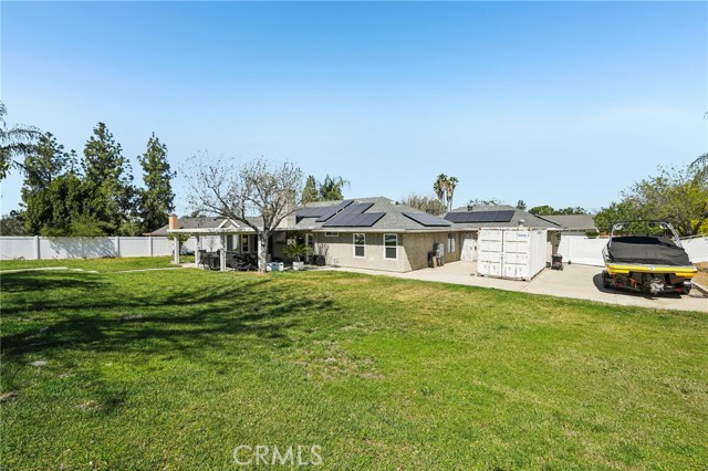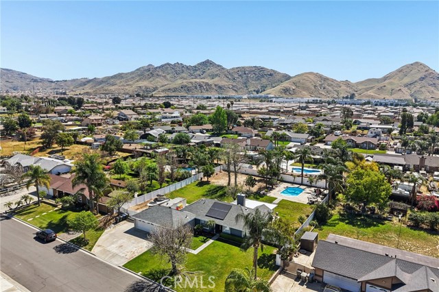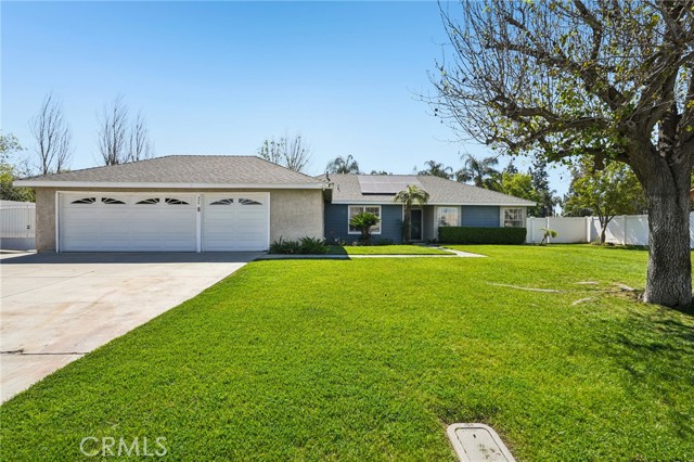 Welcome to 470 Conners Ln in Riverside, California. This beautifully upgraded single-story cul-de-sac pool home offers 3 bedrooms, 2 bathrooms, and a spacious 3-car garage, all situated on nearly half an acre of land. This property features gated RV parking and fully paid-off solar, providing both convenience and energy efficiency. Step through the inviting double door entry into a bright and open great room that seamlessly combines the living room, dining area, and upgraded kitchen. The kitchen is designed for both function and style, featuring new cabinets, stunning marble countertops with a waterfall edge, a breakfast bar, new appliances, and a sleek stainless steel hood vent over the stovetop. Bay windows offer picturesque views of the backyard and pool, while new waterproof wood laminate flooring and LED lighting enhance the modern feel throughout the main living spaces. A cozy fireplace in the dining area, currently styled as a sitting room, adds warmth and versatility. Down the hall, the guest bathroom has been tastefully remodeled with a quartz countertop sink and updated shower, along with convenient access to the backyard. The primary suite is a true retreat, filled with natural light and featuring dual closets and a beautifully upgraded bathroom complete with a walk-in shower, new fixtures, and a quartz countertop vanity. Step outside to your private backyard oasis, where an expansive layout offers the perfect setting for relaxation and entertaining. Enjoy year around outdoor living under the large covered Alumawood patio equipped with ceiling fans and hookups for a refrigerator and TV. The sparkling pool, paired with a generous grassy area, multiple fruit trees and white vinyl fencing create a resort-style atmosphere with ample space for gatherings and leisure.