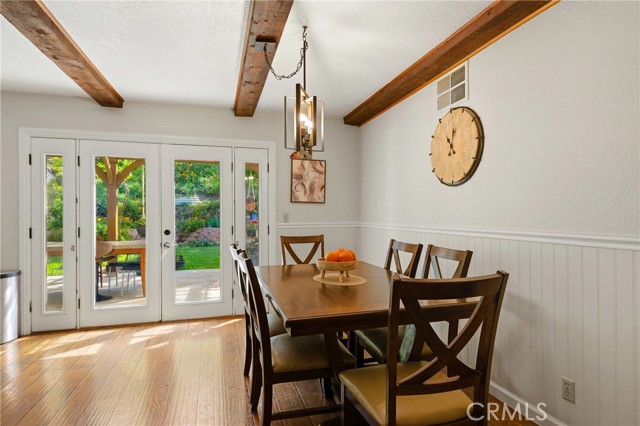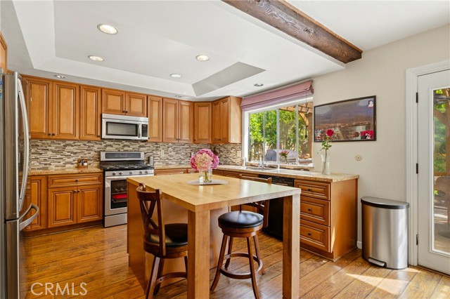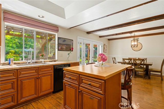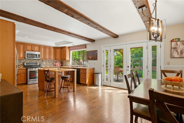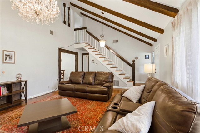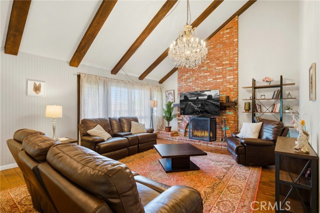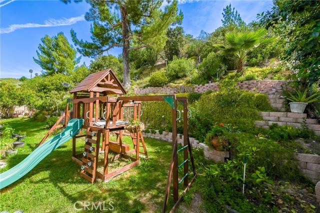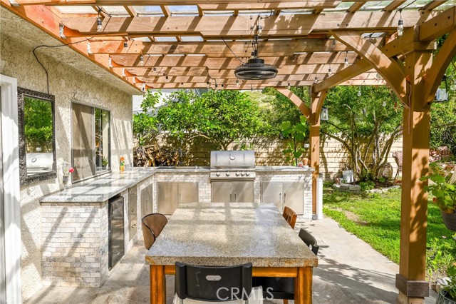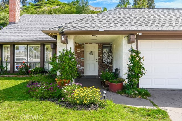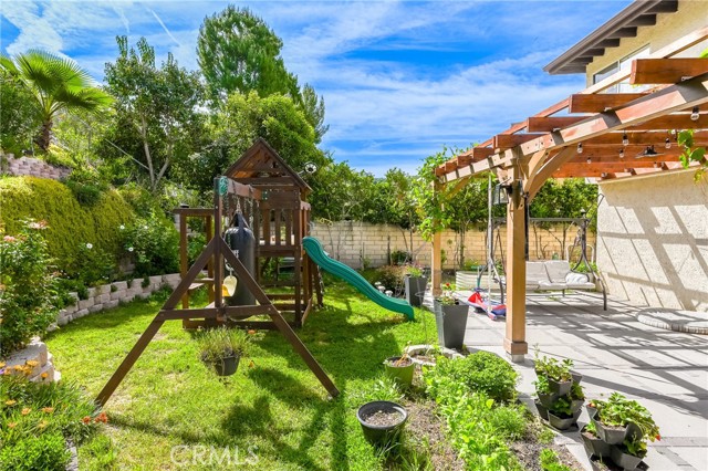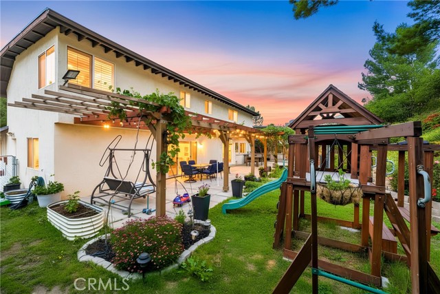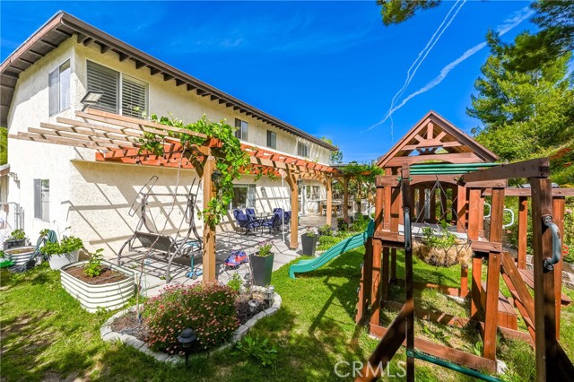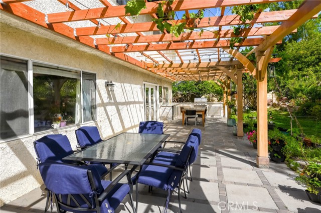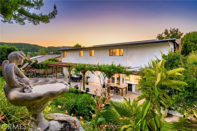 This beautifully maintained home in the heart of Happy Valley, one of Newhall’s most sought-after neighborhoods, perfectly blends architectural character with modern efficiency. The expansive living room makes a grand first impression with open-beam ceilings, a classic brick fireplace, and rich wood flooring. Culinary enthusiasts will love the remodeled chef’s kitchen, featuring granite counters, custom cabinetry, and a versatile butcher-block island/breakfast bar. Seamless indoor-outdoor living is invited through French doors leading to a nature lover’s paradise. The peaceful, private backyard features a lush garden filled with vibrant flowers and fruit trees. Entertain in style at the dedicated barbecue area, tucked under a stunning custom pergola draped in mature grapevines, providing the perfect canopy for alfresco dining and evening relaxation. The versatile floor plan continues inside with a convenient downstairs guest wing (bedroom and den), featuring a custom Murphy bed and bookshelf unit. Upstairs, find two spacious secondary bedrooms and a primary retreat boasting "his & hers" walk-in closets and a dedicated sitting area. Owned Solar, new 200A electrical panel with EV charger, copper plumbing throughout, and updated HVAC systems, and a new tankless water heater. Complete with a 3-car garage featuring a workshop/office and sink (and a vibrant, custom art mural!), all located just minutes from the 5 freeway at Calgrove Blvd. NO Mello Roos and NO HOA.