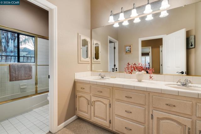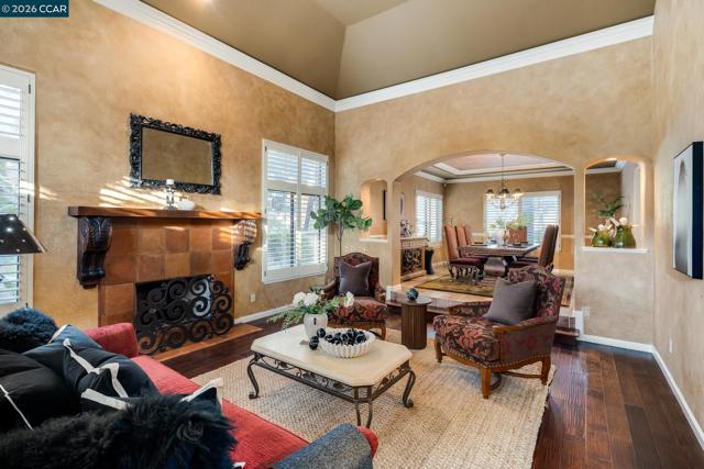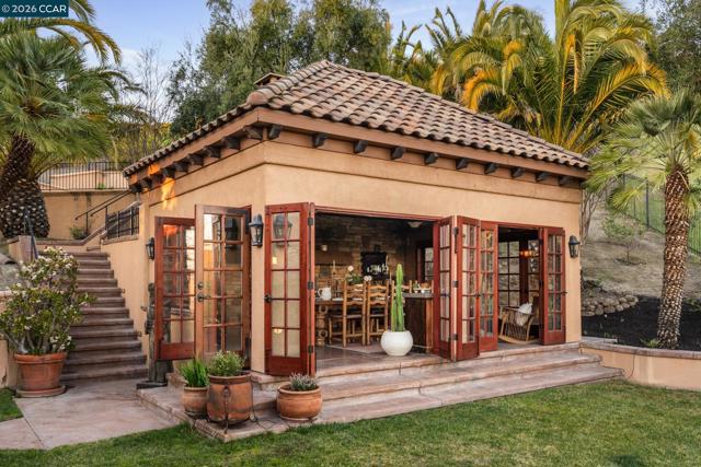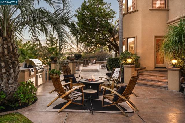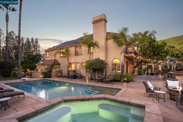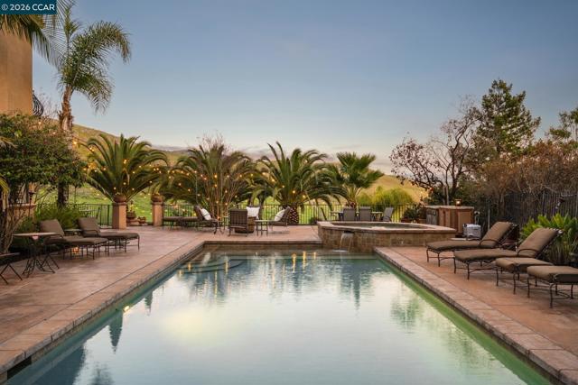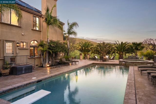 Tucked behind the gates of Blackhawk Country Club on a private 1.87-acre lot, this distinctive estate offers a sophisticated resort-style lifestyle. Designed for seamless indoor-outdoor living & expansive entertaining, the property features a destination backyard backing to open space with east-facing views of the Tassajara Valley. 4,919sqft with 4 beds & 3.5 baths, including a bonus room (potential bedroom) & executive office. The chef’s kitchen features new Viking, Bosch & KitchenAid appliances, granite countertops, custom cabinetry, a large center island, walk-in pantry, & dining nook. Outdoor living includes multiple patios on two levels, a solar-heated pool & spa, sports court, built-in grill, manicured lawns, & mature palms. A standout approx 300sqft cabana offers a wood-burning fireplace & 4 sets of fold-away French doors opening to the gardens & views, ideal for gatherings day or night. The primary suite includes a private balcony overlooking the grounds. Additional highlights include custom mesquite double front doors, hardwood & tile floors, coffered ceilings, crown molding, plantation shutters, recessed lighting, a 3-car garage, & dual updated HVAC systems. Enjoy access to golf courses, clubhouses, tennis & pickleball, sports complex, fitness center, & Blackhawk Plaza.