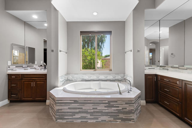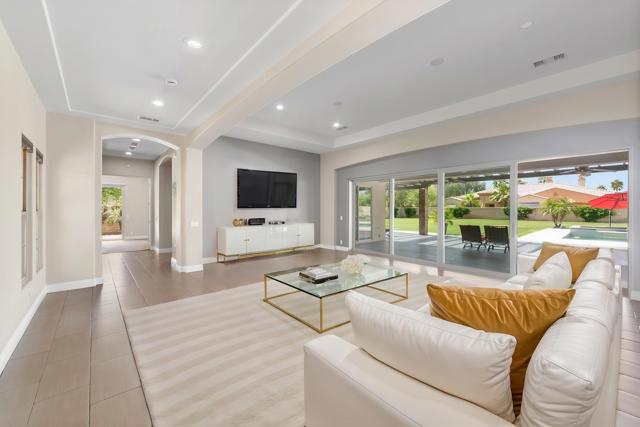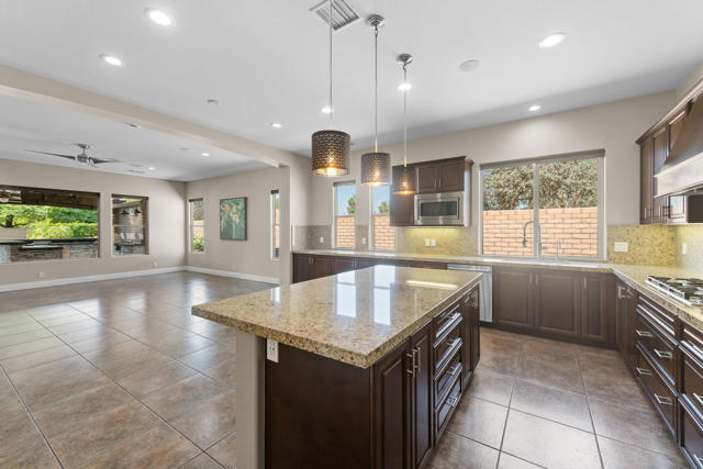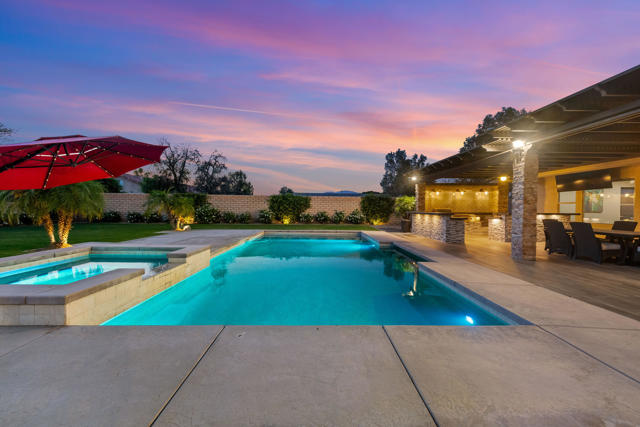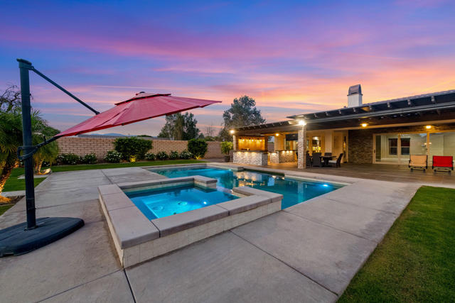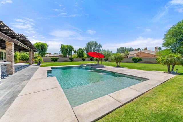 Beautiful Stonegate property in Bermuda Dunes! From the moment you walk up the front path to the front door, this impressive home will excite you. Designed for comfort, style, and incredible entertaining, this property truly merges indoor and outdoor living in the best way. The massive backyard is a showstopper, featuring a sparkling pool, relaxing spa, underwater bar stools, lush palm trees, beautiful landscaping, and mountain views. Sliding doors open wide so the outside flows seamlessly inside, creating the perfect setting for gatherings large or small. Inside, the heart of the home is the spacious great room kitchen with a large center island, 5-burner stove, stainless steel appliances, and a buffet counter ready for entertaining. And the outdoor kitchen is just as impressive, featuring a grill, griddle, burner, built-in ice chest, awning,refrigerator, large screen TV, and sunshades that provide comfort and shade while offering an incredible space for hosting family and friends. The private casita has its own entrance, making it ideal for guests who want privacy and comfort. There is also a separate lounging room with two additional bedrooms, giving everyone room to spread out. Whether you need space for extended family, a playroom, an office, or even another bedroom, this floor plan offers so many opportunities. The primary suite is a dream, complete with an amazing custom closet featuring drawers, pull-outs, lighting, and abundant space. The spa-like bath includes a deep jetted tub, walk-in shower, and separate vanities. And let's not forget the 3-car garage, immaculate and beautifully finished with slurry-coated floors, so pristine you could practically perform surgery in there. This Stonegate beauty offers luxury, flexibility, and fabulous entertaining space all in one gorgeous Bermuda Dunes property.