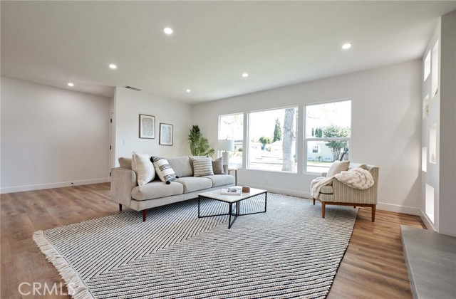Beautifully remodeled 3-bedroom, 2-bathroom home in the heart of Santa Ana! This inviting residence features a bright, open floor plan with stunning wood flooring throughout and a custom fireplace that creates a warm, modern living space. The open-concept kitchen offers bar seating and flows seamlessly into the living and dining areas—perfect for entertaining. Enjoy the convenience of an indoor laundry area and a spacious primary suite complete with an updated bathroom. Step outside to a large, park-like backyard—ideal for relaxing, hosting gatherings, or creating your dream outdoor oasis. The property also includes a detached 2-car garage and an expansive driveway with ample parking. Ideally located near shopping, dining, and easy freeway access, this home offers both comfort and convenience in a desirable neighborhood.