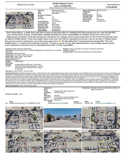 What's Being Offered A mobile home park with 12 tenant-occupied units Pluss 2 more. Rent guaranteed by the county through 2041 year. A government-backed housing program (likely subsidized housing lease) Owner responsibilities are minimal: o Provide Free water service.o Maintain general cleanliness of the park .o Tenants pay: (Electricity. Gas. Internet ) o Repairs (for pay from tenants' units) 🏠 The 2 Owner-Owned Units. These are different Mobiles Homes: Owner must handle repairs on the water well. Still not responsible for electricity or gas for the other 12 Mobiles Homes. These generate separate rental income (not part of the county master lease) 💰 The Big Selling Point 'Guaranteed income through 2041'This is the headline feature. o 🚩 No Units are vacant? 2. Owner offers financials details. o Actual monthly income o Expenses (water, maintenance, insurance, taxes) o Net operating income (NOI) 3. Utility responsibility.It says owner provides water service, And Maitane's service to the Well.4. Repairs 'not your responsibility on the 12 Mobiles Homes. Who owns each mobile home. Different tenants.Tenants own their homes (common in mobile home parks) That's a big advantage,5. The others 2 units or Mobiles Homes are owned by the sellers. These could: Add income two more Income, per month. 🧠 Bottom Line. This could be: A low-maintenance, stable cash-flow investmentA 'guaranteed' income. A summary of rent roll.As of today, I can tell you about the outcome regarding the parking situation: An APN (Assessor's Parcel Number) has been assigned to each individual parking space.This was done to ensure that every property could be uniquely identified; as humans, we tend to repeat numbers and street names, which creates issues for utility providers such as water and electricity companies. That is precisely what the County did: it subdivided the parcels of land upon which the mobile homes are situated. However, while the individual records for each lot now list the designation 'LEASE LAND,' the general property records still identify Jose and his wife as the legal owners.--------------------------------------Para preguntas y citas llama/texto:Salvador 760.409.3614