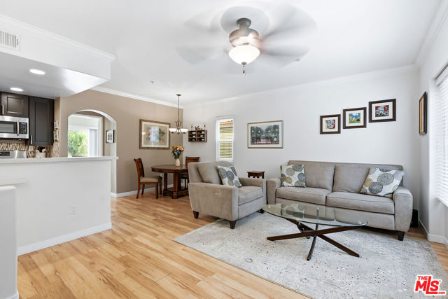 Welcome to this beautifully remodeled one-bedroom end-unit townhome nestled in the sought-after Bella Montagna community, where comfort meets resort-style living. Ideally located in the foothills just south of Ventura Boulevard, this serene and stylish home greets you with a private patio and a bright, open-concept living space designed for both relaxation and entertaining. The modern kitchen shines with quartz countertops, a designer tile backsplash, custom cabinetry, and stainless steel appliances, perfectly blending form and function. Throughout the home, light-filled interiors and sleek laminate flooring create a warm, contemporary feel. The spacious en-suite bedroom offers generous storage and features a charming Juliet balcony that invites in natural light and fresh air. Additional highlights include a direct-access one-car garage, extra storage, and a convenient downstairs laundry area with a side-by-side washer and dryer. Bella Montagna offers beautifully maintained grounds and an impressive array of amenities, including scenic walking trails, a basketball court, resort-style pool and spa, fitness center, BBQ areas, and a private theater room in the clubhouse. With gated entry, ample guest parking, and close proximity to shopping, dining, and freeway access, this home delivers the perfect balance of tranquility and convenience.