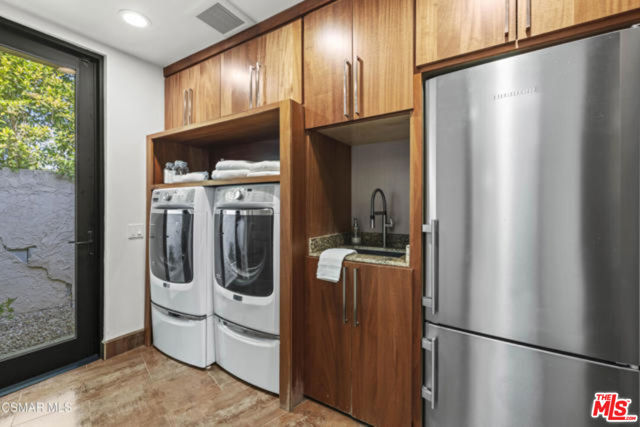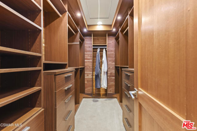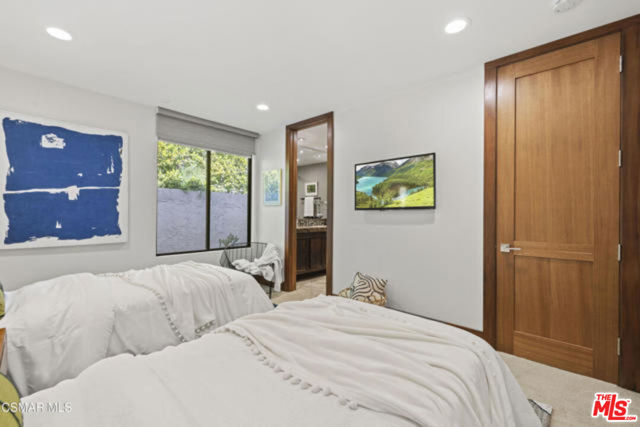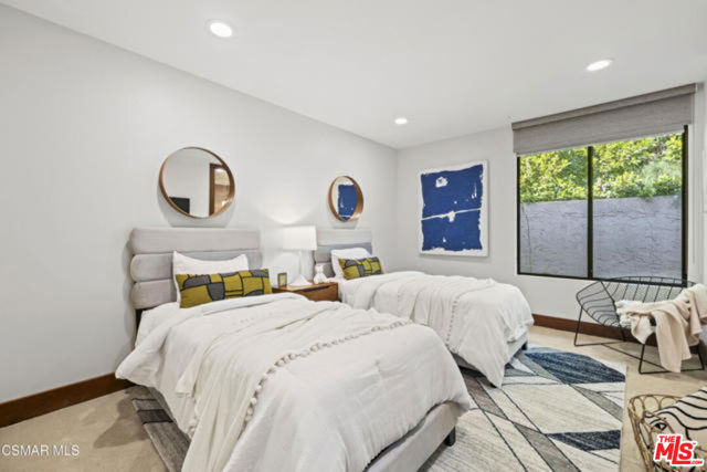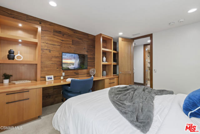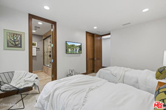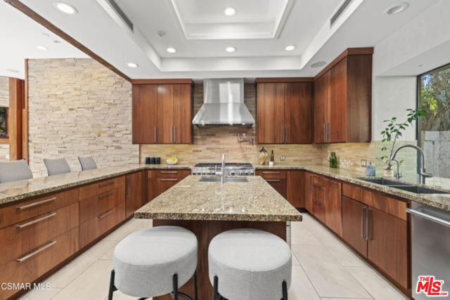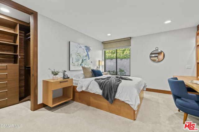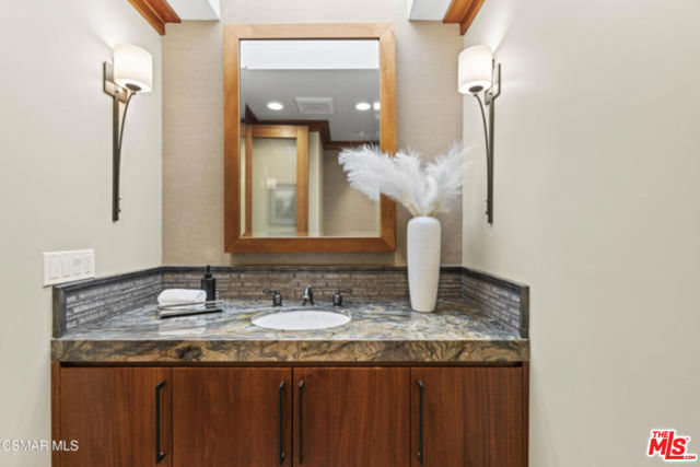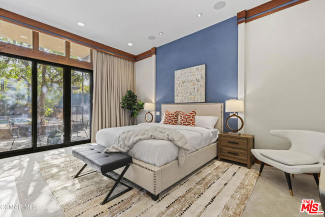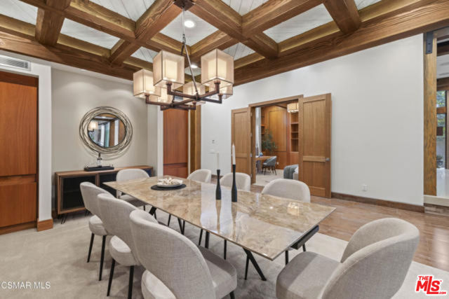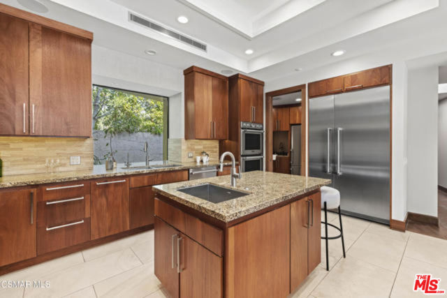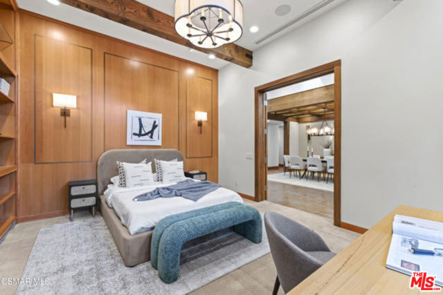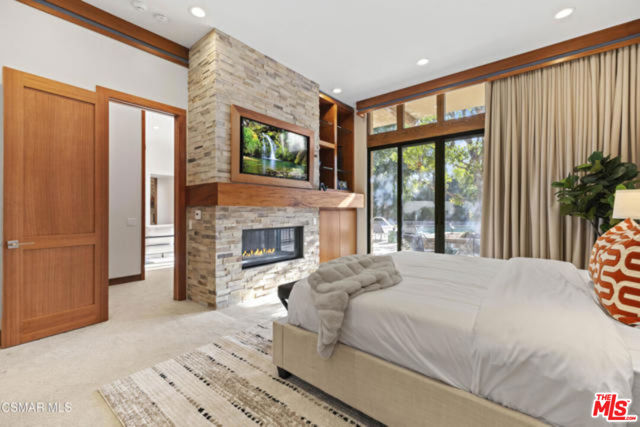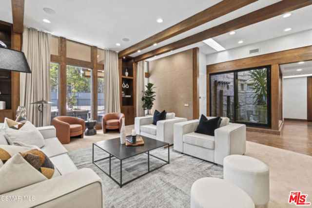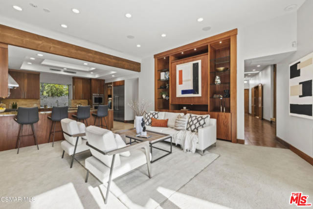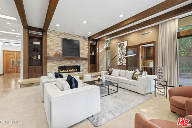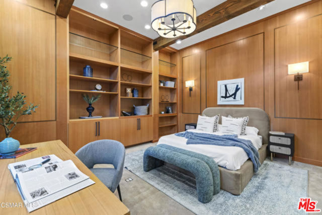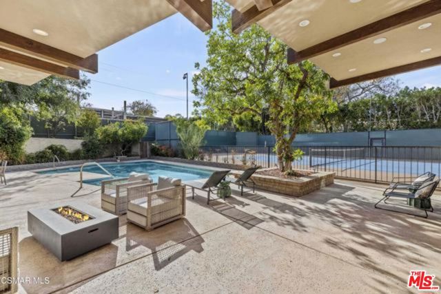 Welcome to a truly one-of-a-kind architectural estate in the prestigious Amestoy Estates of Encino. Rebuilt in 2014, this exceptional single-story Mid-Century Modern residence masterfully blends timeless design with refined modern luxury, offering an elevated living experience on a quiet private cul-de-sac.Spanning approximately 3,835 square feet, the home is thoughtfully configured with three bedrooms and 3.5 bathrooms, along with a beautifully designed office that can easily serve as a fourth bedroom if desired. Every detail reflects exceptional craftsmanship, with interiors showcasing exposed wood beams, clerestory windows, skylights, coffered ceilings, and rich custom wood inlays. Stacked stone accents, bespoke millwork, and curated designer lighting create a warm yet sophisticated atmosphere throughout. At the center of the home, the expansive great room opens seamlessly to a stunning open-air atrium, where cascading waterfalls and lush landscaping create a serene, resort-like setting that beautifully blurs the line between indoor and outdoor living.Custom built-in cabinetry, stone slab surfaces, and heated flooring further highlight the home's commitment to quality and comfort. The gourmet kitchen is a true chef's showcase, featuring premium Thermador appliances, including a dual-oven gas range with custom hood, additional wall ovens, built-in refrigerator, and dishwasher. A spacious walk-in pantry, elegant finishes, and a highly functional layout make it ideal for both everyday living and entertaining. A sophisticated wine bar completes the space.The primary suite offers a private retreat with its own fireplace and a spa-inspired bathroom featuring a jetted soaking tub, steam shower, and luxurious finishes throughout. Secondary bedrooms include custom walk-in closets with cedar paneling and automated lighting, combining thoughtful design with everyday convenience.Modern amenities include solar panels, a whole-house water filtration system, dual tankless water heaters, dual HVAC systems, a dedicated utility room, and a three-car garage with epoxy flooring and custom built-in storage.The resort-style backyard is designed for both relaxation and recreation, featuring a full-size tennis court and a sparkling pool, creating an extraordinary outdoor living experience. This remarkable residence is more than a homeit is a statement of design, lifestyle, and distinction, offering a rare opportunity in one of Encino's most coveted neighborhoods.