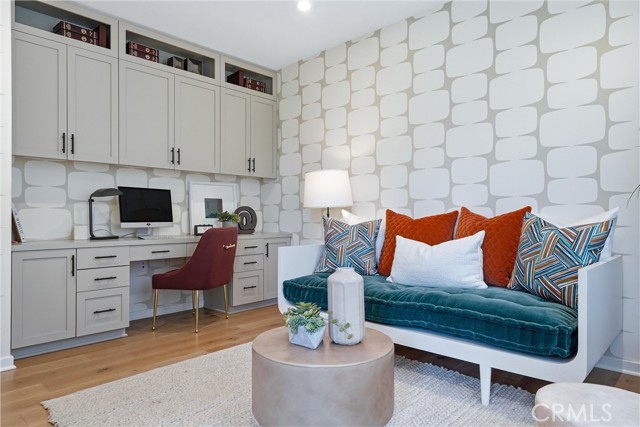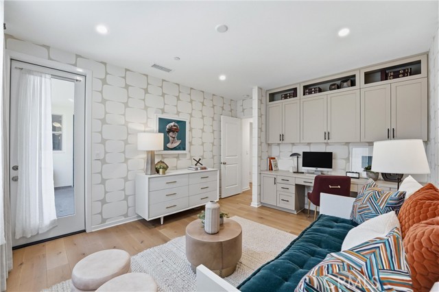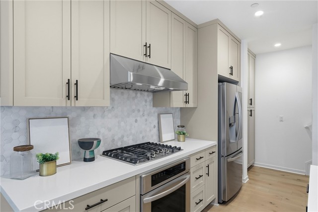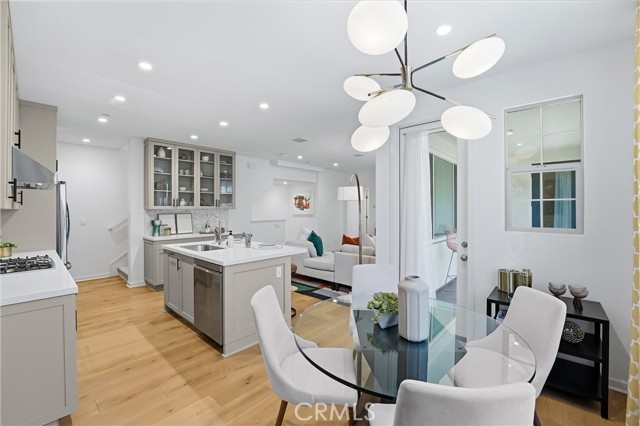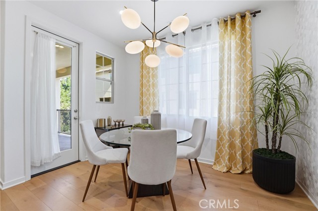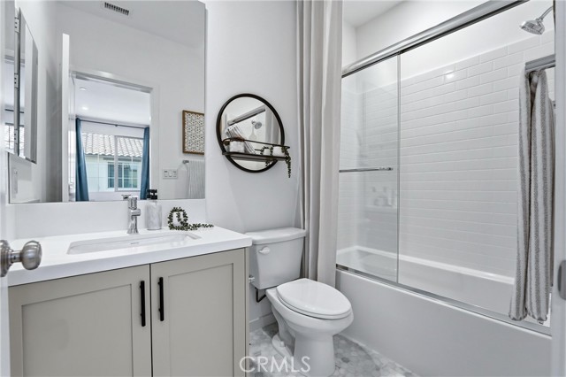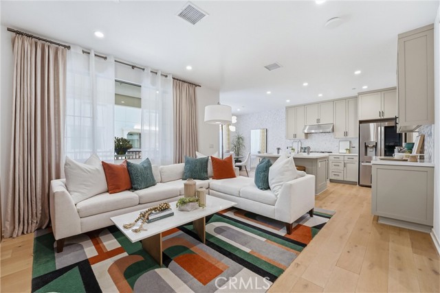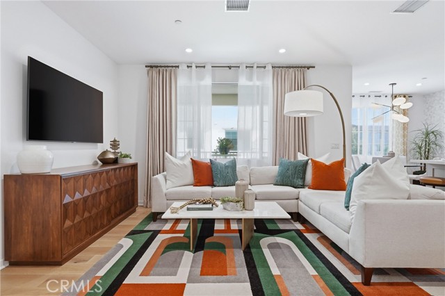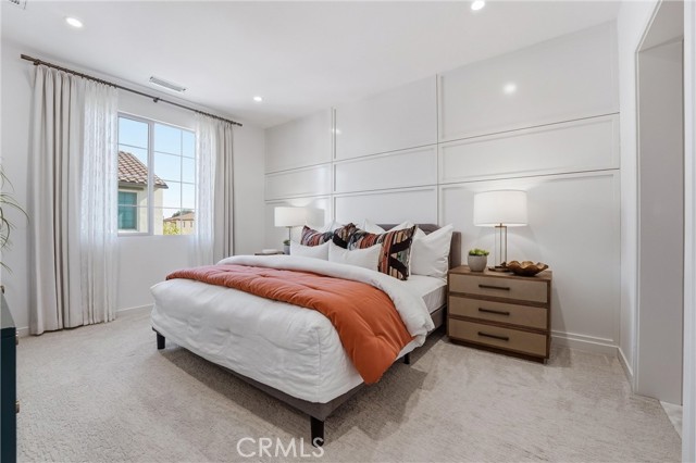Builders home model facing the greenbelt. 3 Bedroom with 1 bedroom on main living floor (level 2). Highly upgraded throughout, modern lighting fixtures, open kitchen with spacious island with sink and breakfast bar, nice patio balcony. Large En-suite (hosts personal bath) and Primary Suite with large walk in shower, dual sinks and plenty of cabinetry. Energy-conscious including solar, heat pump heating and cooling system, tankless water heater and smart controls. Enjoy Cypress Village amenties and the location within the Great Park area, close to the sport courts, hangar and balloon.