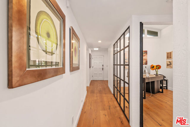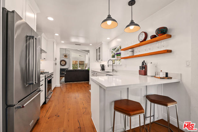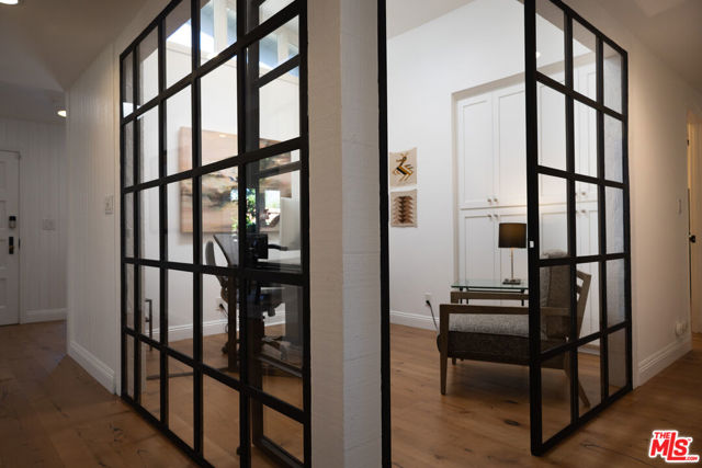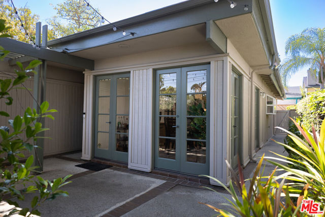 This completely designer-remodeled 1964 post and beam offers a true wow-factor interior full of charm, character, and gorgeous modern updates in prime Studio City. Ideally situated on a charming, quiet tree-lined street in one of the neighborhood's most sought-after pockets, the home is set behind gates and fencing, offering a private entrance. This 2-bedroom, 2-bath home also features a stunning glass-framed office, stylishly converted from the original third bedroom, ideal for working from home or creative use. Showcasing soaring ceilings and dramatic exposed wood beams true to the era, the home blends classic mid-century character with fresh designer finishes, including custom kitchen cabinetry, abundant built-in storage, and hardwood floors throughout. The inviting living room features a wood-burning fireplace and sliding doors opening to a private backyard with pool and spa, creating seamless indoor-outdoor living. A spacious walk-in closet and huge laundry room are rare features for a home of this size, along with a 2-car garage. This home is warm, stylish, and full of charm, a special place, truly move-in ready, and impossible not to fall in love with!