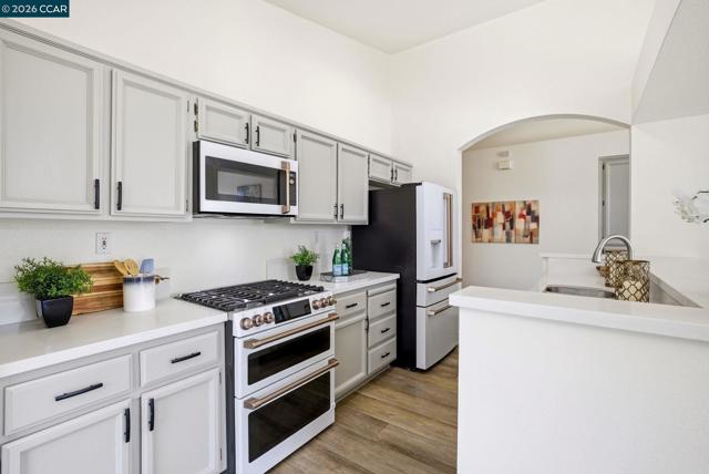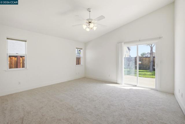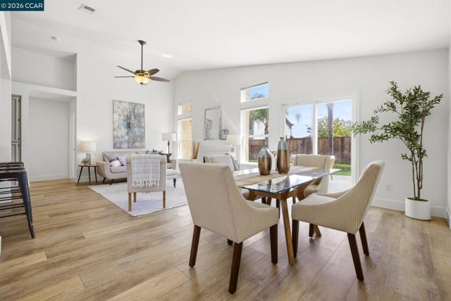 Single-story home with vaulted ceilings and natural light, creating an open, airy feel throughout the main living spaces. Wide-plank flooring connects the living room with fireplace, dining area and centrally positioned kitchen, creating a layout that feels both open and easy to live in. The kitchen is designed to stay connected, with a pass-through peninsula and bar seating that keeps conversations going while cooking, plus a separate breakfast nook with backyard access that works just as well for morning coffee as it does for a flexible workspace. The primary suite is set for privacy with vaulted ceilings, direct backyard access and an ensuite bath with dual sinks and a walk-in shower. Two additional bedrooms offer flexibility for guests, office or everyday use. Out back, the patio and lawn create a natural extension of the living space, room to relax, dine or unwind, framed by mature palms. Walkable to Nunn-Wilson Family Park, the location adds everyday convenience with nearby open space, play areas and room to get outside without getting in the car. Schools, local shopping and main commute routes are all within easy reach, supporting a routine that feels both connected and manageable.