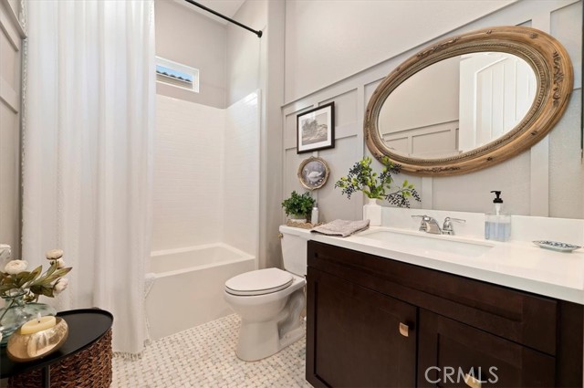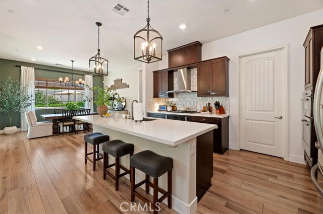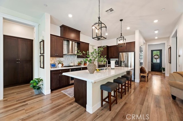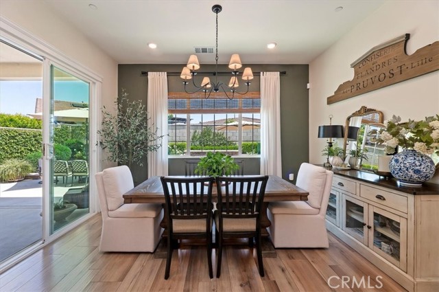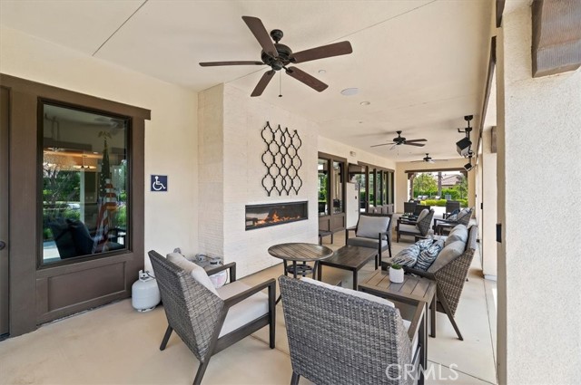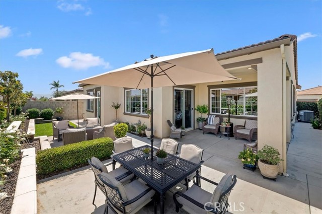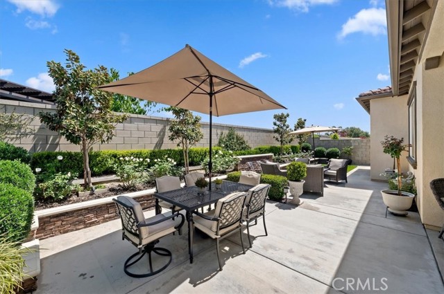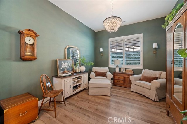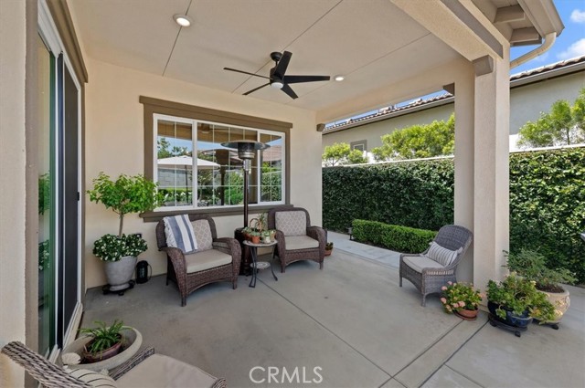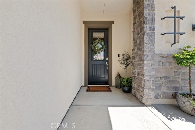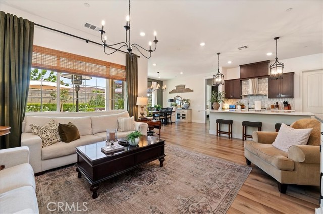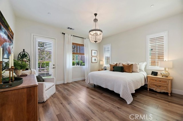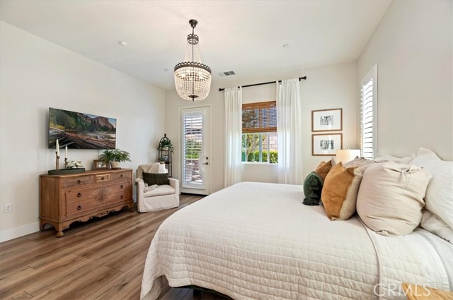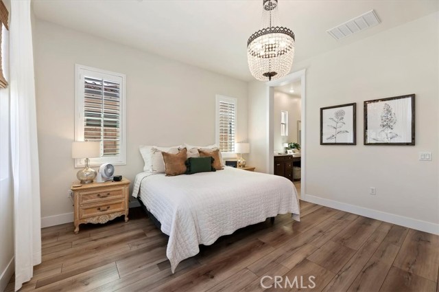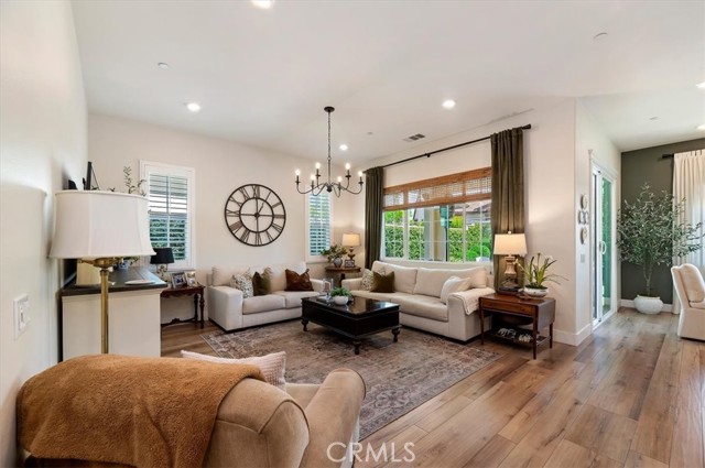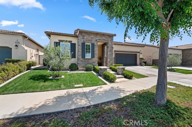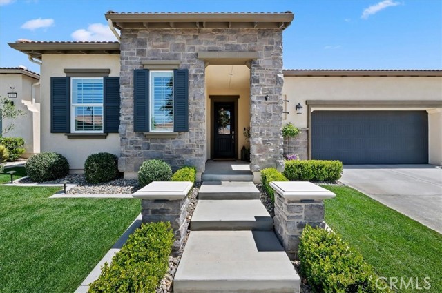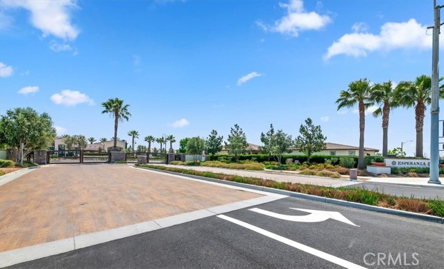 Welcome to the gated Esperanza 55+ Active Adult Community—one of the most desirable communities in Ontario Ranch. This exceptional single-story residence, the highly sought-after Modena model, is a true gem that presents beautifully and offers a seamless blend of style, comfort, and thoughtful design. Offering 2 bedrooms, 2 bathrooms, and a versatile flex room with the potential to serve as a third bedroom, home office, or den, this home provides both functionality and flexibility to fit your lifestyle. From the moment you step inside, the attention to detail is unmistakable. Elegant laminate flooring, upgraded baseboards and casing, plantation shutters, and refined designer finishes create a bright, modern aesthetic throughout. The kitchen is tastefully appointed with quartz countertops and a full marble backsplash, while decorative wall molding in the entryway and bath adds a distinctive custom touch. Every inch of this home has been carefully curated and impeccably maintained, creating a space that feels polished and complete. Step outside to a professionally landscaped front and backyard designed for both relaxation and enjoyment. A tranquil fountain enhances the setting, offering a peaceful backdrop for morning coffee or quiet evenings at home. The garage continues the home’s elevated feel, featuring epoxy flooring and suspended storage racks for a clean, organized environment. Residents enjoy exclusive access to the La Jolla Club, where resort-style amenities include a pool, bar area, outdoor kitchen, fire pits, fitness center, pickleball courts, and a dog park—perfect for an active and social lifestyle. Ideally located within walking distance to The Station at Eastvale and the Goodman Center, with convenient access to 99 Ranch Market, the 60 and 15 freeways, and just a short drive to Ontario Mills for shopping, dining, and entertainment. This is a rare opportunity to own a pristine, turn-key home in a premier 55+ community.