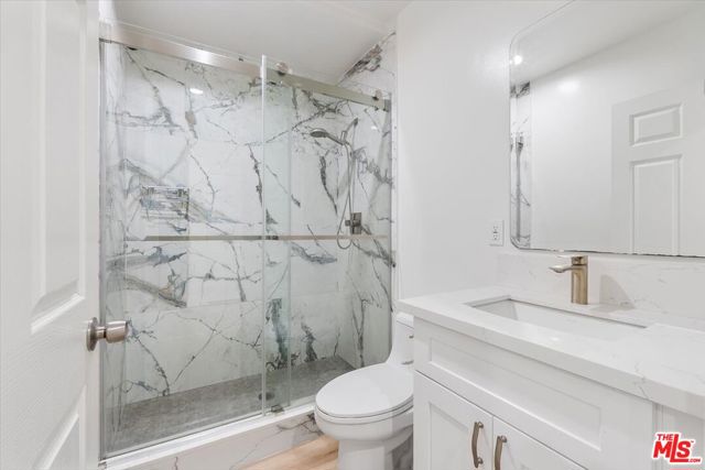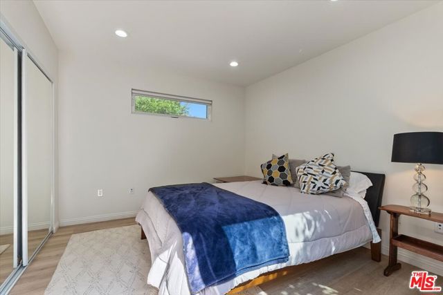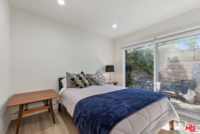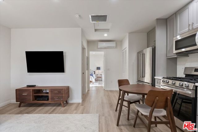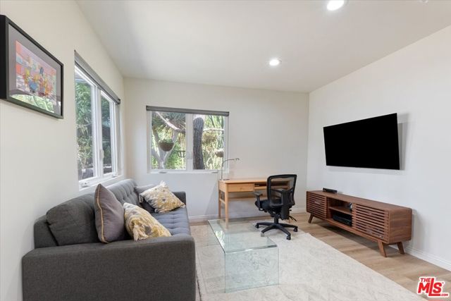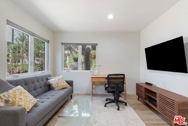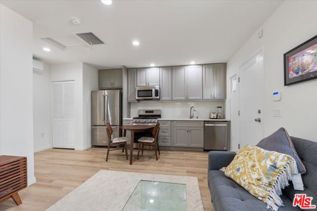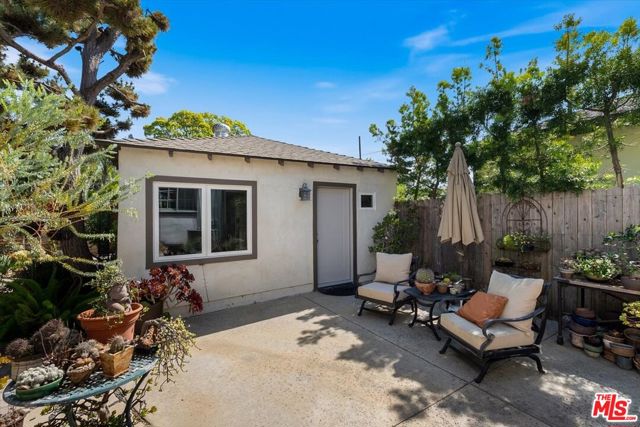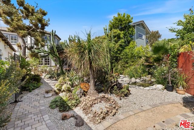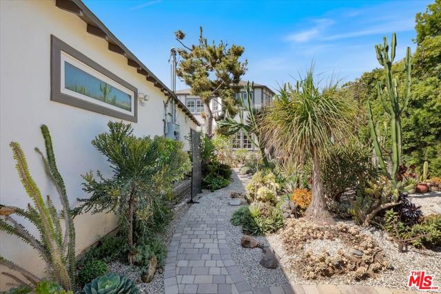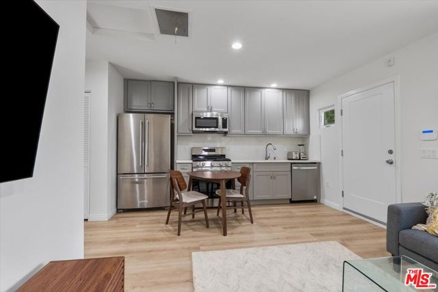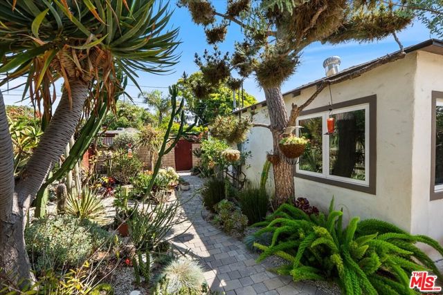 Rare beautiful fully furnished 1-bedroom, 1-bath Santa Monica ADU set within one of the most extraordinary private botanical gardens you'll find anywhere in West LA. This standalone California cottage offers the privacy and serenity of a secluded retreat while sitting just minutes from the beach, Main Street, and Montana Avenue's premier shops and dining. The open-concept living, dining, and kitchen area is bright and airy, anchored by wide-plank luxury vinyl flooring, recessed lighting, and oversized windows framing lush garden views on multiple sides. The living room is tastefully furnished with a gray tufted sofa, glass coffee table, wall-mounted flat screen TV, and a walnut media console. A dedicated workspace with desk and ergonomic chair makes this an ideal setup for remote professionals. The kitchen is fully equipped and beautifully appointed with floor-to-ceiling gray shaker cabinetry, quartz countertops, a marble-look backsplash, and a full suite of stainless steel appliances including a KitchenAid French door refrigerator, five-burner gas range, over-range microwave, and dishwasher. A round dining table with chairs sits adjacent to the kitchen for an easy everyday flow. The bedroom is comfortably sized with recessed lighting, LVP flooring, a mirrored sliding door closet, and a clerestory window for natural light and privacy. It opens directly to a private outdoor patio through a full-width sliding glass door a standout indoor-outdoor feature. The bath is spa-caliber, featuring floor-to-ceiling marble-look tile, a frameless glass-enclosed shower, white shaker vanity, quartz countertop, and brushed nickel fixtures throughout. The unit is equipped with a ductless mini-split HVAC system for year-round comfort, a smart home panel, and central HVAC. Fully furnished and move-in ready. The surrounding grounds are nothing short of remarkable! A mature, curated drought-tolerant botanical garden featuring rare cacti, towering aloes, succulents, paver pathways, and specimen trees cultivated over decades. Multiple outdoor seating areas on the private patio and throughout the garden create a sanctuary feel rarely found in any urban rental.