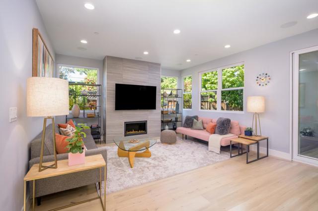 Stunning 2018-built modern home in prestigious Old Palo Alto featuring 4 bedrooms and 3 full baths. Bright open-concept layout with high ceilings, expansive windows, and a spacious great room with fireplace. Chefs kitchen with lacquered cabinetry, quartz countertops, premium appliances including Bertazzoni gas range, and large island. Sliding doors open to a private backyard with patio, fire pit, and BBQ, perfect for indoor-outdoor living. Flexible floor plan includes main-level bedroom and full bath. Luxurious primary suite with private balcony and spa-like bath. Features include smart home systems, solar panels, EV charging, dual-zone climate, and attached garage. Prime walkable location near Stanford, California Ave Shopping District, University Ave, Town & Country, Caltrain, and top Palo Alto schools with walking distance to Palo Alto High School.