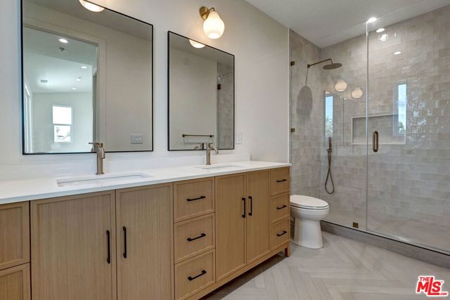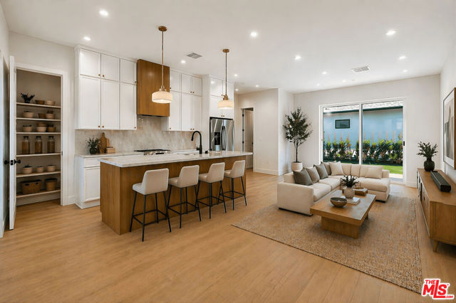 A New Construction with a contemporary take on timeless comfort blends warm finishes with thoughtful design throughout. This front residence offers 3 bedrooms, 3 full bathrooms, 1,592 SF of living space, and sits on an approximately 3,751 SF portion of the lot. The main level unfolds into an open-concept living and dining area anchored by a generous chef's kitchen, complete with quartz countertops, custom cabinetry, and built-in stainless steel appliances. A main-level bedroom and full bath offer flexibility for guests or a home office, while sliding doors open to a private yard that extends the living space outdoors. Upstairs, two bright bedrooms and two bathrooms create a comfortable retreat, enhanced by natural light and a well-balanced layout. Complete with one garage parking space and a driveway that fits two side-by-side parking spaces. Ideally located in Del Rey, in proximity to dining and shopping, with easy access to Mar Vista, Culver City, and Marina del Rey.