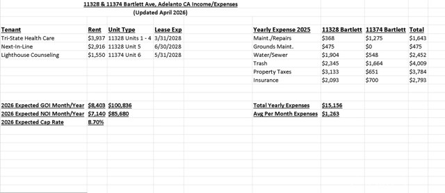 ***Come VIEW and MAKE an OFFER TODAY! Amazing COMMERCIAL INCOME OPPORTUNITY located in expanding Adelanto CA. TWO PROPERTIES (11328 and 11374 Bartlett Ave) are for sale as a package consisting of 3 BUILDINGS and 6 OFFICE/RETAIL UNITS all developed on a 20,500sf lot. Positioned in the heart of Adelanto's Business District, the site is only one block from Hwy 395 and close to Interstate-15 offering excellent access to all of Southern CA. Also, the site has frontage along HIGH-TRAFFIC Bartlett Ave, seeing tons of people drive by everyday. Plus, with Adelanto rapidly becoming a logistics/distribution hub, recent expansion has brought the SoCal Logistics Airport, Amazon fulfillment center, and Keurig/Dr. Pepper/Snapple manufacturing plant to the area. In addition, the site was part of Adelanto's BARTLETT AVE REHABILITATION PROJECT where millions was invested on massive improvements to infrastructure, as the city prepares for FUTURE GROWTH. 11328 Bartlett Ave is comprised of two structures. The first building is split into 4-units totaling 2,444sf, fully occupied by a healthcare/dental office. The second building is 1-unit totaling 2,088sf, fully occupied by a tax/business service office. Right next door, 11374 Bartlett Ave has the third building with 1-unit totaling 1,125sf, fully occupied by a counseling office. Altogether, there is 5,657sf of rent-able space, that has been generating steady cash flow for years. Currently at 100% OCCUPANCY, the units earn over $100,000 in GROSS ANNUAL INCOME. With limited commercial space available in Adelanto and lease rate on the rise, this is an ideal property for any real estate investor needing LUCRATIVE CAP RATES. A definite must see OPPORTUNITY, worthy of serious consideration, before it's too late.***
