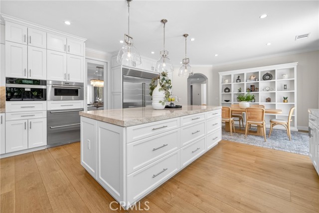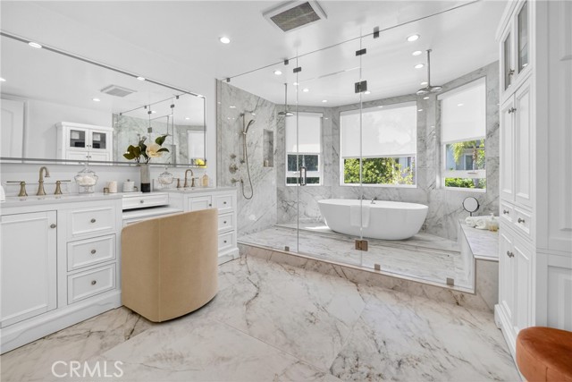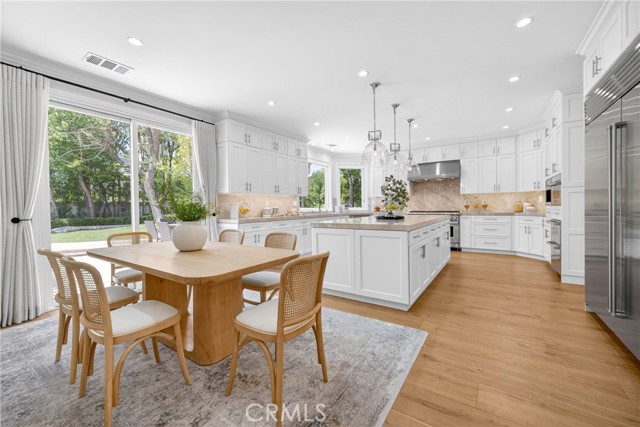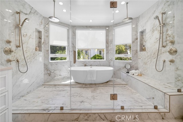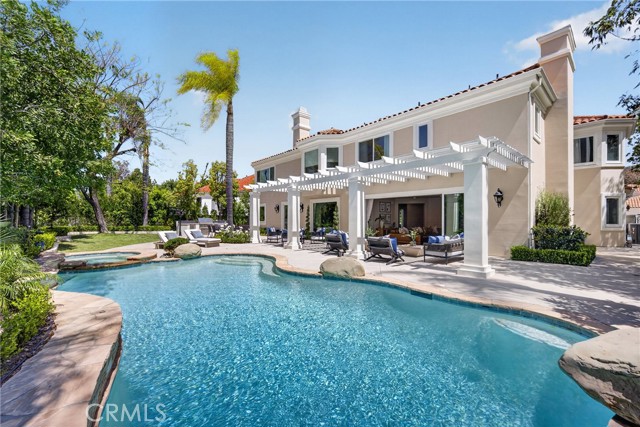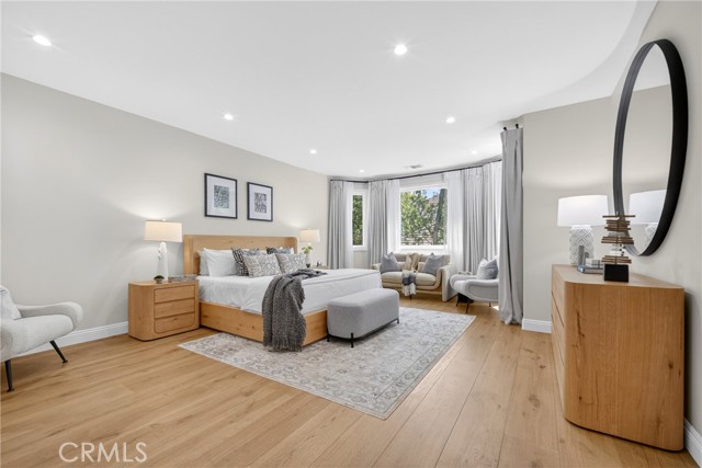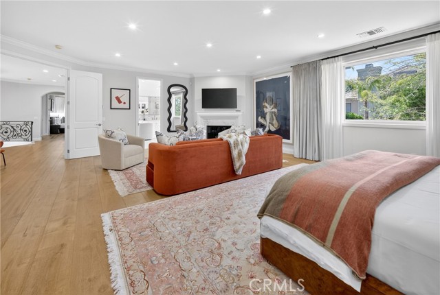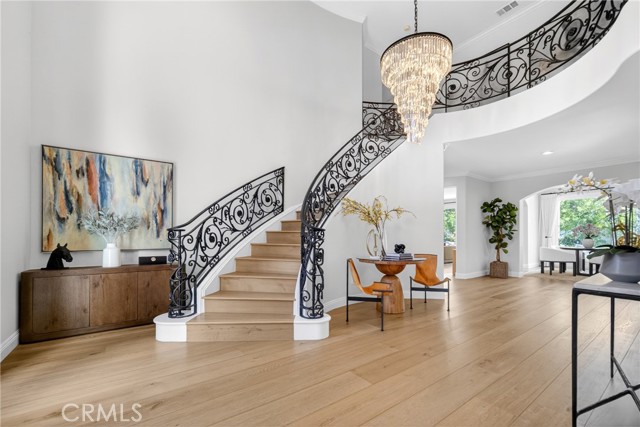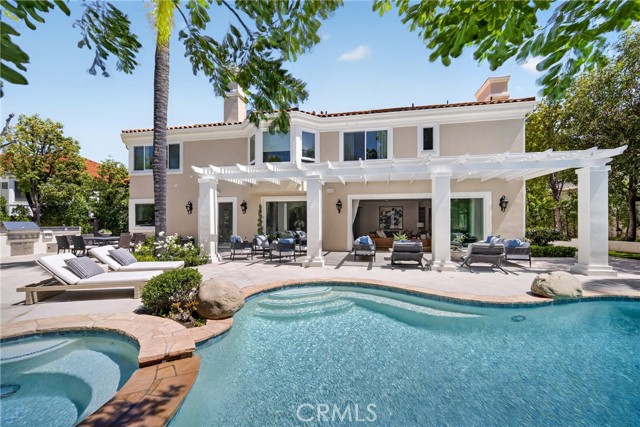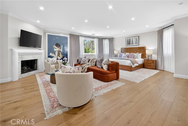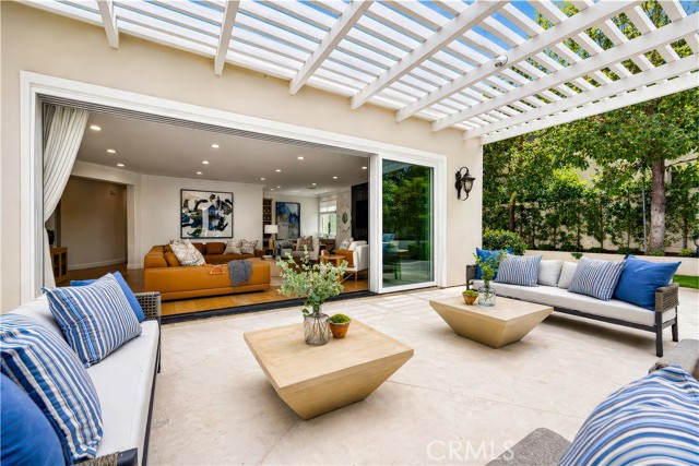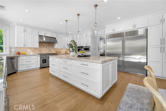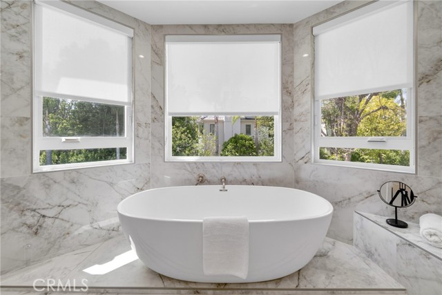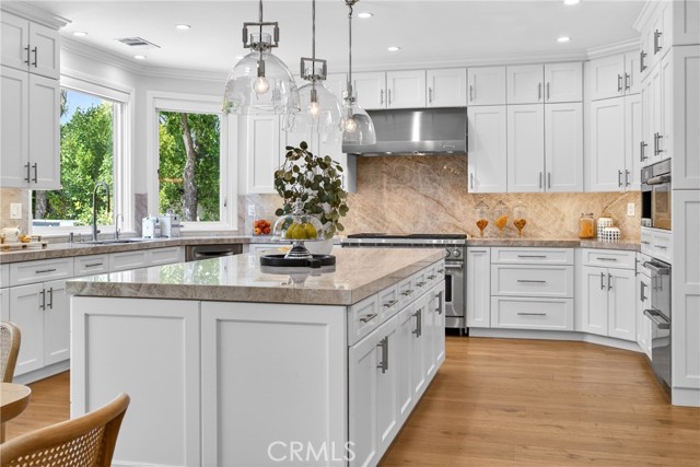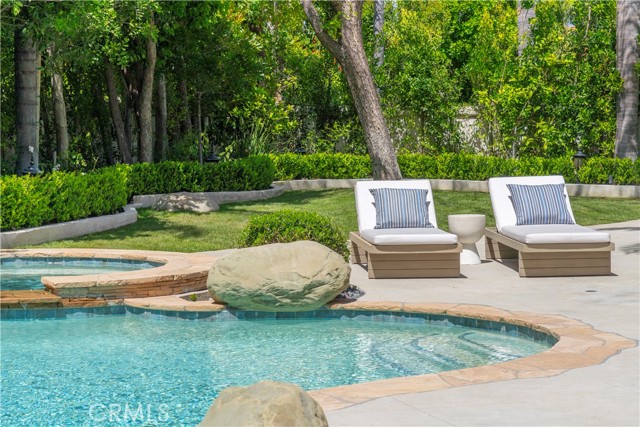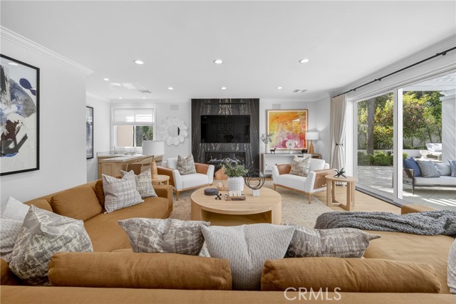 Set on a cul-de-sac within the guard-gated community of Mountain View Estates, this extensively updated Mediterranean has been thoughtfully renovated over the past three years with a focus on quality craftsmanship and elevated design. A custom double-door entry opens to a dramatic foyer with sweeping spiral staircase and wide-plank Bottega Legna Cuero wood floors throughout. All windows and doors have been replaced with premium Milgard, bringing in natural light and a cohesive, finished feel. The kitchen is both striking and well-appointed, featuring Taj Mahal quartzite countertops, custom cabinetry with Blum hardware, and a generous center island. Top-tier appliances include a Wolf range with griddle and hood, Sub-Zero refrigerator and freezer, Bosch dishwasher, built-in Miele coffee system, and additional Sub-Zero drawer refrigeration. RH Machinist pendants and custom window treatments complete the space. Main living areas are anchored by statement fireplaces and designer lighting, including an RH Helix chandelier. The living room features a 50" Vector natural gas fireplace with remote, while the family room centers around a 54" Pro Builder Deluxe fireplace with custom stonework. A Milgard aluminum pocketing sliding door fully opens to the backyard, creating seamless indoor-outdoor flow. A mounted LG 77" ultra-thin TV with Sonos sound is included on a custom stone feature wall. Upstairs, the primary suite offers a sitting area, fireplace, and two walk-in closets. The bath is fully remodeled with dual showers, an Alamo thermal soaking tub known for heat retention, Moen fixtures, and Italian porcelain tile. Secondary baths feature Italian porcelain tile, Kohler fixtures, backlit anti-fog mirrors, and bidet-equipped toilets. The backyard is designed for both everyday use and entertaining, with a pool and spa featuring a Pentair smart system, outdoor kitchen with Hestan BBQ, refrigeration and prep space, outdoor shower, and multiple dining and lounge areas. Landscaping, drainage, and lighting have been redone to enhance privacy and usability. Major upgrades include multi-zone Lennox HVAC with new ducting, Noritz tankless water heater, Nest thermostats, Sonos sound, and whole-home mesh Wi-Fi. Located within the acclaimed Las Virgenes School District and just minutes from Calabasas shopping, dining, and the Malibu coastlineāan exceptional offering in a highly sought-after community.
