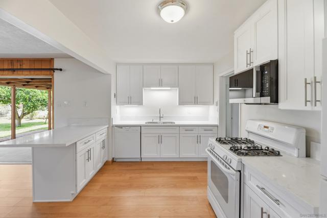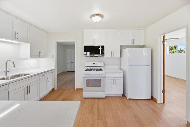 Beautifully remodeled single story home in the Bay Vista neighborhood of west Chula Vista! This well appointed 3 bedroom 2 bathroom home features BRAND NEW: Quartz counters, white wood shaker cabinets, luxury vinyl plank flooring, carpeting, appliances, ceiling fans, lighting and more! The roof was replaced on the home and on the oversized detached 2 car garage in 2021. New plumbing and newer dual pane windows. Large covered patio overlooking a large fenced yard with fruit trees! The spacious driveway offers potential RV parking Conveniently located near freeway access and less than a mile from the new resort and convention center.