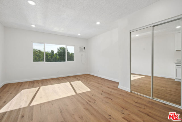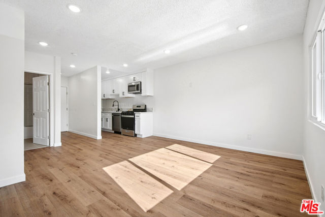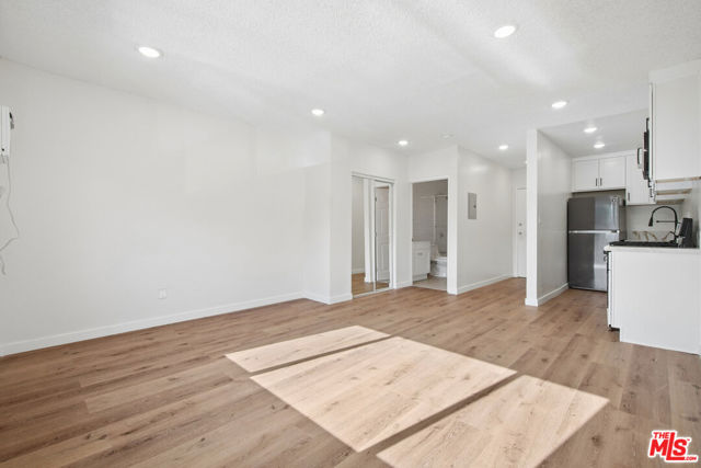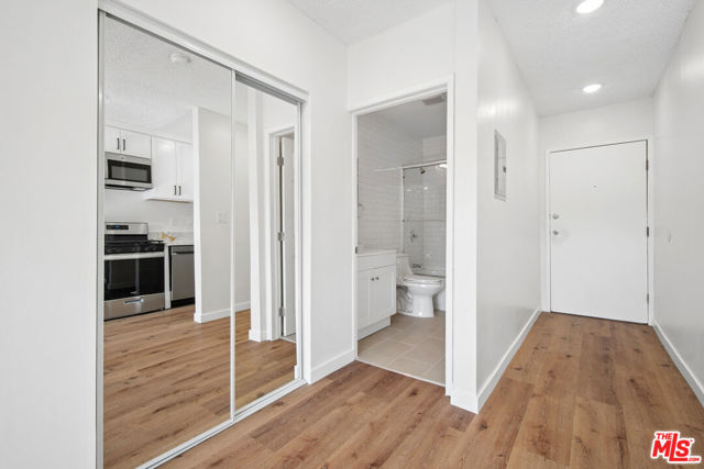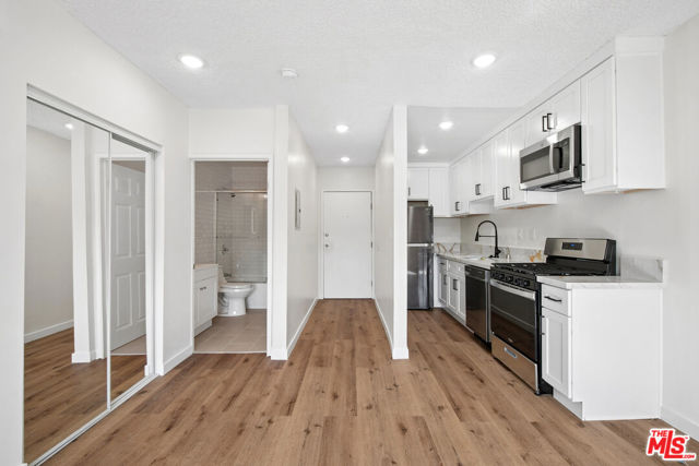 Renovated studio in the Hollywood area featuring a bright open layout, wood-style flooring, recessed lighting, and a modern kitchen with stainless steel appliances and stone-style countertops. Updated bathroom includes subway tile, contemporary vanity, and tub-shower combo with glass enclosure. Mirrored closet doors provide in-unit storage. Wall A/C included. One assigned parking space and on-site laundry. Pets allowed subject to owner approval. Tenant pays electric and gas. Water and trash are included. Conveniently located near Hollywood Boulevard, Sunset Boulevard, Trader Joe's, dining, entertainment, and major city attractions. Square footage is approximate and not verified.