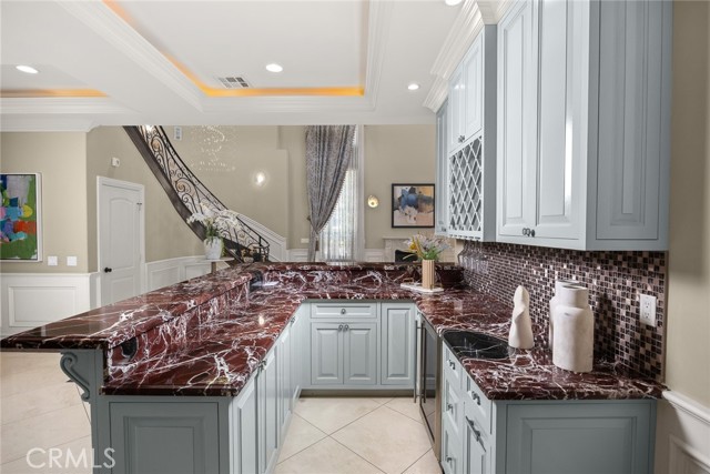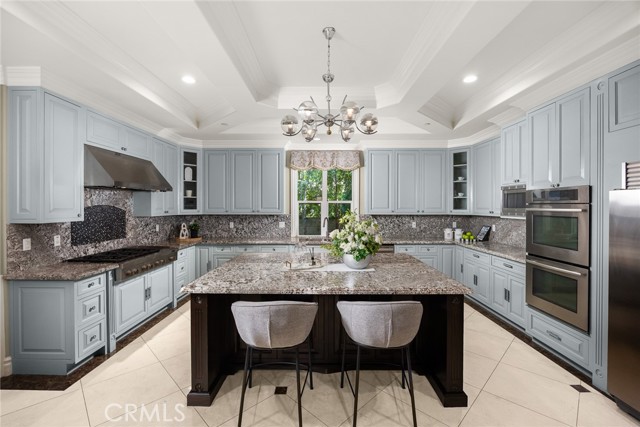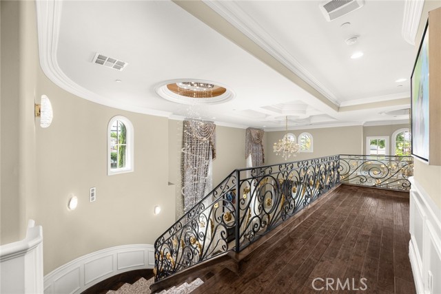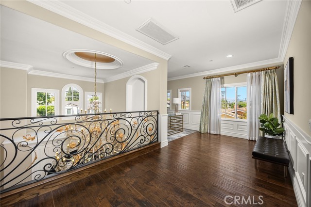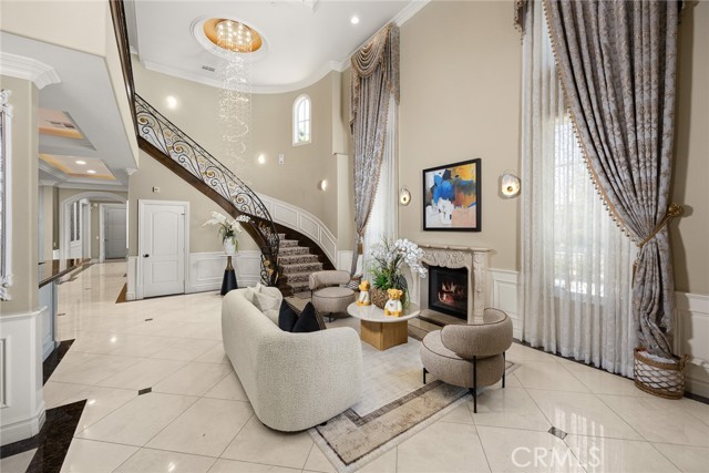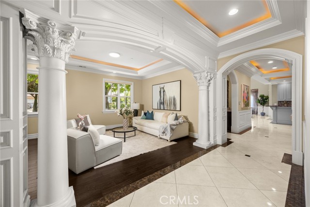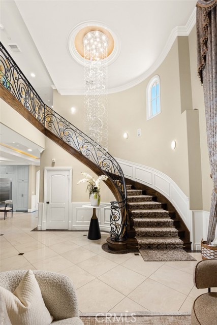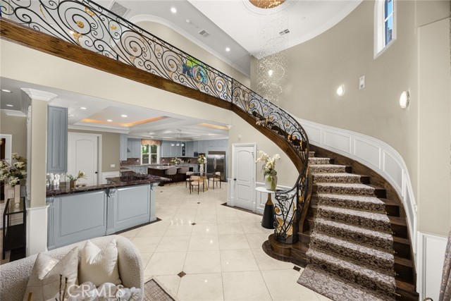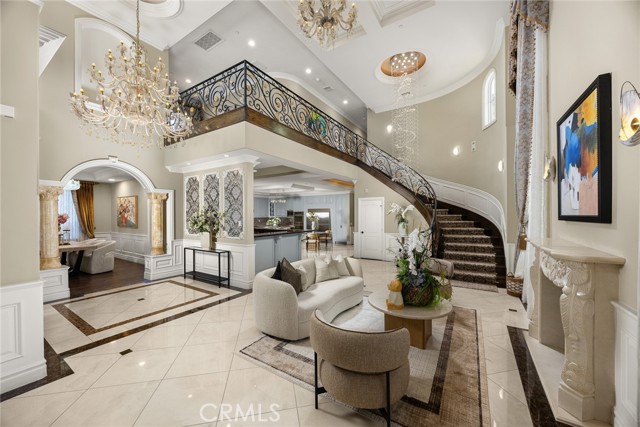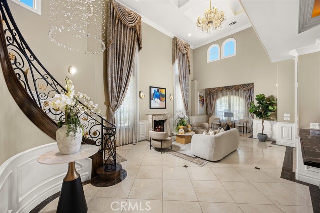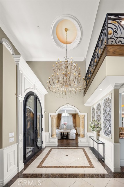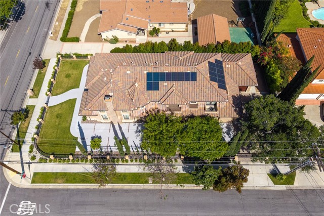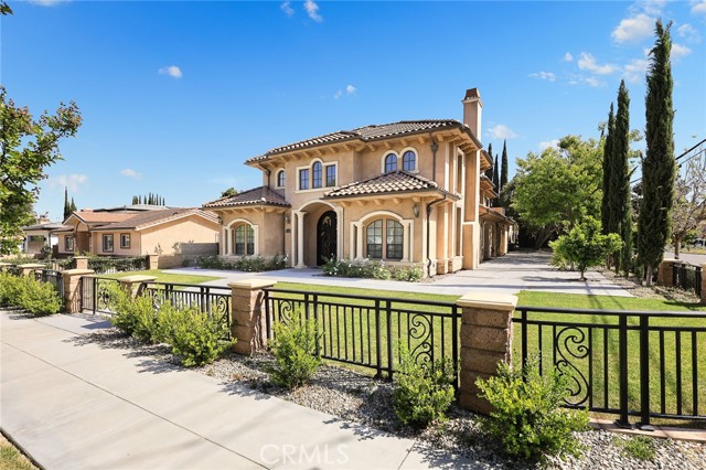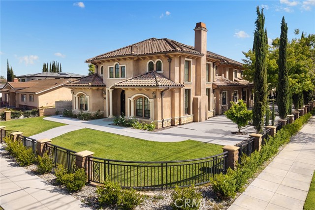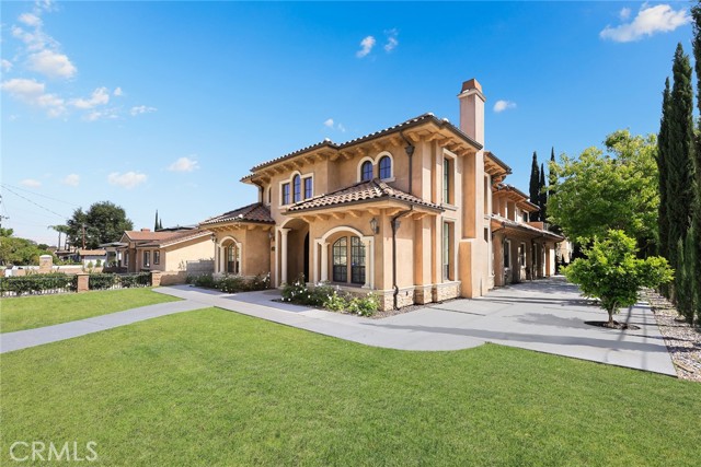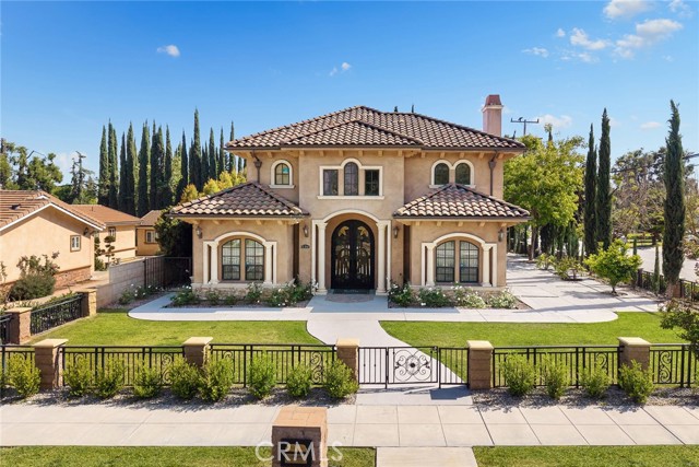 Elegant Mediterranean-style residence located in the highly desirable Baldwin Stocker district of Arcadia, offering 5 bedrooms, 5 bathrooms, and approximately 5,000 SF of living space. Built in 2016, this custom home features a dramatic 25-foot ceiling entry with a 10-foot arched iron and glass double door. The bright living room includes a stone fireplace and soaring windows, while the formal dining room is enhanced by onyx Roman columns and an expansive bar area. The gourmet kitchen offers a center island, abundant cabinetry, a dedicated wok kitchen, additional refrigerator space, and a breakfast nook. The spacious family room is ideal for entertaining or everyday living. The main-level primary suite features a walk-in closet, dual vanities, soaking tub, and oversized shower. Upstairs includes a second primary en-suite with private balcony, an open office area, and additional bedrooms with a Jack-and-Jill bathroom.Additional highlights include solar panels, attached 2-car garage with direct access, an additional 1-car garage, and gated driveway. Low-maintenance backyard and side yard provide comfortable outdoor space. Conveniently located near award-winning Arcadia schools, supermarkets, dining, and shopping. A rare opportunity to own a newer custom home in one of Arcadia’s most sought-after neighborhoods.