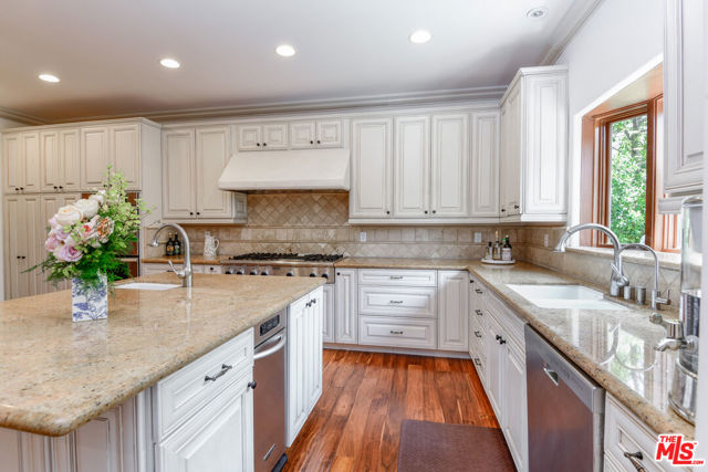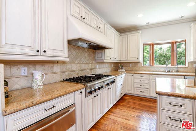 Lovely Mediterranean home built in 2007 situated in the sought-after lower Marquez Knoll neighborhood with a fantastic open floor plan concept. Over 3800 Sq Ft of living space, the home has a warm and inviting atmosphere created by natural light and beautiful wood floors throughout as you step in, and features 6 bedrooms & 6 Bathrooms. Main level comprises of living room w/ fireplace, formal dining room, and expansive family room w/ fireplace off the kitchen. The gourmet kitchen w/ built-in SS appliances, center island, wine fridge, and breakfast area is adjacent to both the dining room & family room that opens to a lush backyard. One en-suite bedroom completes the main level. The 2nd floor features a master suite w/ a peek-a-boo ocean view and a secluded rooftop deck, 3 en-suite bedrooms, and one additional bedroom that can be used as an office; 5 bedrooms w/a walk-in closet. Water softener throughout the house. Just moments from the esteemed Marquez Elementary, Pali Charter High School, Caruso Palisades Village, Marquez Center, and the Beach.