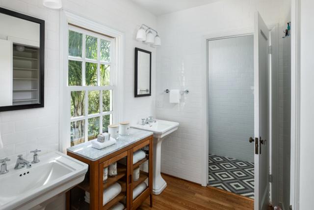 Set on a charming tree-lined street in the desirable South Gate neighborhood, this elegant Tudor blends timeless character with inviting indoor-outdoor living. Surrounded by mature landscapingincluding striking palm and olive treesthe property welcomes you with a covered front porch and expansive patio with a fire table, while the side yard features a putting green, and the rear offers a deck for al fresco dining. Inside, a formal entry leads to a stunning LR w/ soaring vaulted ceilings, a FP, and abundant natural light. A bright formal DR opens to the front patio, and the handsome eat-in kit boasts SS appliances and a charming breakfast nook w/ bay window. The main level also includes a stylish powder & laundry rm, and a lovely family rm with French doors opening to the rear patio. Upstairs, the serene primary suite enjoys leafy green views, a beautifully appointed bathroom with dual sinks and a glass-enclosed shower, and a walk-in closet, while two add'l bedrooms share a hall bath. A third-floor finished attic with vaulted ceilings provides flexible living space, complemented by a partial basement for extra storage. Completing the property is refinished hardwood floors, fresh interior paint throughout, a detached 2-car garage/flex space, and outstanding public schools.