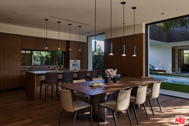 The Enso House blends Japanese-inspired design with modern luxury, built around a philosophy of simplicity, flow, and intentional living. At its center, a 75-year-old carob tree anchors the home within a private interior courtyard - creating a rare sense of calm and connection throughout. This brand-new residence offers six bedrooms and six bathrooms across approximately 4210 square feet in the highly sought-after Carlson Park neighborhood, known for its charm, history, and strong community feel. Designed for privacy and indoor-outdoor living, the home features inward-facing courtyards, balconies, and patios that create serene outdoor moments while keeping the property completely shielded from the street and neighbors. The main living space opens with a dramatic 25-foot sliding pocket door, seamlessly connecting to the courtyard and guesthouse beyond. The kitchen is fully equipped with built-in Miele appliances, including a gas cooktop with a dedicated wok burner, dual convection ovens, and a steam oven. Travertine countertops, a large island with breakfast bar, and abundant natural light complete the space. The main level also includes an office with a full wet bar and dual-zone wine refrigerator, plus a nearby powder room. Upstairs, the primary suite offers a retreat with a private outdoor atrium and its own sitting area. A bridge and outdoor deck connects the primary suite to the home gym. Below the bridge is a swimming pool with an oversized spa. Opposite the pool, the guesthouse living room and kitchen provide additional entertaining space with direct access to a private suite upstairs. Additional features include an 8-zone audio system, 5-zone HVAC, a gated driveway, and parking for four cars. A spacious rooftop deck captures sweeping views of the San Gabriel and Santa Monica Mountains -ideal for sunset gatherings.Located in the center of Los Angeles and just minutes from Downtown Culver City, Sony Pictures Studios, Amazon and Apple's LA offices, and the best of the Westside. Within the Culver City Unified School District. Available furnished.