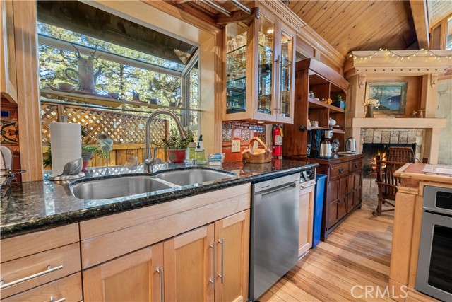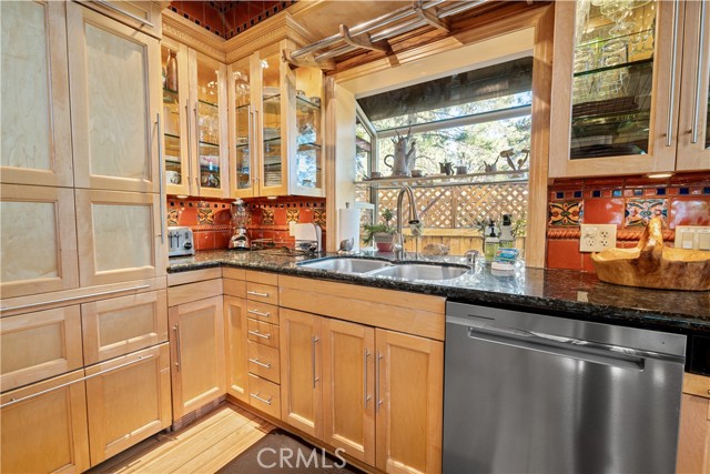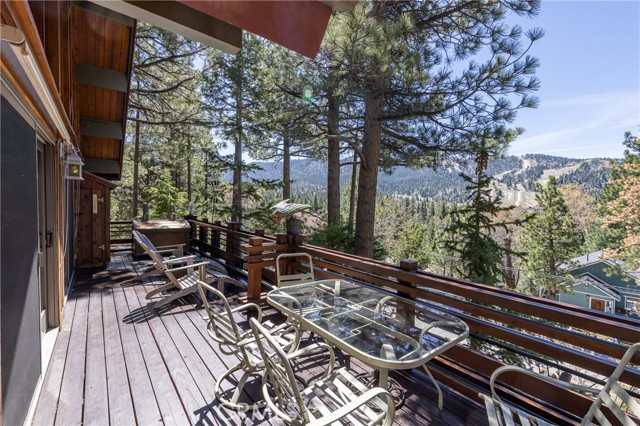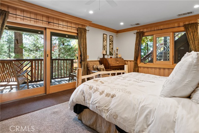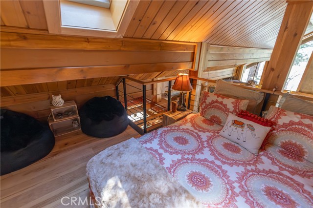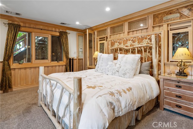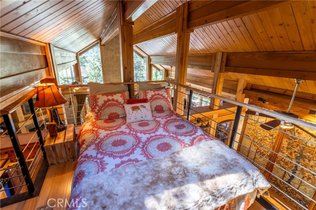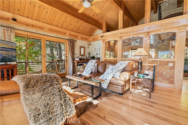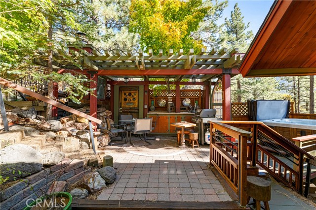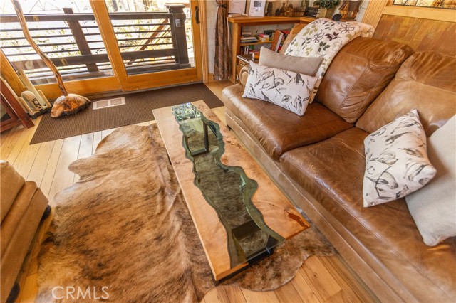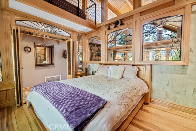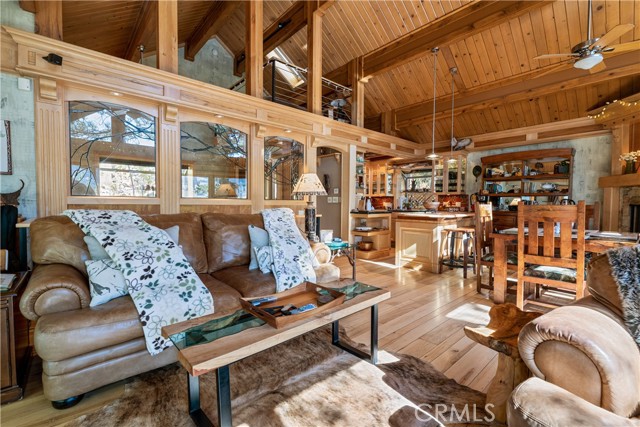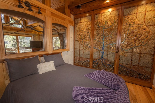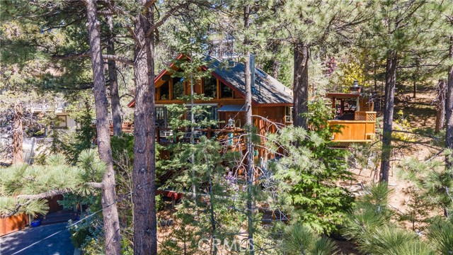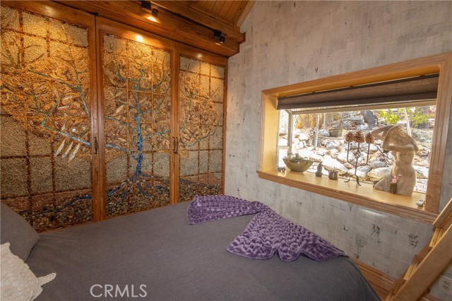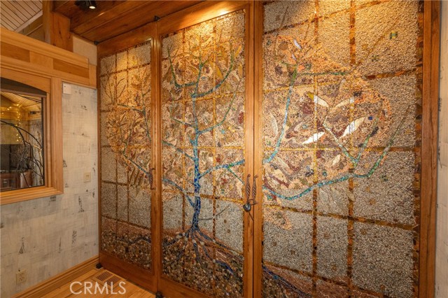 Perched among the trees in sought-after Moonridge, this one-of-a-kind “Tree of Life” retreat is far more than a cabin—it’s an enchanted artistic and writer’s retreat, a living work of art. This 2-bedroom with a loft, 2-bath artisan-crafted home offers a rare blend of architectural beauty, natural surroundings, and unforgettable views of the lake and ski slopes, all just minutes from Bear Mountain. Originally handcrafted over a decade by a master craftsman as a tribute to his wife, every inch of this home tells a story. Custom woodwork, intricate glass details, and curated artistic elements are thoughtfully woven throughout, highlighted by the stunning “Tree of Life” mosaic—an irreplaceable centerpiece that defines the home’s character. The open-concept living space is warm and inviting, designed to bring the outdoors in with expansive windows framing treetop vistas. A custom kitchen features high-end appliances, unique finishes, and a handcrafted island, flowing seamlessly into the dining and living areas—perfect for entertaining, quiet mountain evenings, or creative inspiration. The main-level “Tree of Life” suite serves as a romantic and artistic sanctuary, ideal for reflection, writing, or peaceful escape. It features a cozy queen bed and one of the home’s most breathtaking focal points. This room showcases extraordinary custom leaded glasswork and three handcrafted cedar closet doors, each weighing approximately 200 pounds and adorned with an intricate mosaic of crushed stone, glass, and tile. Taking over a year to complete, this remarkable installation stands as a true testament to craftsmanship, artistry, and devotion. Step outside to find a private, serene setting complete with a landscaped garden, tranquil waterfall, gazebo, and spa—creating a truly enchanted retreat atmosphere surrounded by nature, perfect for artists, writers, or anyone seeking inspiration and escape. Homes of this caliber and character rarely come to market. When they do, they command attention and often sell well above typical market comparisons due to their irreplaceable design and craftsmanship. There truly is nothing else like it in Big Bear. Whether you’re looking for a personal escape, a luxury short-term rental, or a standout investment, this property offers an opportunity that simply cannot be replicated. Don’t miss your chance to own one of Big Bear’s most iconic and unforgettable homes.