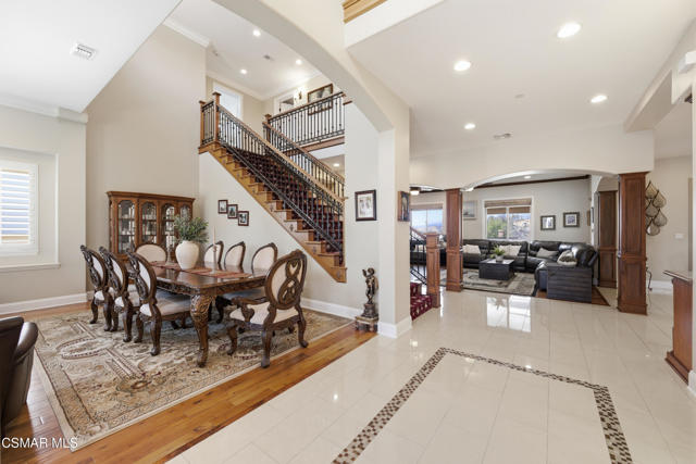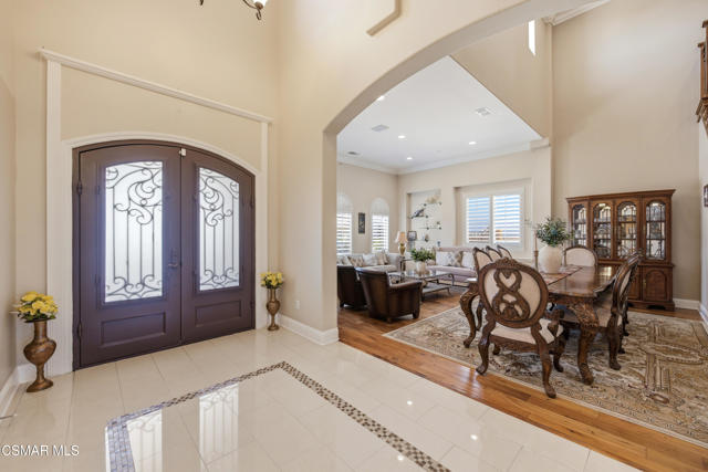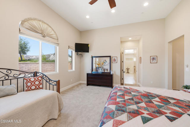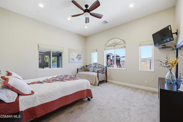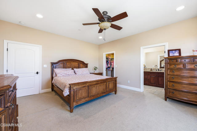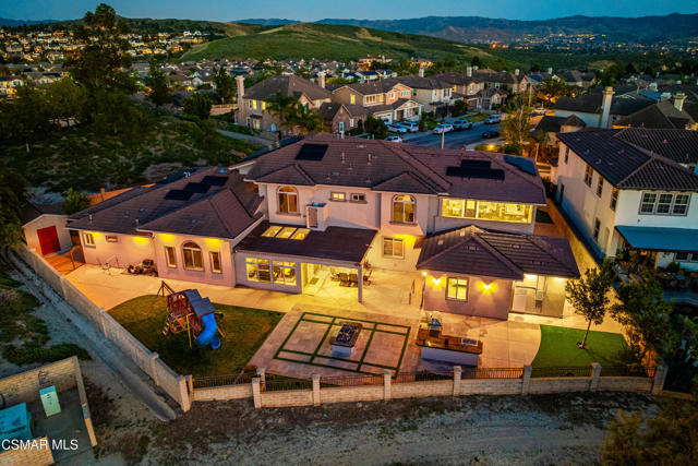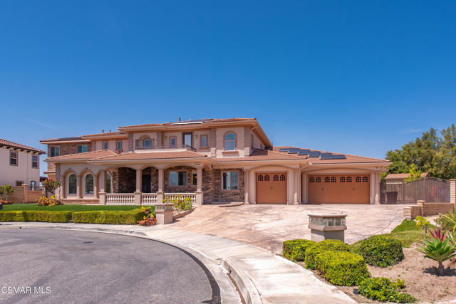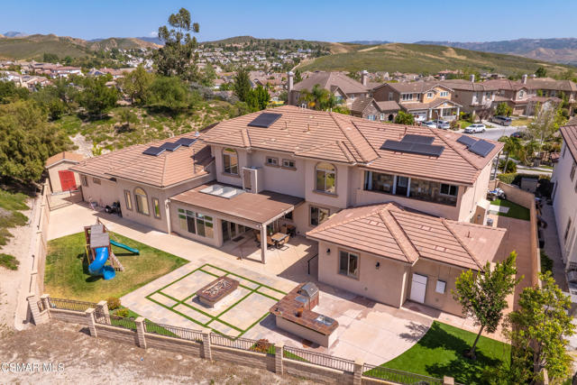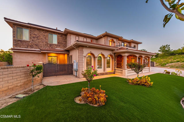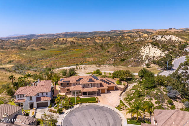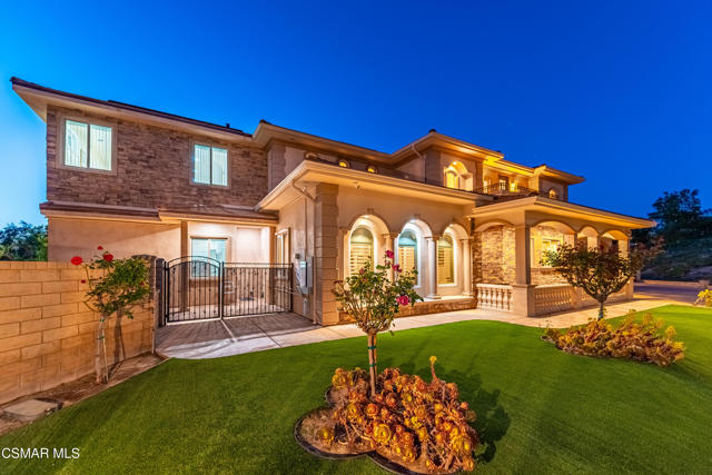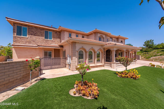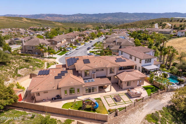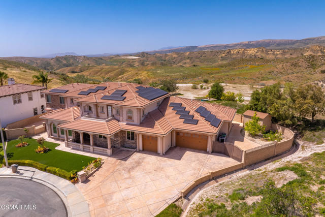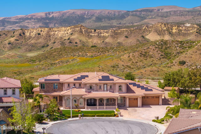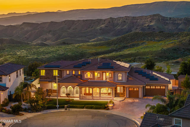 Custom Estate in Big Sky offers nearly 7,000 SF of living space, including 6 bedrooms + office, 6 bathrooms, and a private ADU. Ideally located at the end of a cul-de-sac with unobstructed mountain views!! A rare multi-generational opportunity, this home features a downstairs primary suite, a guest bedroom with adjacent full bath and private entrance, plus a fully equipped guest house. The main residence spans 5,994 SF, complemented by a 998 SF guest house with 1 Bed and 1 Bath. A grand entry welcomes you with custom double glass doors, porcelain tile, engineered hardwood flooring, and a wood and iron staircase. Architectural details include columns, crown molding, and a built-in entertainment center. Formal living and dining rooms with plantation shutters flow seamlessly into the family room and secondary dining area, all enhanced by scenic views. Let's not forget about the 330 SF sunroom with wall-to-wall windows and skylights adding additional flexible living space. The chef's kitchen is designed for both function and entertaining, featuring a large island, granite countertops, stainless steel appliances, double ovens, a swing door, and a walk-in pantry with glass door. The main level includes 2 bedrooms, an office, and 2.5 baths, including the primary suite with backyard views, dual walk-in closets, dual vanities, and a large stone-tiled shower with bench. All bathrooms in the main home are upgraded with granite countertops, wood vanities, and custom tile work. Upstairs offers 4 additional bedrooms, 3 full bathrooms, a loft, and 2 balconies. Highlights include a large bonus room/bedroom with balcony access, two en-suite bedrooms with mountain views (one with balcony), and an additional bedroom with a nearby hall bath. A walkable, drywalled attic with built-in storage and attic fans adds valuable storage space. Built in 2022 The private guest house (ADU) is situated in its own wing and designed for comfort and accessibility, featuring wide entryways, engineered hardwood floors, Milgard windows, a fireplace, full kitchen with quartz countertops and shaker cabinetry, living and dining areas, a full-size laundry, and a primary suite with walk-in closet and spa-like bath. Multiple access points include a private exterior entrance, backyard access, and interior connection to the main home, with potential to add a staircase to the upstairs bonus room. The outdoor space offers a tranquil, private setting with mountain views, built-in BBQ, firepit, artificial turf, drought-tolerant landscaping, a grassy area, lemon, lime, and orange trees on a drip system. Built with quality and durability in mind, features include wide/deep footings, thick slab, steel beams and posts, Milgard windows with wood casings, 8-foot doors, crown molding, and recessed lighting throughout. Additional upgrades include a fully paid 17kW Tesla solar system (2023), 3 tankless water heaters, 3 HVAC systems, security cameras, and exterior lighting. Additional amenities include a 3-car garage, RV access with side shed, and a large driveway. The Big Sky community offers access to parks, hiking and biking trails, a nearby dog park, and convenient proximity to shopping, dining, hospitals, and the 118 and 23 freeways.