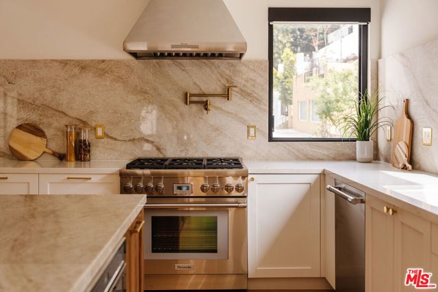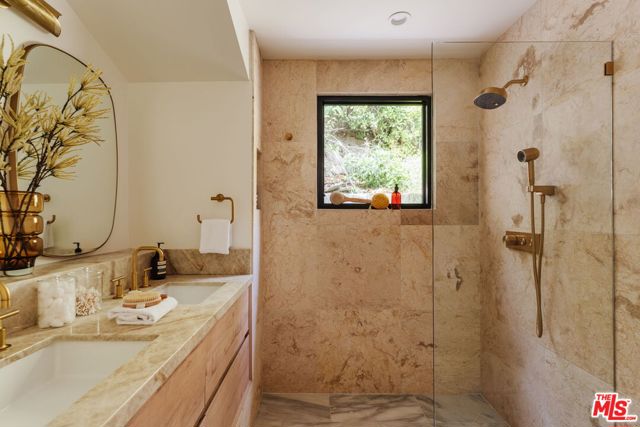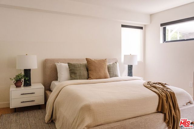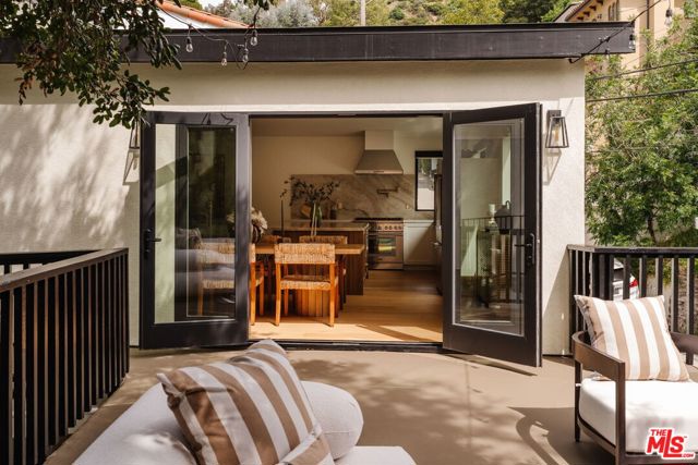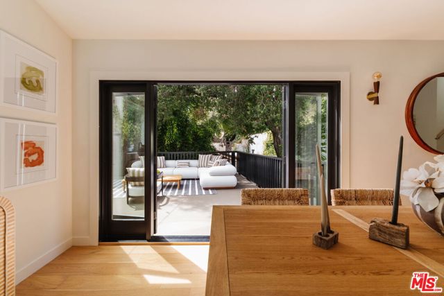 This designer built 3 bedroom, 3 bath contemporary home is tucked away in the coveted Beverly Hills Post Office, offering privacy, thoughtful design, and modern functionality. Fully remodeled down to the studs, the home features a seamless open layout where the chef's kitchen, complete with Thermador appliances and Brazilian quartzite countertops, flows effortlessly into the living space and out to an inviting deck, ideal for indoor outdoor living. Bathrooms are finished with Italian marble and refined brass fixtures, while the primary suite offers abundant natural light and a spa like bath with a tranquil outdoor outlook. Two additional bedrooms include a well appointed guest room and a separate lower level suite with a private entrance and ensuite bath, offering flexibility for guests, a studio, or workspace. Surrounded by canyon greenery, the outdoor spaces include multiple areas for dining and lounging, creating a quiet retreat just minutes from Beverly Hills, the Beverly Hills Hotel, and Rodeo Drive. Additional features include a two car garage and rare off street parking.
