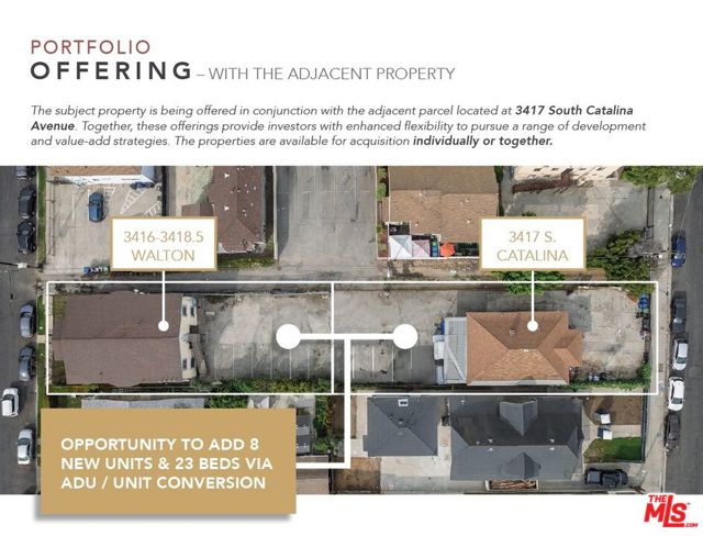 We are pleased to offer for sale a 4-unit, 13-Bedroom student housing community located at 3416-3418.5 Walton Avenue, Los Angeles, CA 90007. The property is situated south of Jefferson Boulevard and west of Vermont Avenue, within the USC Patrol Zone.The property is just 0.4 miles from the USC campus, giving students easy walking or biking access to classes, libraries, and campus amenities. The surrounding neighborhood offers a walkable mix of cafs, restaurants, and everyday conveniences that cater to student life. Residents also benefit from proximity to the Los Angeles Memorial Coliseum, Exposition Park, and strong public transit connections including the I-10 and I-110 Freeways for easy access to Downtown Los Angeles and the broader metro area.Situated on a 5,720-square-foot LARD2-zoned lot, the property presents a significant value-add opportunity for investors. The buyer can potentially add three 4-Bedroom/4-Bathroom ADUs and one 2-Bedroom/2-Bathroom ADU, transforming the asset into an 8-unit, 27-bed USC student housing community.3416-3418.5 Walton Avenue presents investors with an opportunity to acquire and expand a well-positioned USC student housing community within the sought-after USC Patrol Zone.PLEASE DO NOT WALK THE PROPERTY OR DISRUPT TENANTS. CONTACT LISTING TEAM FOR DETAILS.The subject property is being offered in conjunction with the adjacent parcel located at 3417 South Catalina Avenue. Together, these offerings provide investors with enhanced flexibility to pursue a range of development and value-add strategies. The properties are available for acquisition individually or together.