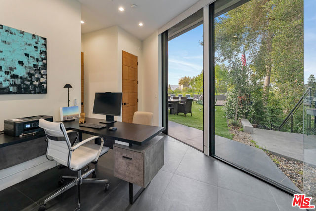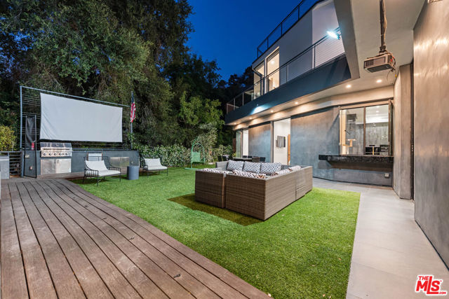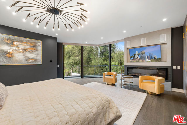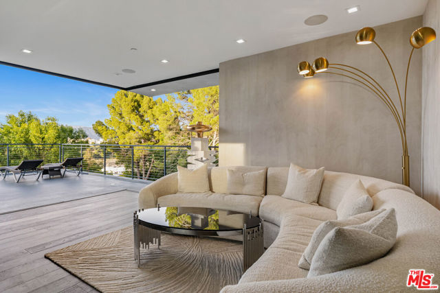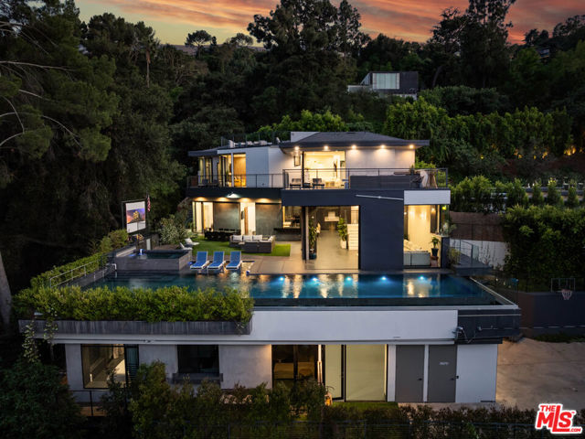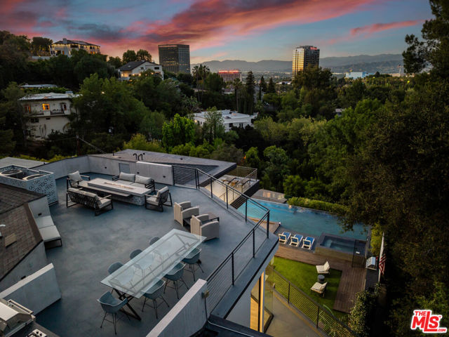 A spectacular gated compound retreat situated on a quiet cul-de-sac above the prestigious Hollywood Hills, the "Skyline Estate" is a newly constructed 6-bedroom, 7-bath designer residence by Alon Zakoot, offering approximately 5,700 square feet of cool, modern design with refined European finishes. A long private driveway leads to this stunning entertainer's estate which boasts sweeping panoramic views spanning the city skyline, mountains, and iconic landmarks including Universal Studios with its Harry Potter castle and the Hollywood Sign. A dramatic double-height entry introduces the home, flowing into expansive open-concept living spaces designed for seamless indoor-outdoor living. The living room is defined by a striking seamless corner of retractable glass doors, opening completely to frame sweeping views and connect directly to the impressive infinity-edge pool. The chef's kitchen is appointed with premium Dacor appliances, a waterfall island, wine refrigeration, and a built-in Miele espresso system, complemented by custom cabinetry and imported Moroccan lighting. Select Venetian plaster walls add subtle texture and depth throughout the interiors. The upper level is anchored by the primary suite, featuring dual walk-in closets plus an additional third closet, a wraparound private balcony, and a spa-inspired bath with dual vanities, a spacious jetted tub, rain shower, and an indoor-outdoor shower. Two additional bedroom suites offer sliding walls of retractable glass that open to a patio with outdoor lounge seating. An upstairs family room with a generous terrace and fire pit provides an ideal setting for taking in sweeping city views or catching some fireworks from Universal Studios. Outdoor spaces are designed for both scale and comfort, highlighted by a 65-foot infinity-edge pool with Baja shelf seating, an oversized spa, multiple lounge areas, and a rooftop deck with outdoor kitchen and fire pit. Additional features include a fully integrated smart home system controlled via iPad, Sonos surround sound, a comprehensive security system with cameras, elevator access, an impressive outdoor entertaining space with built-in projector, a basketball hoop for sport court-style recreation, and multiple terraces. On-site parking for up to 10 cars, along with a separate legal ADU/guest quarters, completes the property. Ideally located just minutes from major studios, hiking trails, and the best of Hollywood, this residence embodies elevated California living.
