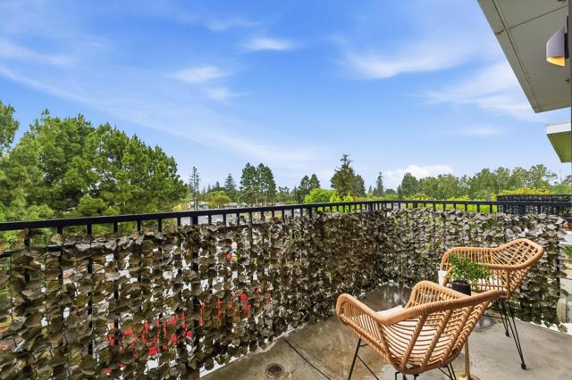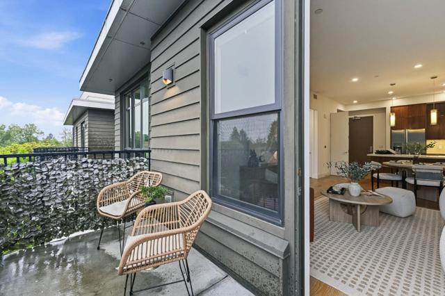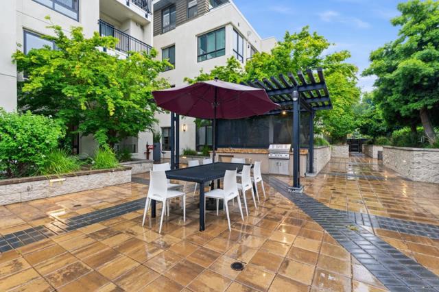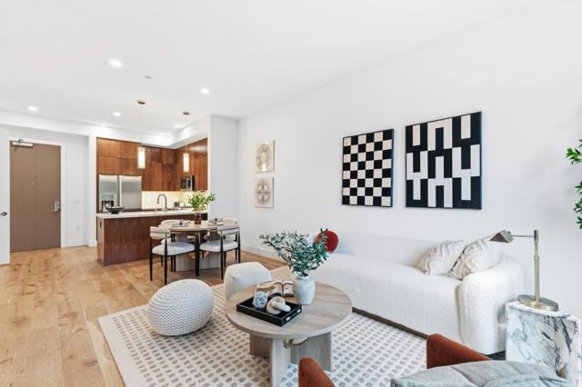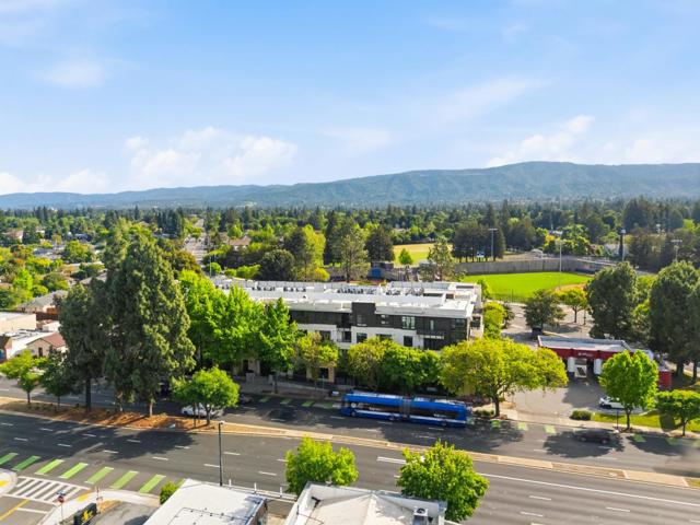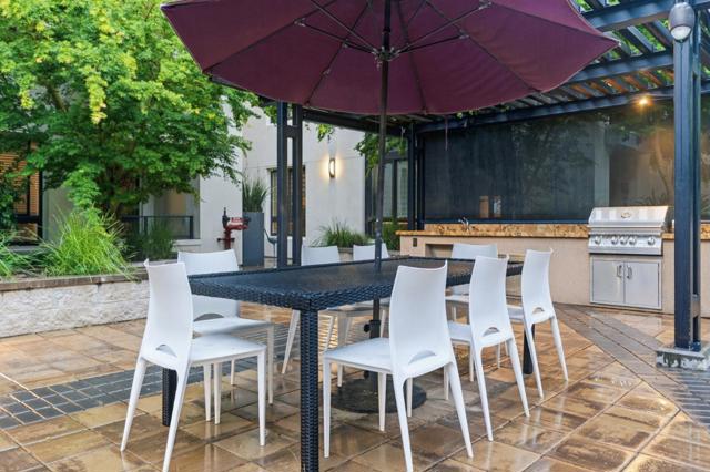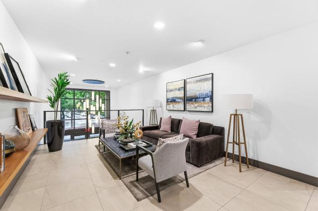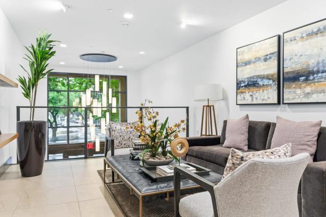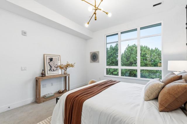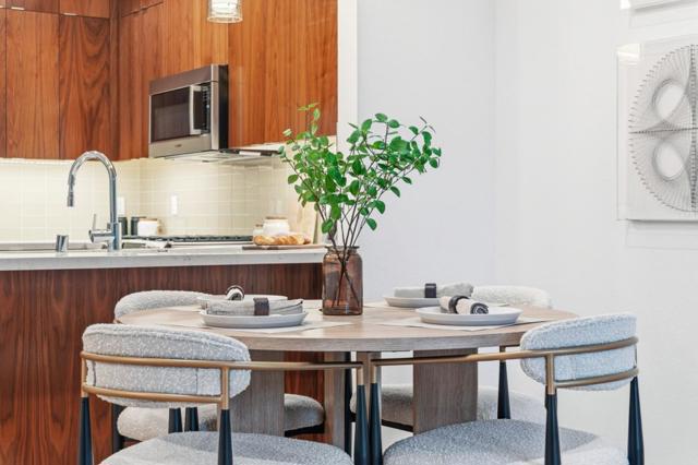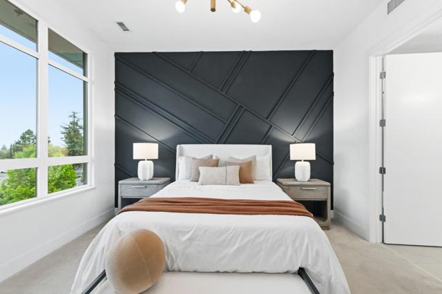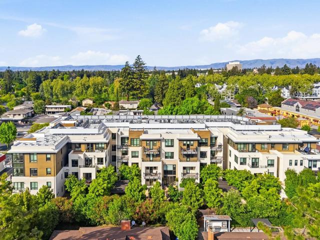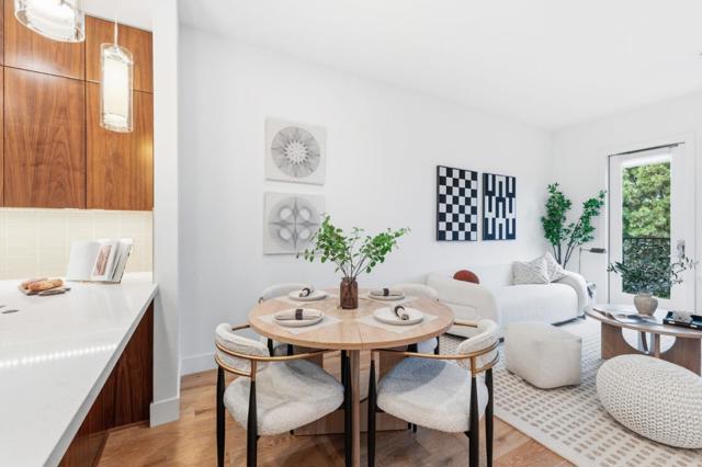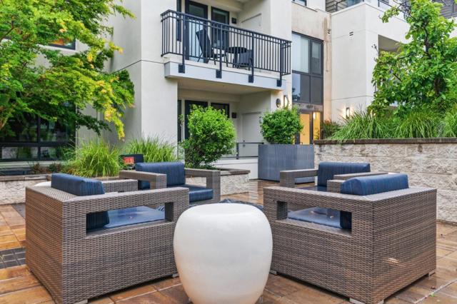 One of the brightest residences in a modern luxury building, ideally located in the heart of Downtown Mountain View, with water included in HOA dues. This stylish home blends contemporary design with warm, upscale finishes, just moments from everything Silicon Valley has to offer. The open-concept layout features a sleek chefs kitchen with stainless steel appliances, rich walnut-toned cabinetry, tiled backsplash, and elegant quartz countertops. The light-filled living and dining area showcases wide-plank hardwood flooring, recessed lighting, and large windows, with direct access to a private terrace for seamless indoor-outdoor living. The spacious bedroom suite offers a spa-inspired en-suite bath and a generous walk-in closet with custom built-ins. A convenient half bath serves guests. Additional highlights include in-unit washer/dryer, abundant storage with two oversized storage spaces, and one assigned parking space in a secured underground garage. Enjoy boutique community amenities including landscaped grounds, BBQ area, fire pit, lounge seating, bike storage, and a dog park. Just steps to downtown shops, dining, transit, parks, and Rose Market.