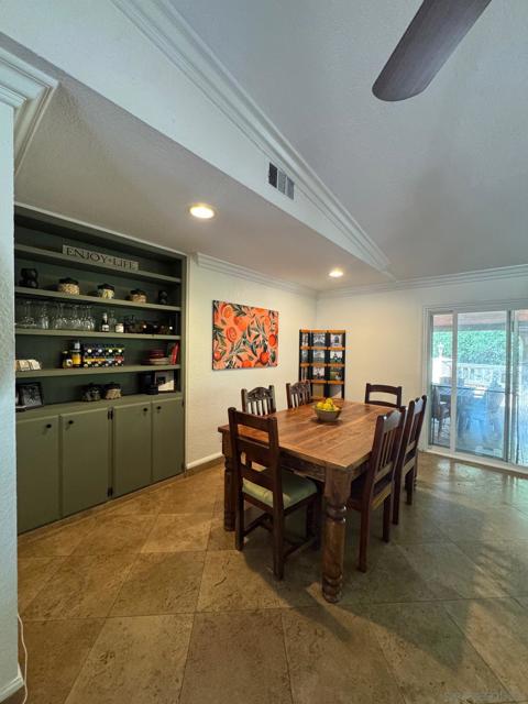 Seller will entertain offers between $749,000 - $779,000. Quiet & sought-after area of Fallbrook featuring a single-family residence with large lot. Home is move in ready with vaulted ceilings in the living room and dining room. Built-in cabinets in dining room and crown molding throughout the house. Cozy kitchen with Granite countertops and bar stool seating. Newer gas stove and dishwasher. Fireplace. Travertine flooring throughout. Mirror closet doors w/custom closet dividers in master bedroom and plenty of closet spaces. Covered patio with beautiful wood slat ceiling for barbecues and family and friend get togethers. 2-car garage with a wrap around driveway. Small office or mancave at backside of garage. Beautiful stamped concrete around front driveway and the main backyard and patio areas. French drains in both front and all of backyard patio areas. Several built in flower/planter boxes for gardening. This home has an extra shared side driveway that flows back down to a lower yard area that has gorgeous brick pavers that lead to lots of built in wood storage bins and a red shed for storage. Great property for an RV with plenty of space out back. Tucked in an urban feel neighborhood with wonderful neighbors and community feel. Close to Fallbrook H. S. A Must See!