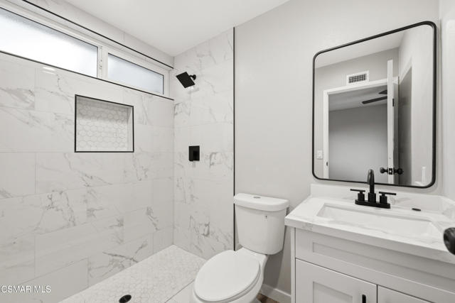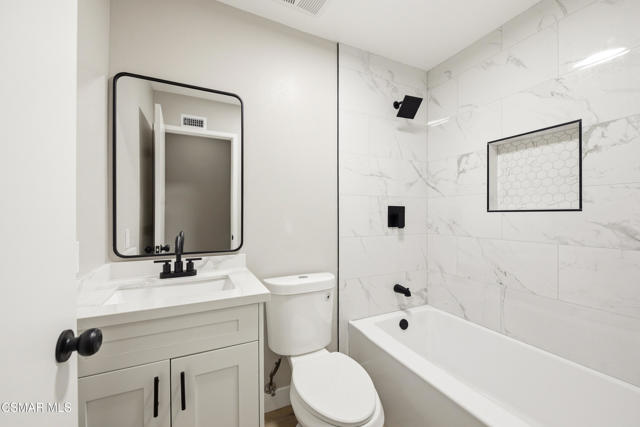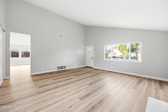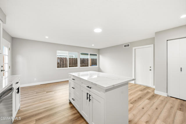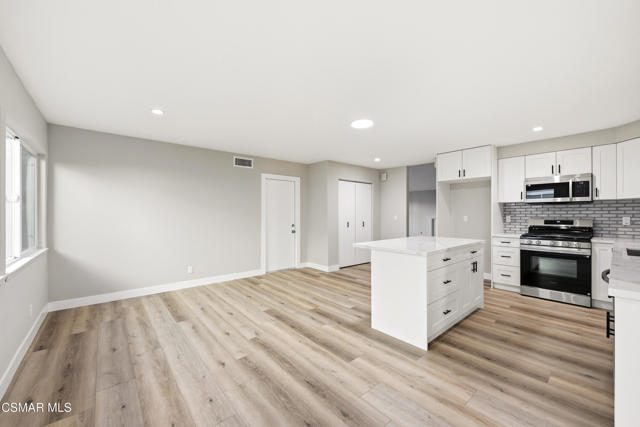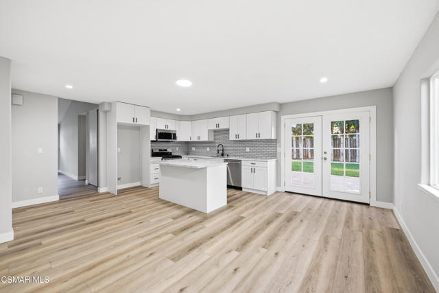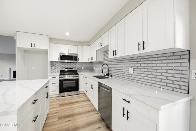Beautifully remodeled 3 bedroom and 2 bathroom home located in the heart of Simi Valley. Featuring a Gourmet kitchen with quartz countertops, center island, tile backsplash, stainless steel appliances. The primary suite offers an updated en-suite bath with quartz counters and tile shower, while the secondary bathroom includes a tub/shower combo with tile finishes and quartz counters. Step outside the French doors to the backyard with a patio area and newer sod. Additional upgrades include a newer AC and paved a driveway, making this home truly move-in ready.