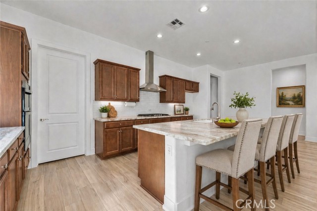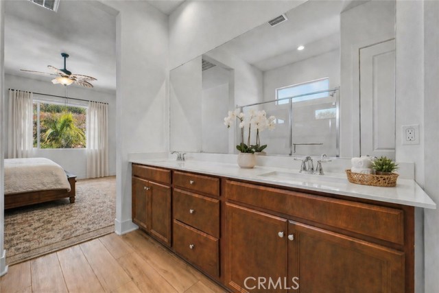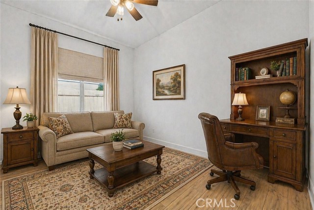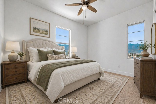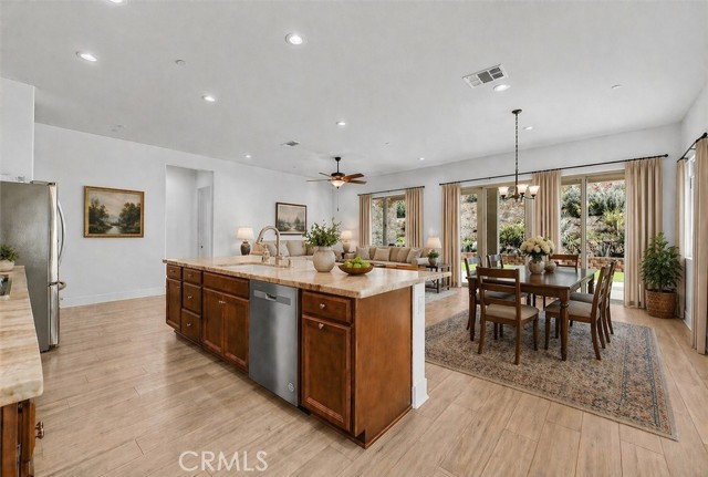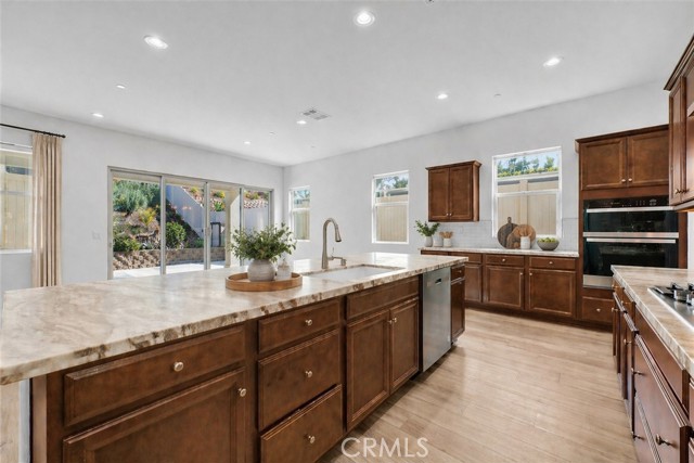 VIEWS, VIEWS, VIEWS. Live like you’re on vacation in this beautifully upgraded home 2 bed, 2 bath, plus den offering 1,902 sq ft on a spacious 9,884 sq ft corner lot with stunning hillside views. OWNED, PAID OFF SOLAR. Located in the highly desirable 55+ Terramor Guard Gate Community, this home features an open floor plan and a designer kitchen with stainless steel appliances, large island, walk-in pantry, and abundant built-in cabinetry. The formal dining area opens to a generously sized backyard with a covered patio—perfect for relaxing or entertaining. The expansive primary suite includes a large walk-in shower, dual sinks, private commode, and an oversized walk-in closet. Additional highlights include luxury vinyl plank flooring throughout main areas, carpeted bedrooms, a versatile third bedroom (permitted as a den), full hall bath, separate laundry room, and a 2-car garage with overhead storage, tankless water heater. Enjoy resort-style living in Terramor, a guard-gated community offering exclusive access to the Terrace Club (1/2 mi. from home) with indoor and outdoor pools, spa, fitness center, sauna, and pickleball and bocce courts. Residents enjoy a vibrant lifestyle with social events, scenic trails, dog parks, gardening club, bar with bartender, pool and poker tables, outdoor grilling areas, and spaces for hosting. Plus, access to the family-friendly Veranda Pool area for visiting family and grandkids. Conveniently located near Tom’s Farms, Glen Ivy Hot Springs, and The Shops at Dos Lagos—this home offers the perfect blend of luxury, comfort, and community. Firewise community, inexpensive homeowners' insurance.